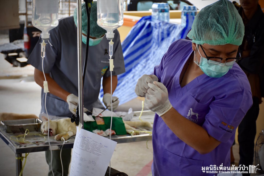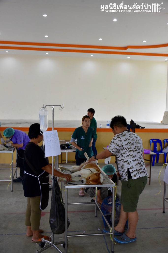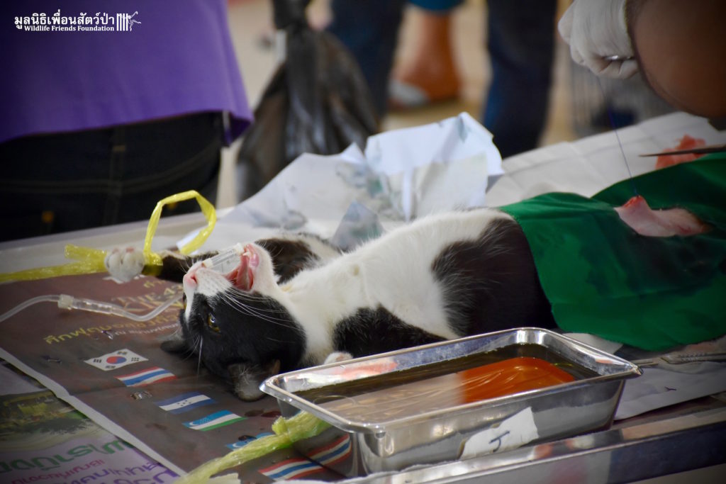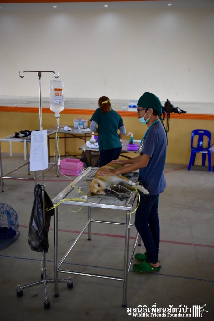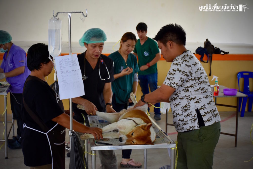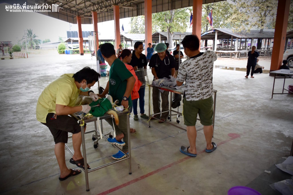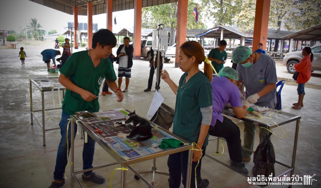 Last week the Wildlife Friends Foundation Thailand collaborated with the Mahanakorn University of Technology Faculty of Veterinary Science on a de-sexing program in the village where the WFFT Wildlife Rescue Centre is located. A team of 11 veterinarians, vet students and assistants joined with the WFFT Vet Team for day of de-sexing, administering rabies vaccinations, and deworming 30 cats and dogs. Mahanakorn University started this self-funded project 5 years ago with the aim of reducing Thailand’s stray animal population, educating the general public and assisting the Thai government with their aim of eradicating rabies from Thailand by 2020. The team has managed to de-sex and vaccinate over 1500 dogs and cats over during the first five years of the project. WFFT fully supports the aims of the project and would like to collaborate further with Mahanakorn University in such schemes.