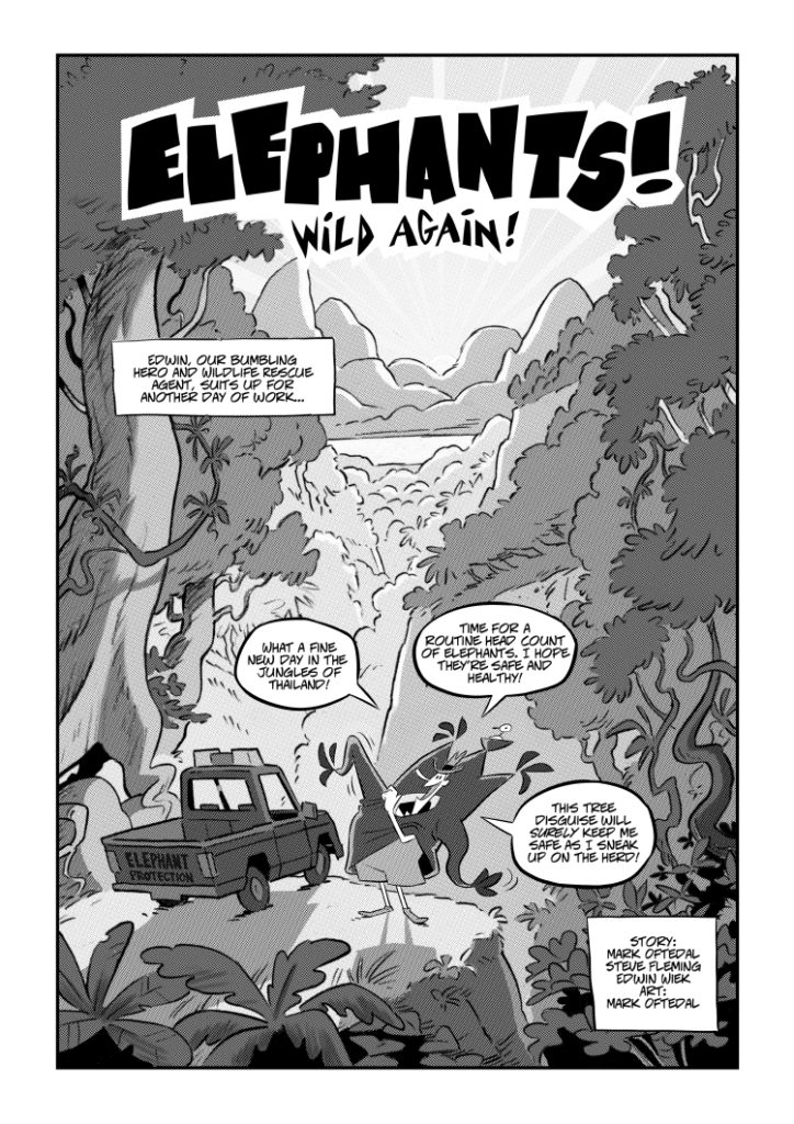 “Hi, my name is Mark Oftedal and I’m a cartoonist with a real passion for wildlife. I’m making a comic book with my longtime friends at the Wildlife Friends Foundation of Thailand. The WFFT is home to 18 elephants, all rescued from the tourist trade. Together we’re making a funny book about the serious issues elephants face in Thailand. The comic is called “Elephants: Wild Again!”. It’s is a story about a young elephant named Maek who is torn from the jungle by poachers and fights against greed and apathy to find his way back home. You can read it as a weekly webcomic here: www.elephantscomic.com