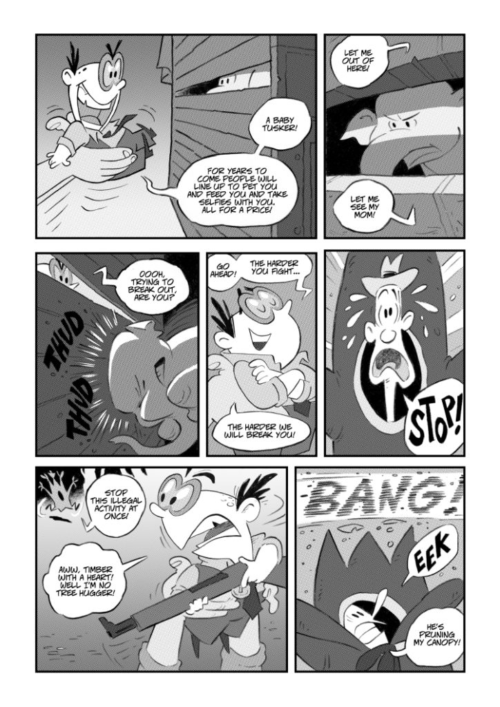 I’ve been drawing it as fast as I can, but I need some help to finish it. That’s where Patreon comes in. Patreon is a way for people to support projects they like on a monthly basis. With your support I can pay other artists to help color the book and get it done faster. If you want to chip in, you can pledge a small amount that will be billed at the end of each month. In return you’ll get some little perks from me, not to mention the satisfaction that comes with raising awareness of the problems elephants face in the modern world.