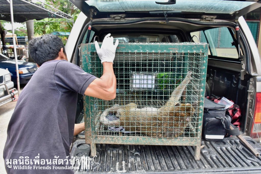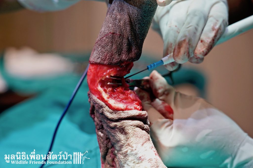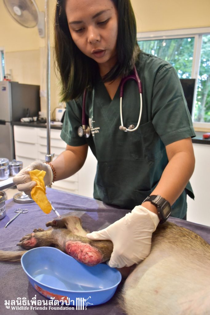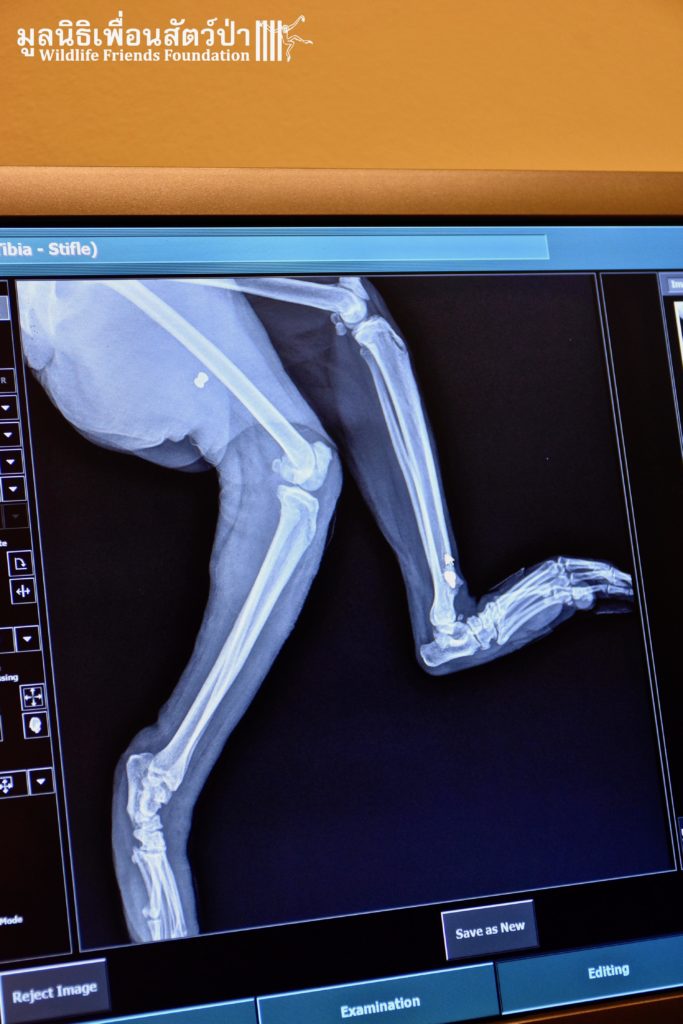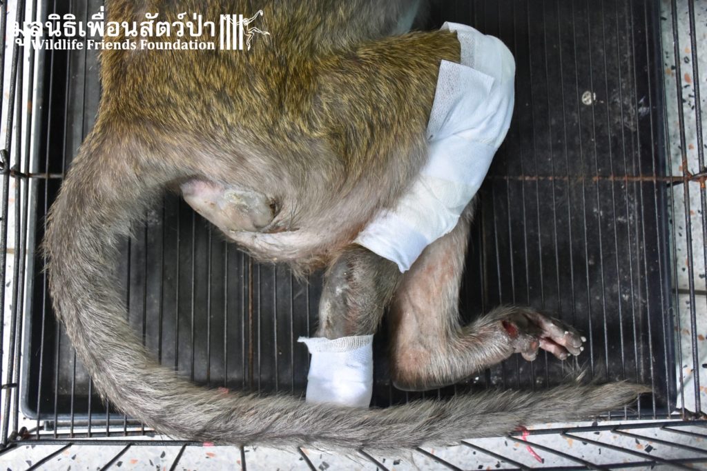 Our second amputation of the day was of another long-tailed macaque, Bucky, who first came to us several months ago after falling out of a tree. He belongs to an urban macaque troop that is fed by a local community in Bangkok. They trapped and brought him to WFFT after noticing he had stopped using his arm. Once again, no breaks or dislocations were found in his radiographs but a fresh bullet wound was discovered in his disabled arm. It was removed and he was returned to his troop. However, he was brought back to WFFT this week because he still wasn’t using his arm. To avoid future risks of injury and sepsis, this arm was amputated after Auan’s leg amputation. After his recovery he will be returned to his troop in Bang Khun Thian, Bangkok.