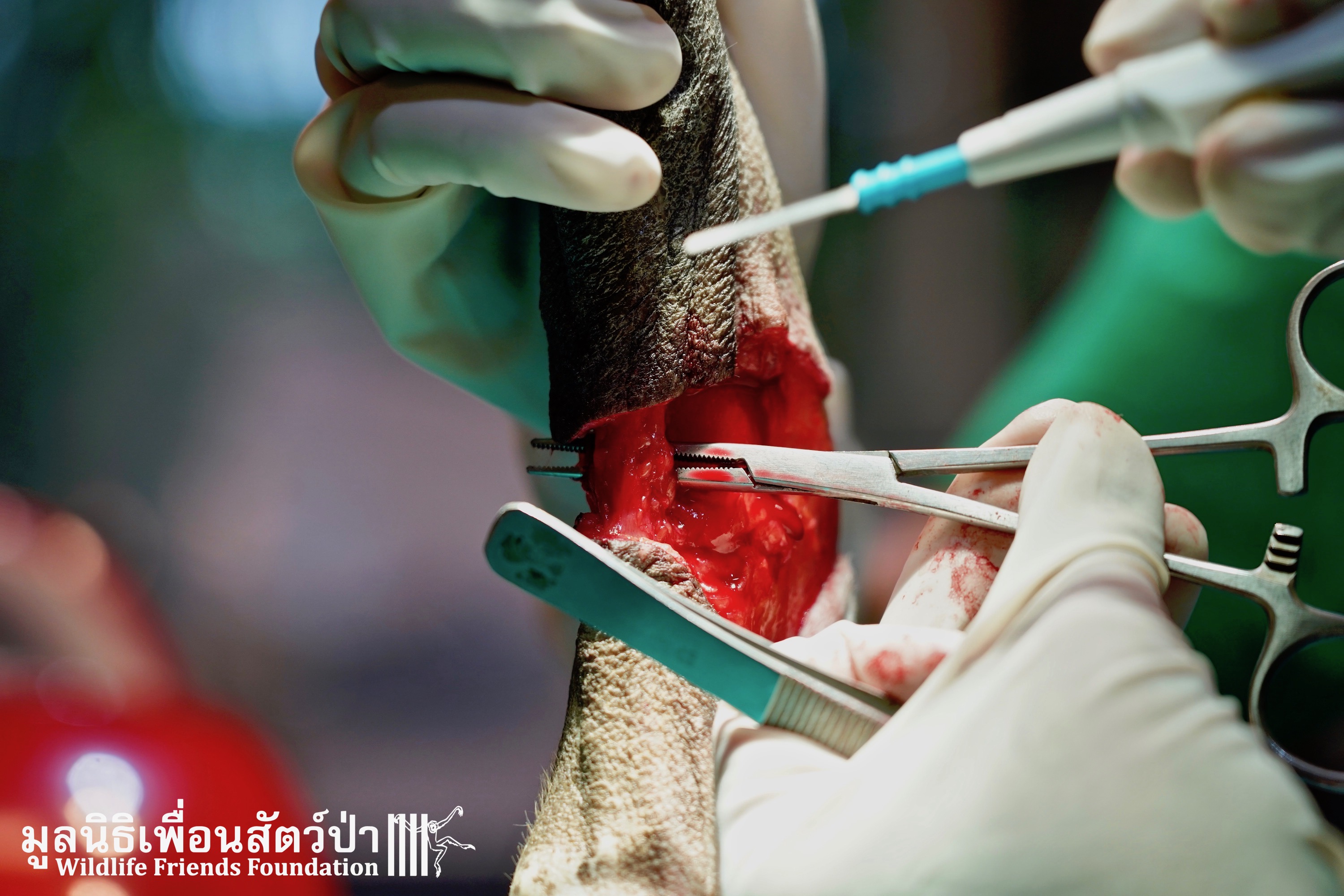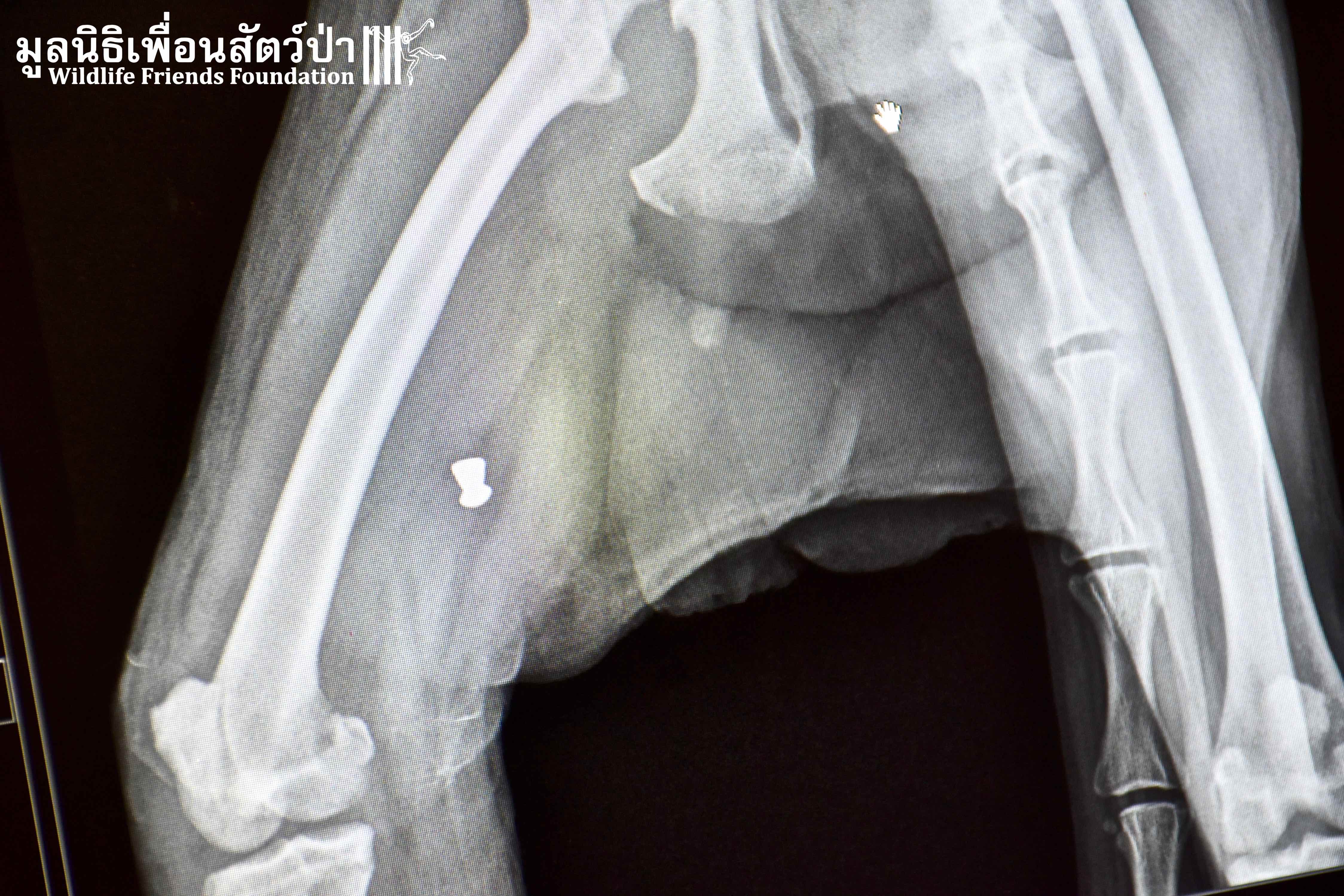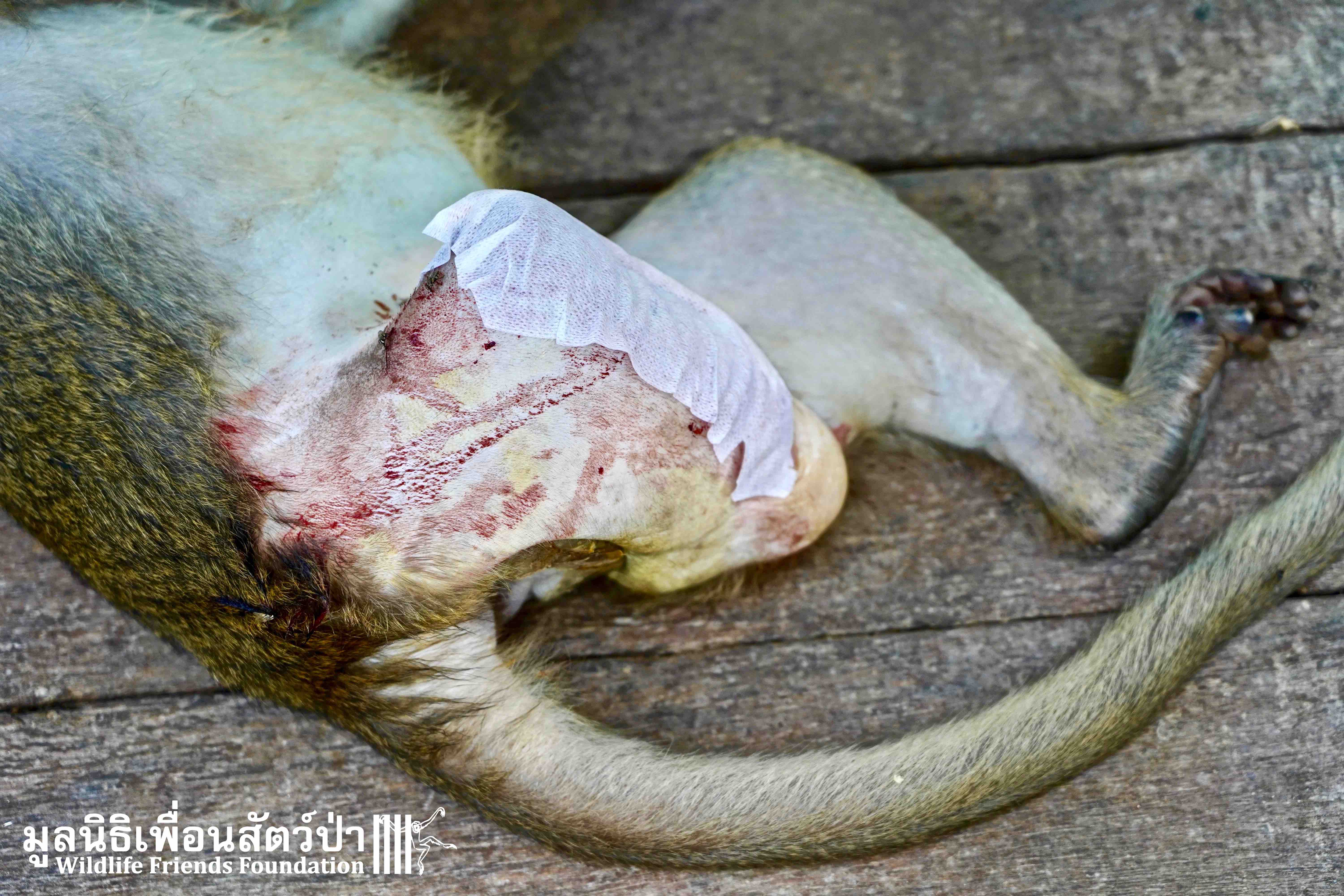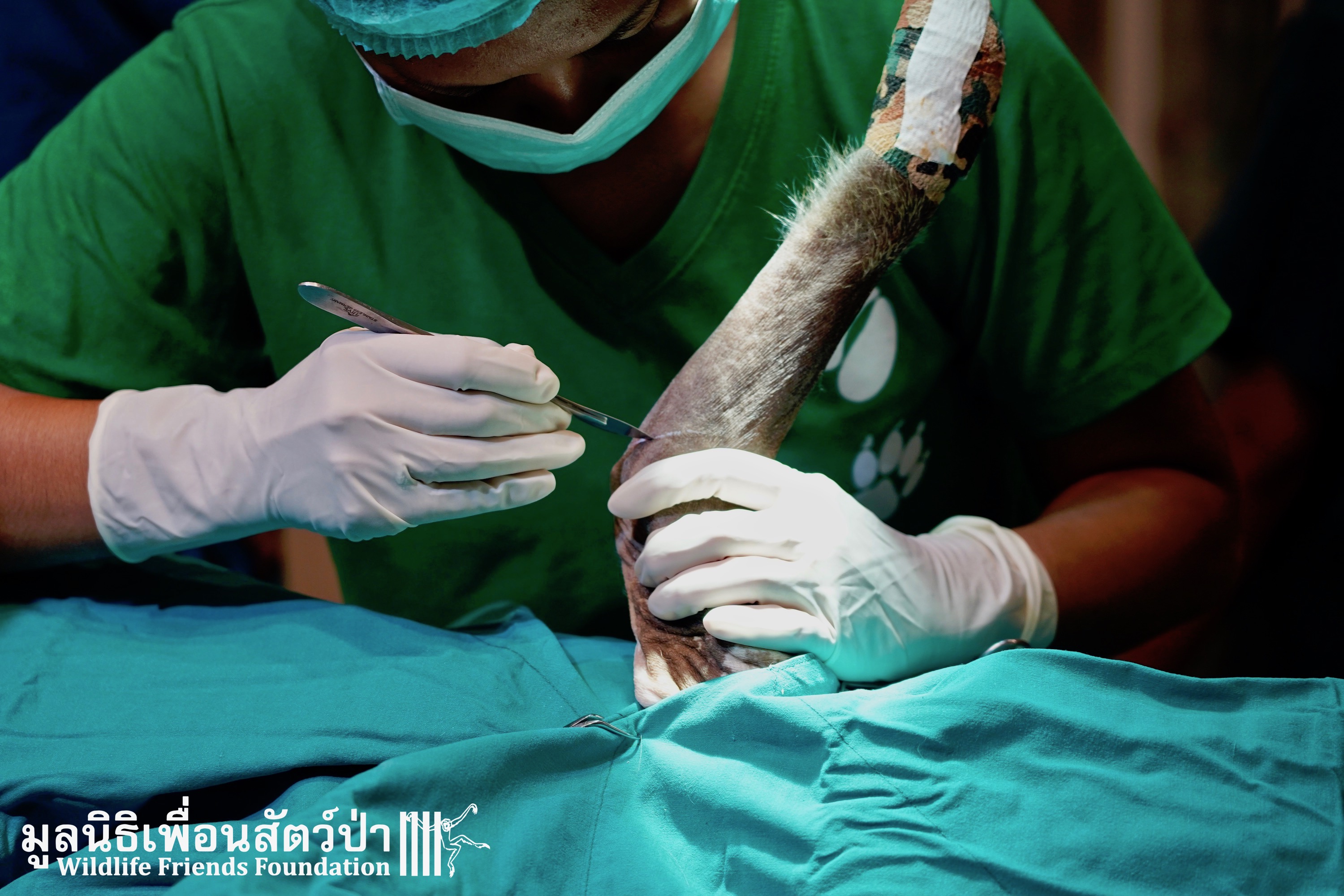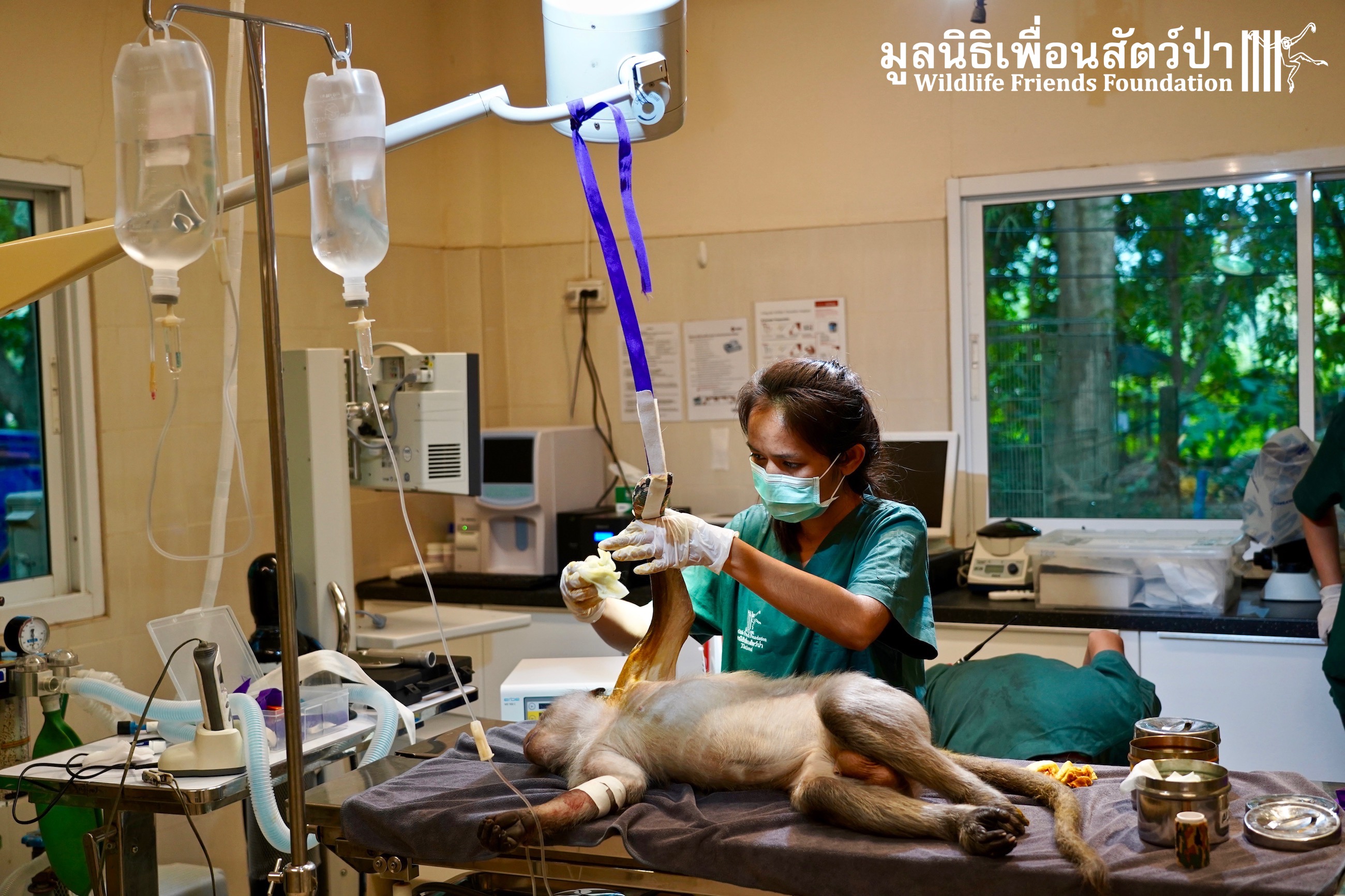 Our second amputation of the day was of another long-tailed macaque, Bucky, who first came to us several months ago after falling out of a tree. He belongs to an urban macaque troop that is fed by a local community in Bangkok. They trapped and brought him to WFFT after noticing he had stopped using his arm. Once again, no breaks or dislocations were found in his radiographs but a fresh bullet wound was discovered in his disabled arm. It was removed and he was returned to his troop. However, he was brought back to WFFT this week because he still wasn’t using his arm. To avoid future risks of injury and sepsis, this arm was amputated after Auan’s leg amputation. After his recovery he will be returned to his troop in Bang Khun Thian, Bangkok.