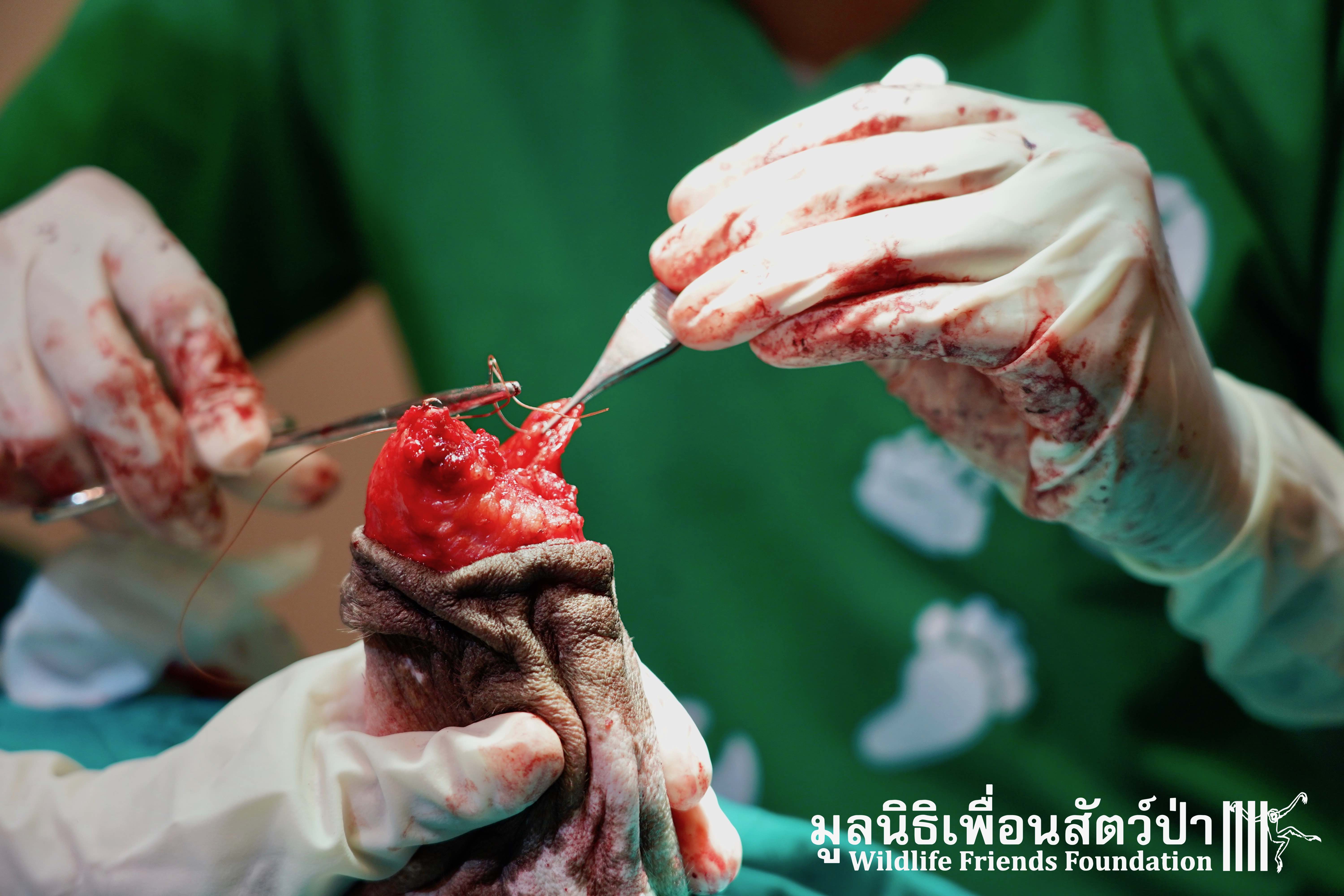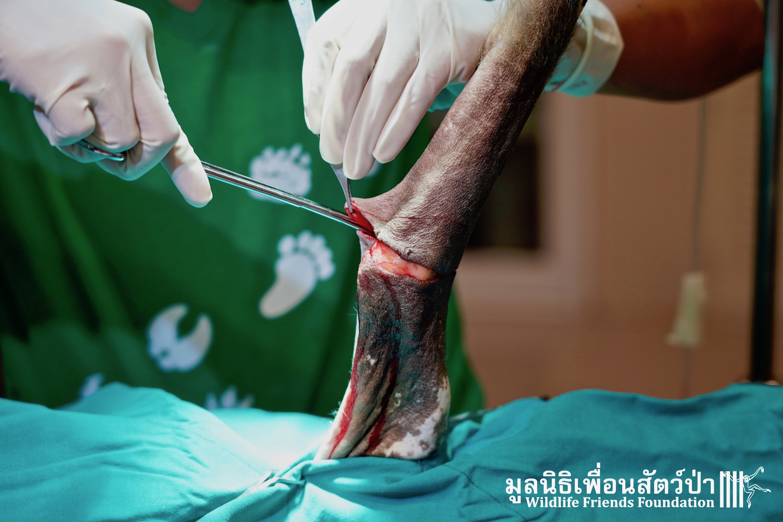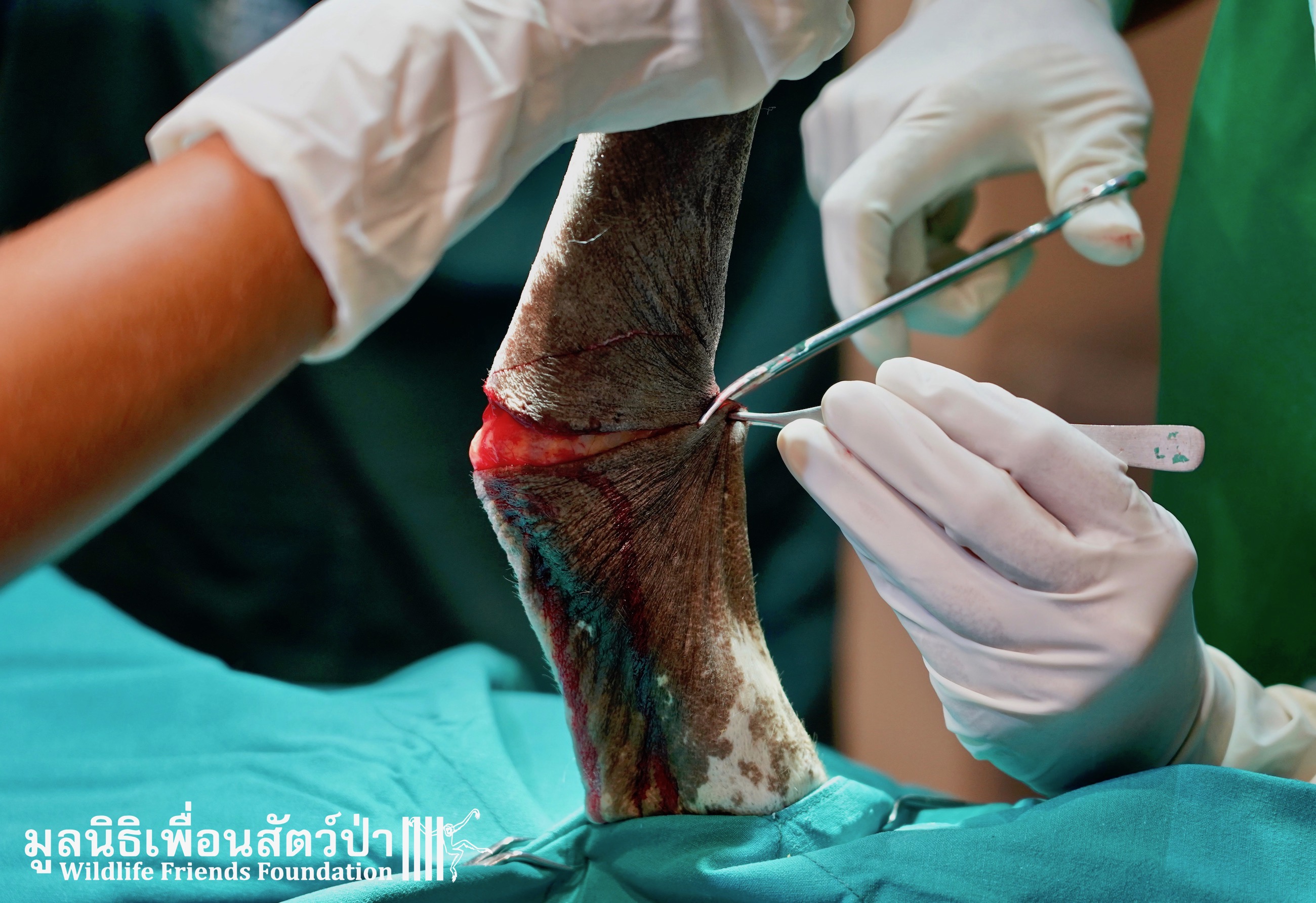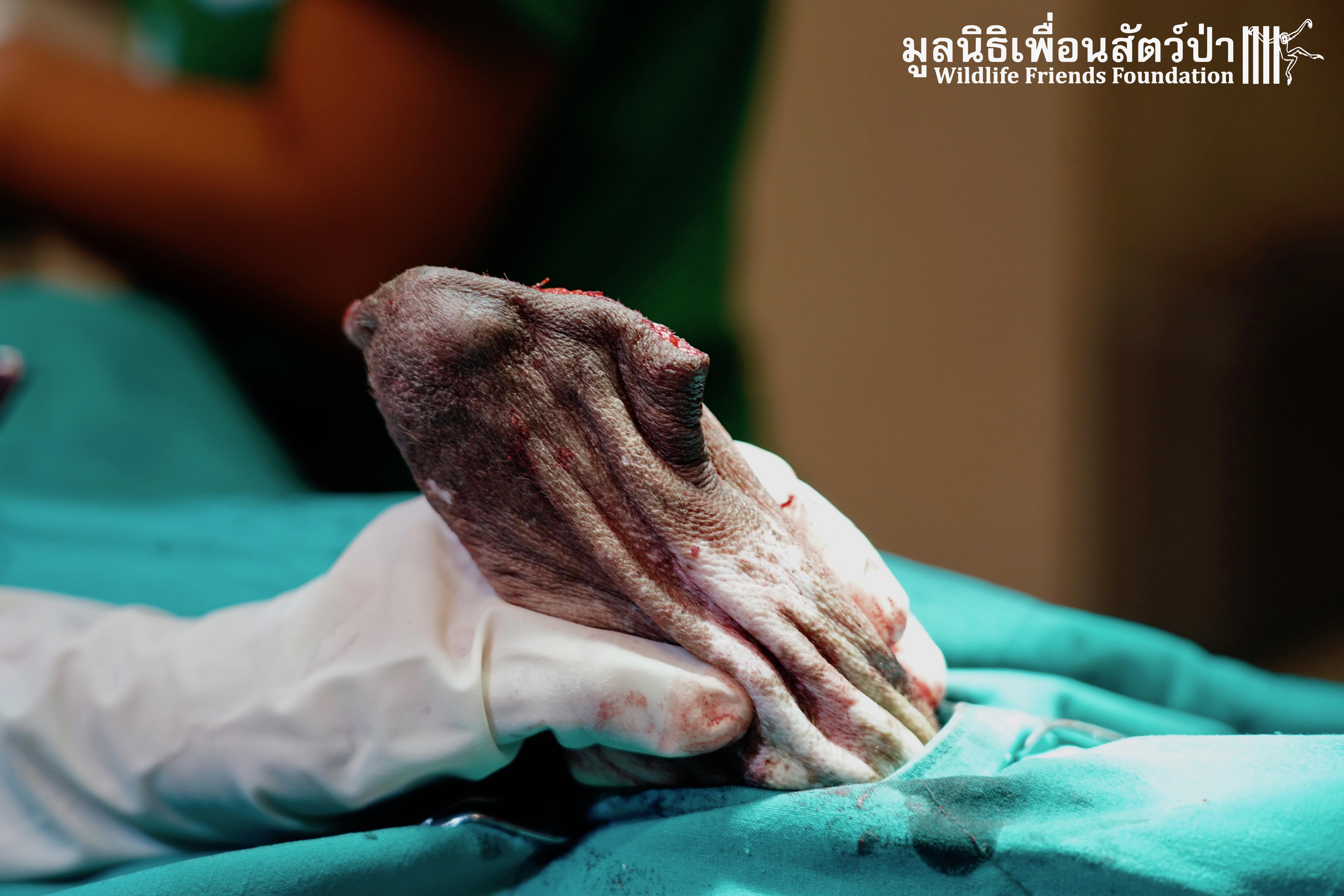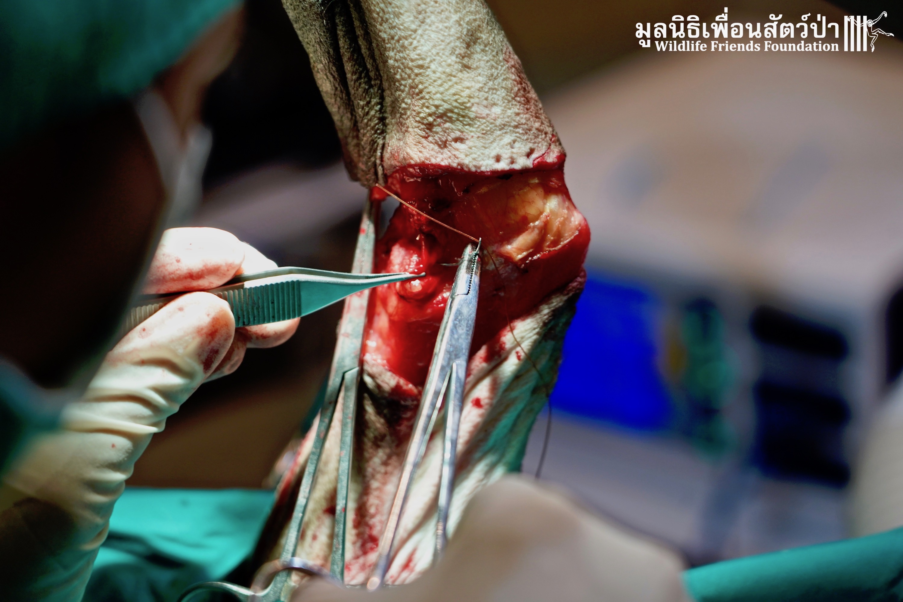 Our second amputation of the day was of another long-tailed macaque, Bucky, who first came to us several months ago after falling out of a tree. He belongs to an urban macaque troop that is fed by a local community in Bangkok. They trapped and brought him to WFFT after noticing he had stopped using his arm. Once again, no breaks or dislocations were found in his radiographs but a fresh bullet wound was discovered in his disabled arm. It was removed and he was returned to his troop. However, he was brought back to WFFT this week because he still wasn’t using his arm. To avoid future risks of injury and sepsis, this arm was amputated after Auan’s leg amputation. After his recovery he will be returned to his troop in Bang Khun Thian, Bangkok.
