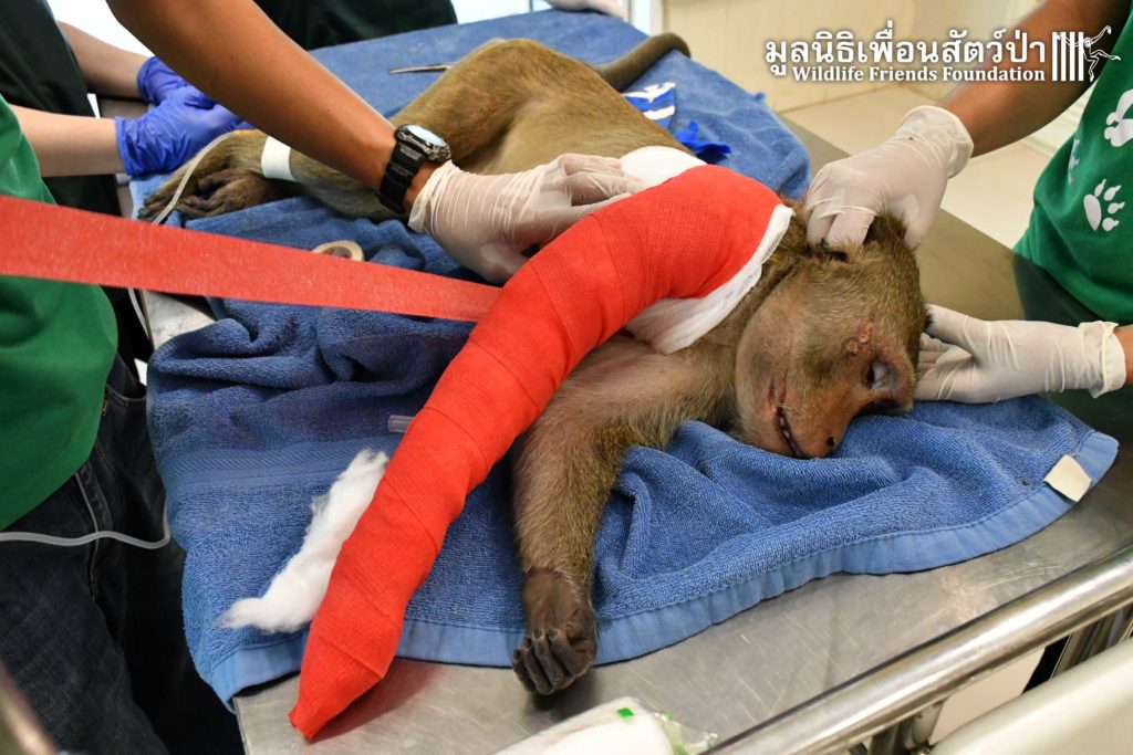 เมื่อเช้านี้ได้มีพลเมืองดีนำลิงเเสมถูกรถชนมาให้ทางเราดูเเลต่อ เมื่อมาถึงที่โรงพยาบาล พบว่ามันมีบาดแผลที่เเขนขวาเเละมีสภาพอ่อนเพลีย ผลตรวจ X-ray เเสดงให้เห็นชัดเจนว่า กระดูกหักที่เเขนขวาหัก1ท่อนจากการถูกรถชนอย่างจัง ! เบื้องต้นทีมสัตวเเพทย์ได้ฉีดยาลดอาการปวด เเละได้พันเฝือกอ่อนเพื่อรอการผ่าตัดดามเหล็กที่แขนต่อไป