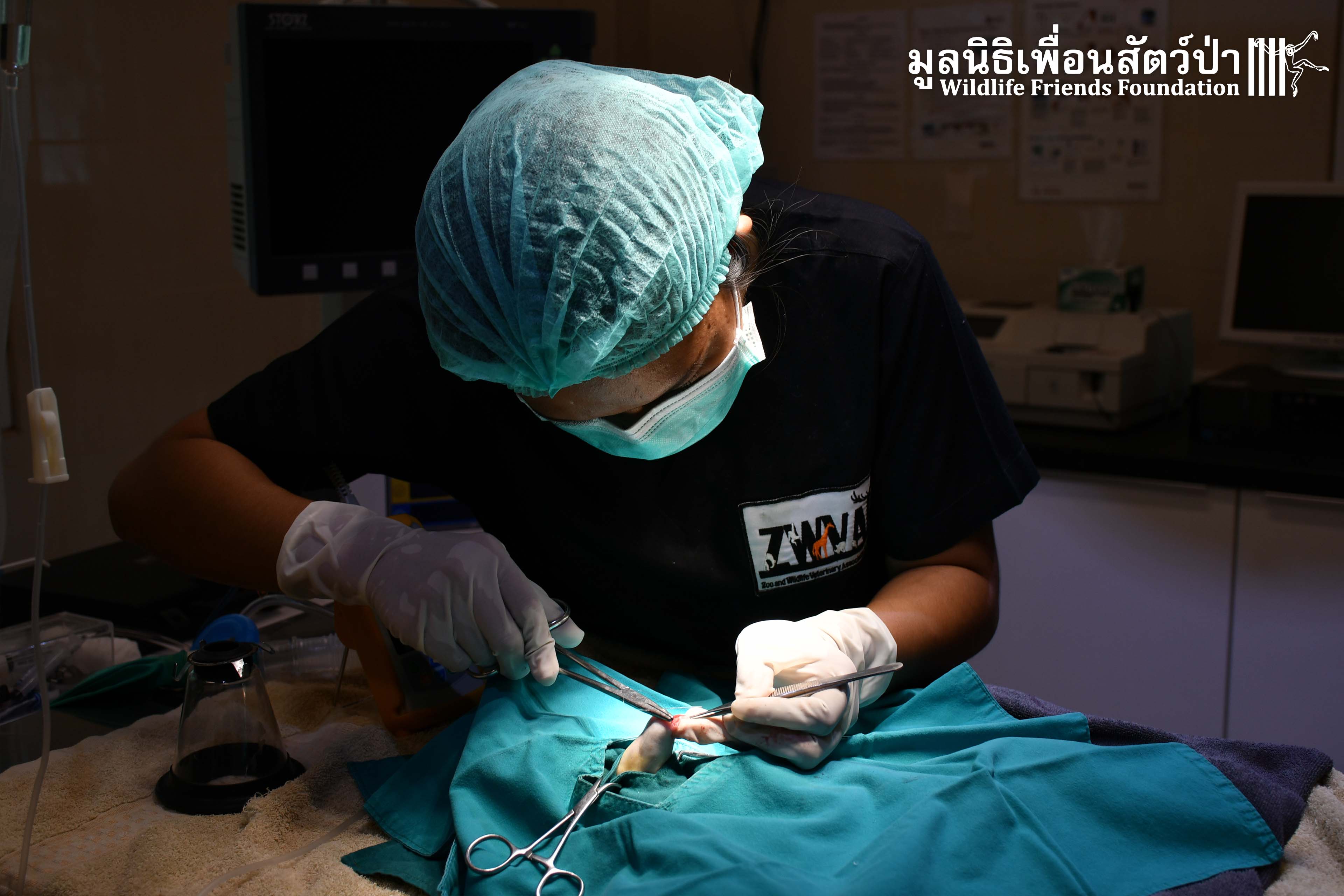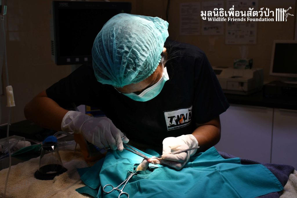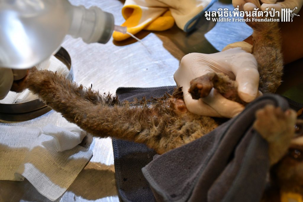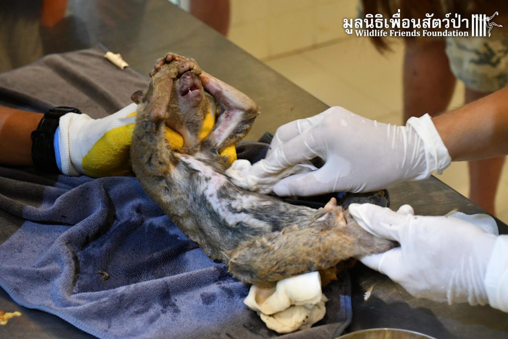 ทางทีมสัตว์เเพทย์ได้ตรวจเเละพบว่ามีรอยเเผลไหม้ทั่วร่างกาย เเละได้ทำเเผล ล้างเเผล ทายาฆ่าเชื้อ ป้อนยาเพื่อลดการอักเสบ เเต่น่าเสียดายที่เราจำเป็นต้องตัดเเขนของเธอออกเพื่อยับยั้งการแพร่กระจายของเชื้อ