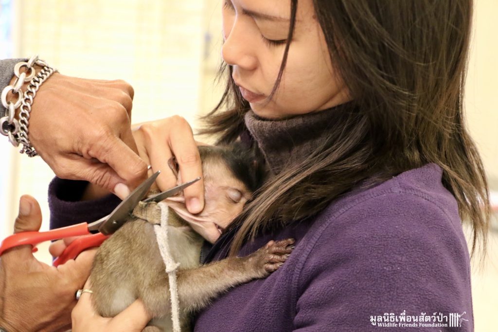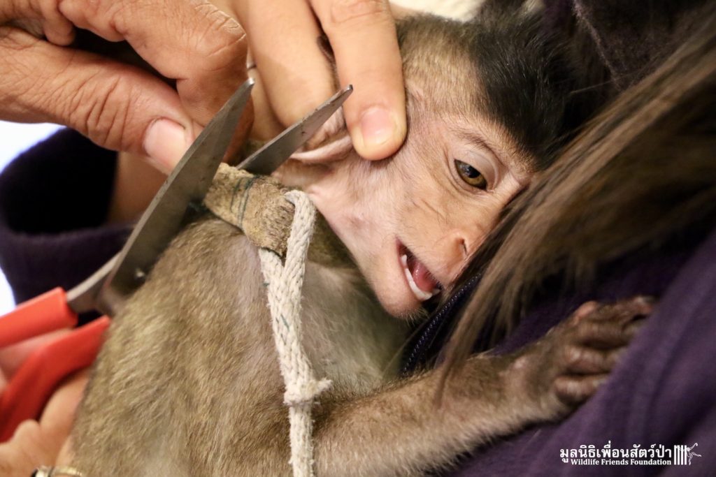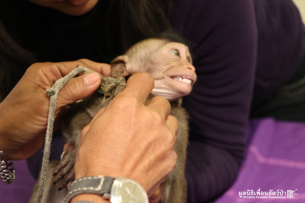 Last week some local people brought in a juvenile long-tailed macaque (macaca fascicularis). They had found him one month prior to bringing him into the WFFT Wildlife Rescue Centre after he had been attacked by a cat. Initially they thought keeping him as a pet was a good idea but soon changed their minds. They named him ‘Durian’, we estimate that he is around 12 months old. Luckily for Durian the people saw sense and handed him over to WFFT.