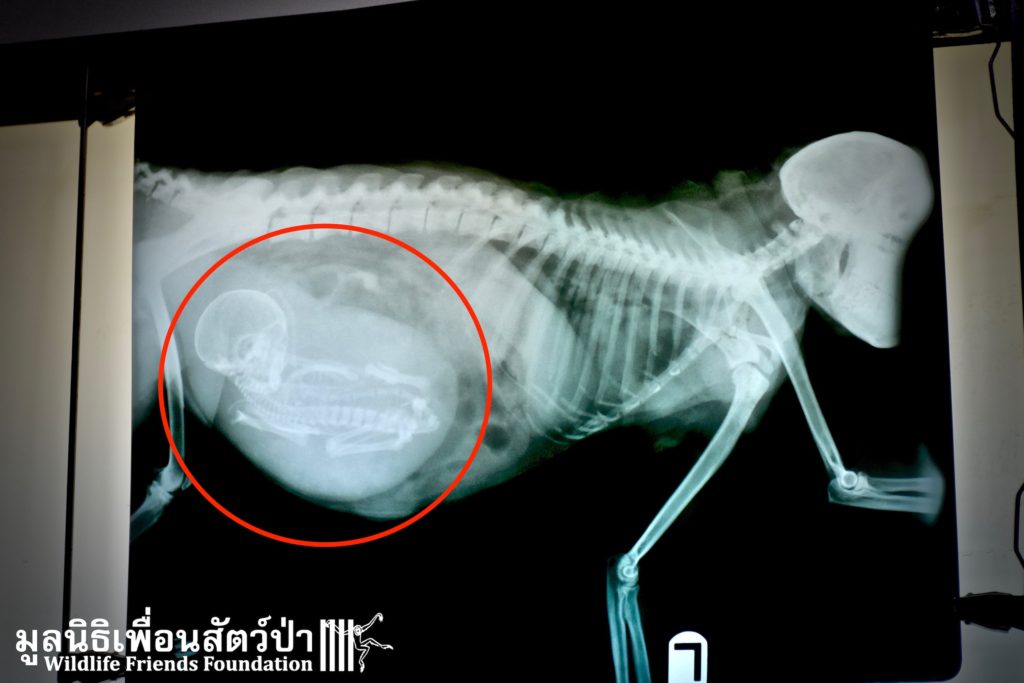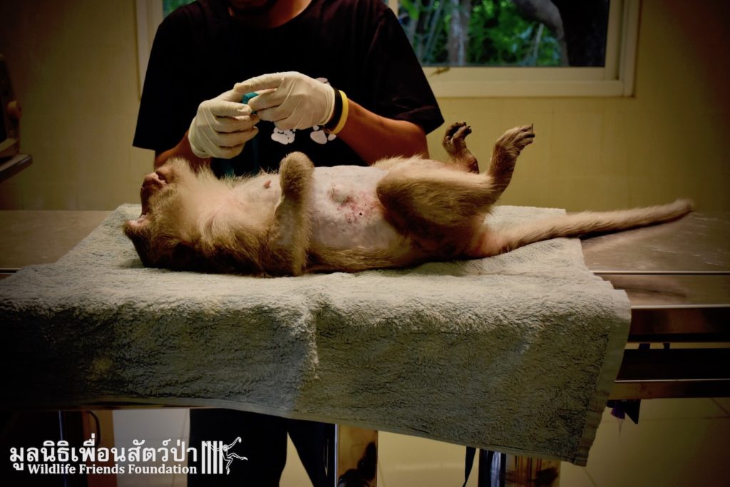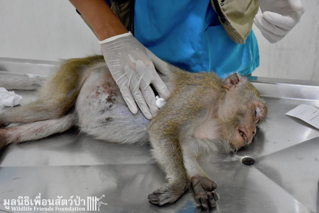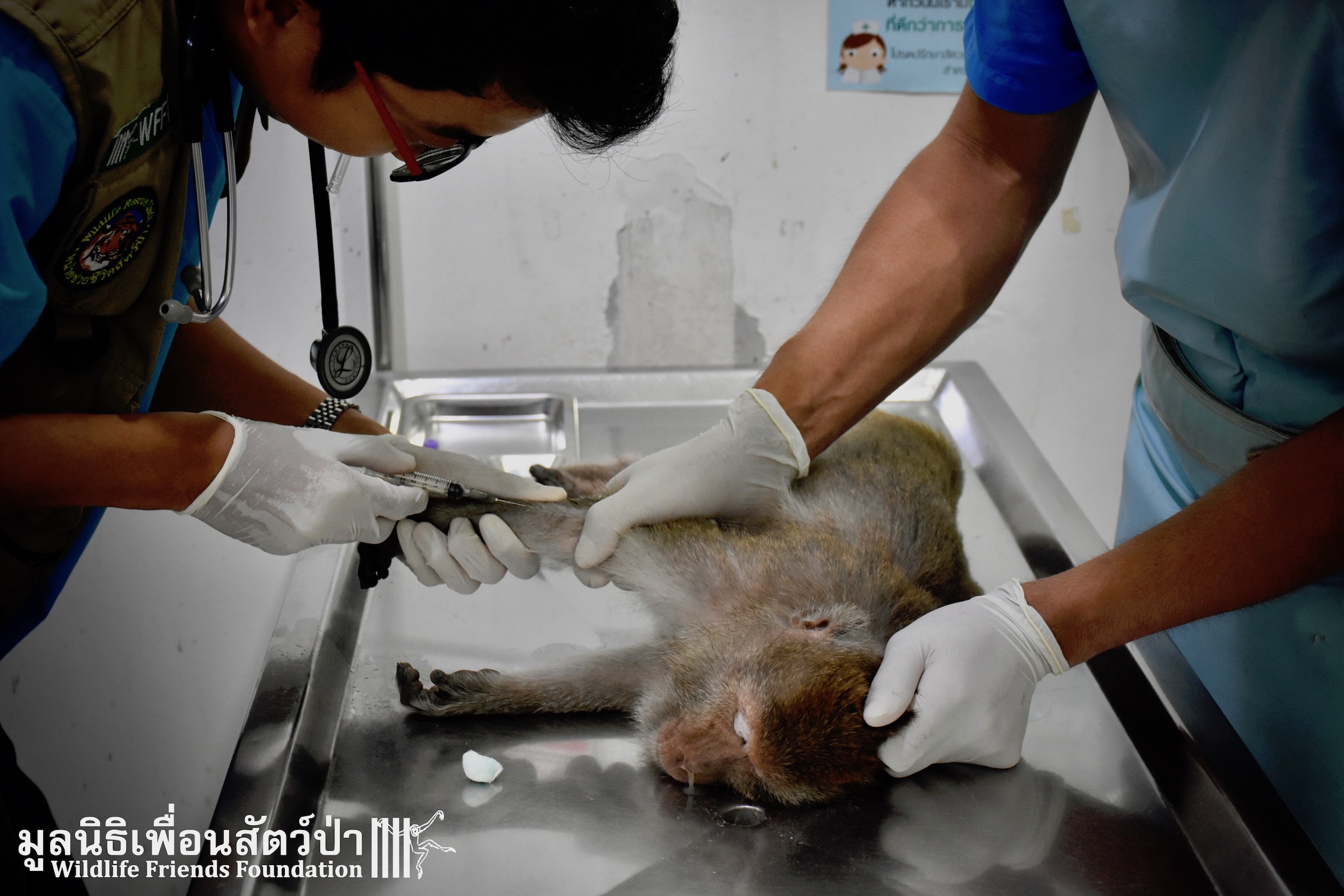Yesterday we received a telephone call from a concerned resident in Hua Hin, who had found a severely injured female long-tailed macaque (Macaca fascicularis) next to a garbage collection area at the side of a busy road. The WFFT Wildlife Rescue Team headed straight to try and save this monkey. Open arrival to the scene they found a very weak, almost unresponsive macaque on the ground. We do not know why she was found in such a weakened state, she may have been involved in a road traffic accident, or be suffering from an illness. She was loaded on the rescue vehicle and rushed straight to an animal x-ray clinic to help the vet team properly diagnose the problem. She was then transported to the WFFT Wildlife Hospital for further assessment and treatment.