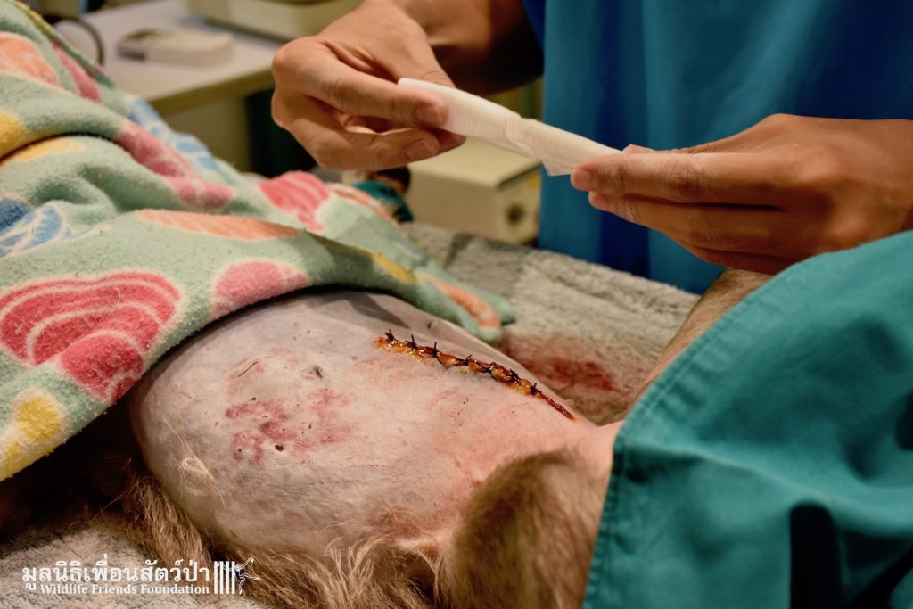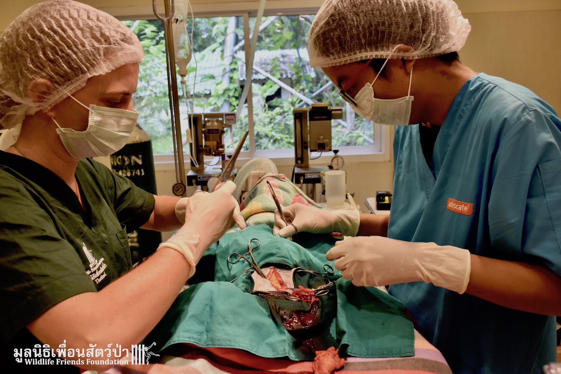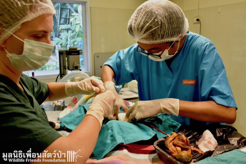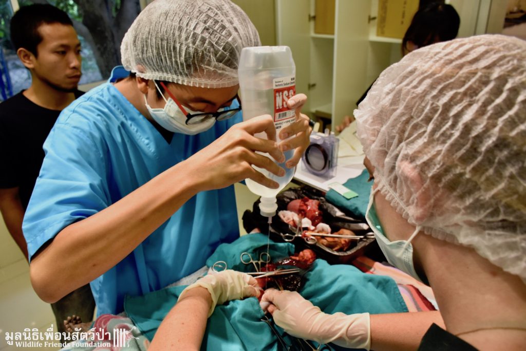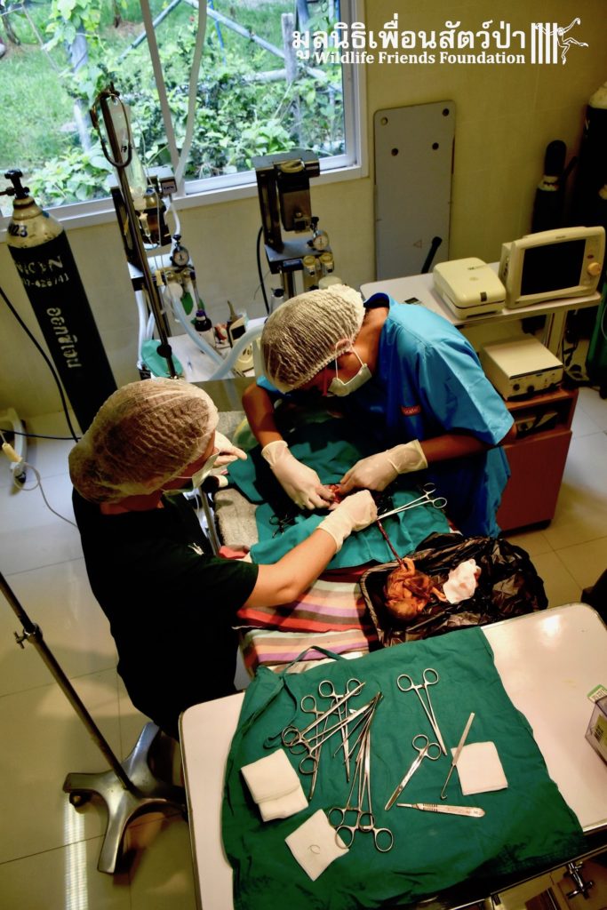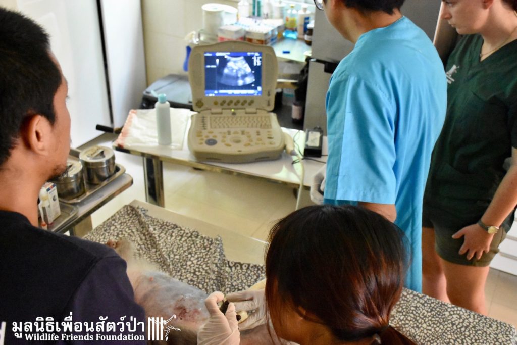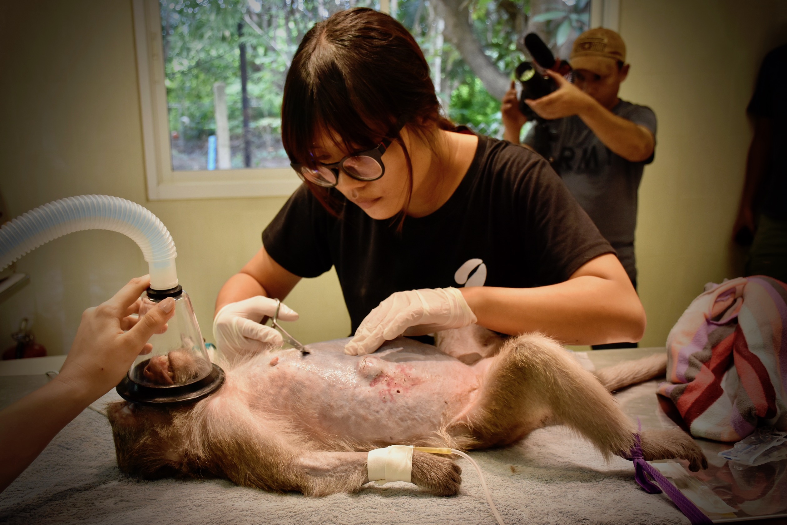 We have named this macaque Chomsin, after the road she was found on. Upon arrival to the WFFT Wildlife Hospital the vet team performed an ultrasound to check on the health of the unborn infant. Sadly, the ultrasound reveled that the infant was dead. Chomsin was rushed into emergency surgery to perform an abortion in the hope that we could at least save her life. The infant was successfully removed and less than 24 hours later, Chomsin is now sat up eating and drinking. However, this does not mean she is out of the woods yet, we will only be able to tell over the next few days if she will make it, and if she does she will be released back to the wild. We will keep you posted on her progress.