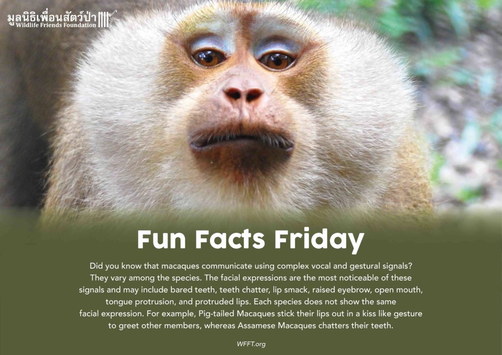 ทราบไหมครับว่านอกจากการสื่อสารด้วยเสียงและท่าทางแล้วลิงมาคักยังสื่อสารผ่านทางสีหน้ากับสมาชิกในฝูงอีกด้วยเพื่อเป็นการแสดงพฤติกรรมความเป็นมิตรหรือแสดงความก้าวร้าว รวมๆแล้วมีทั้งหมด 7 แบบได้แก่ การยีฟัน, การเอาฟันหน้ากระทบกัน, ใช้ริมฝีปากกระทบกัน, ยักคิ้วขึ้น, อ้าปาก, แลบลิ้น หรือ ทำปากจู๋