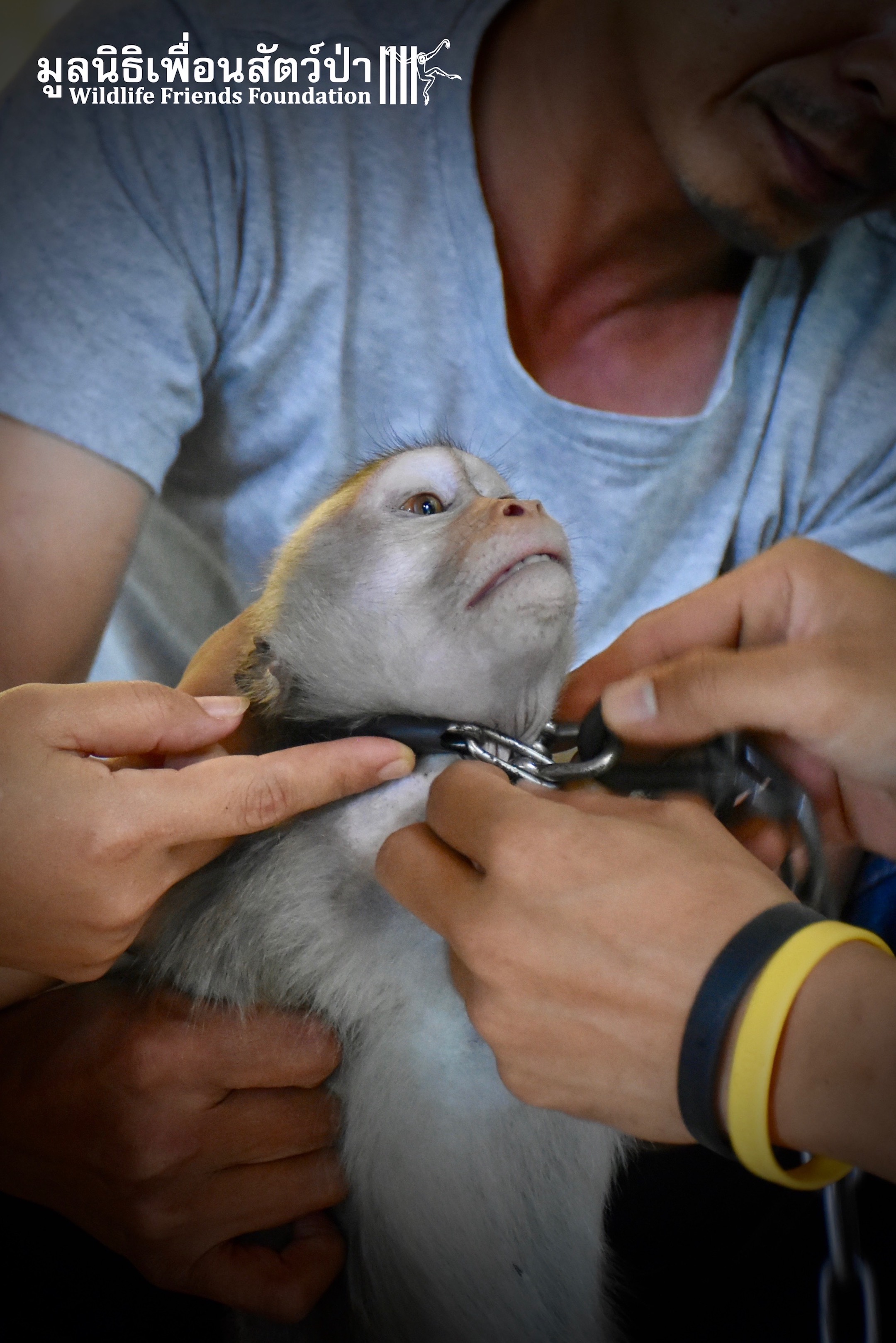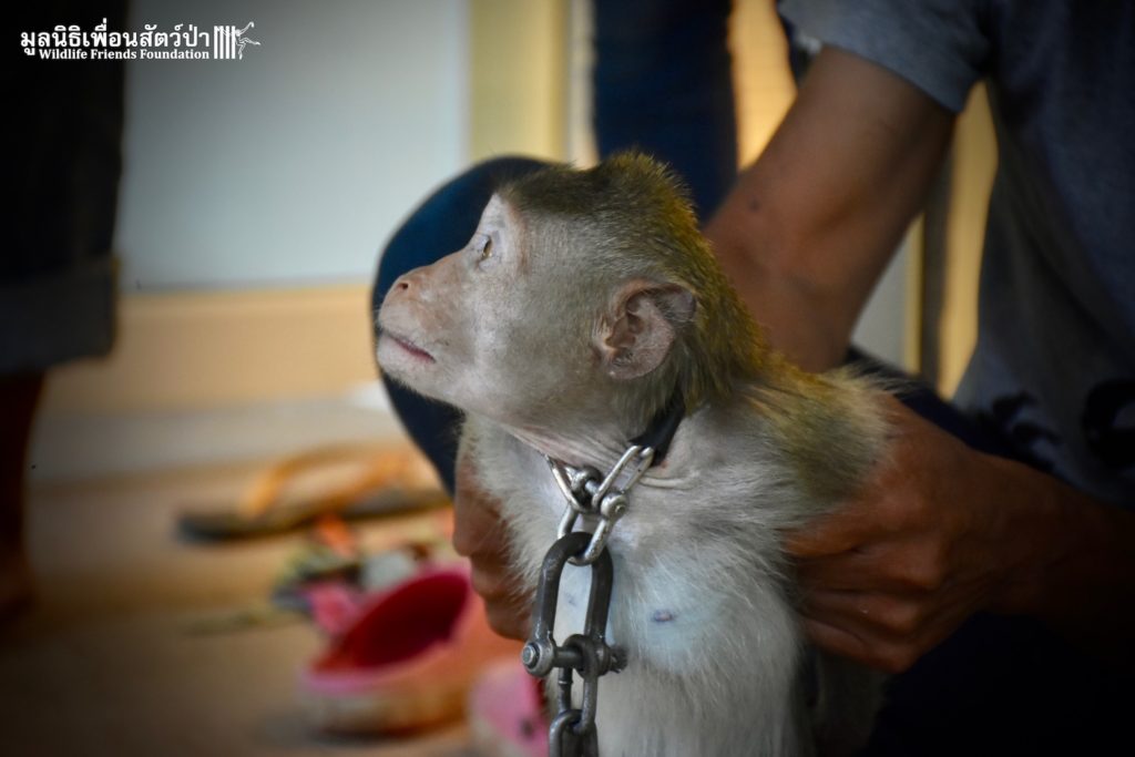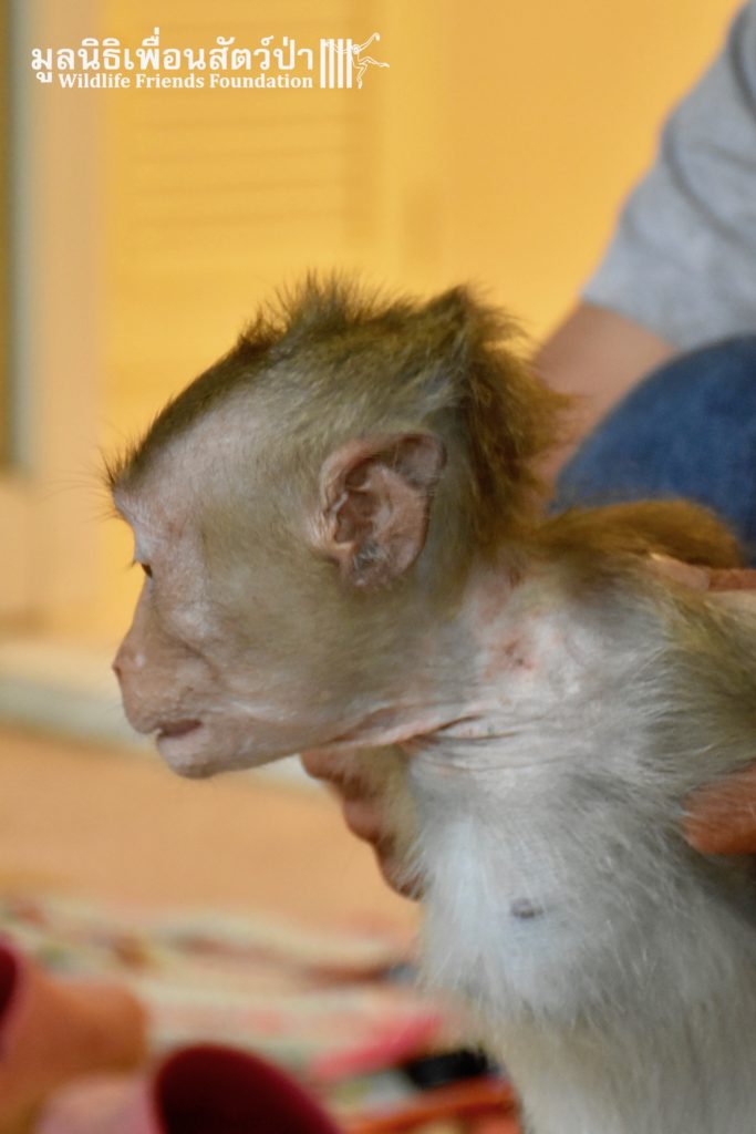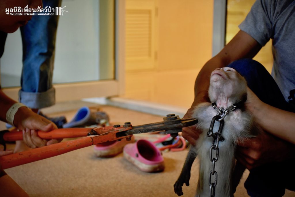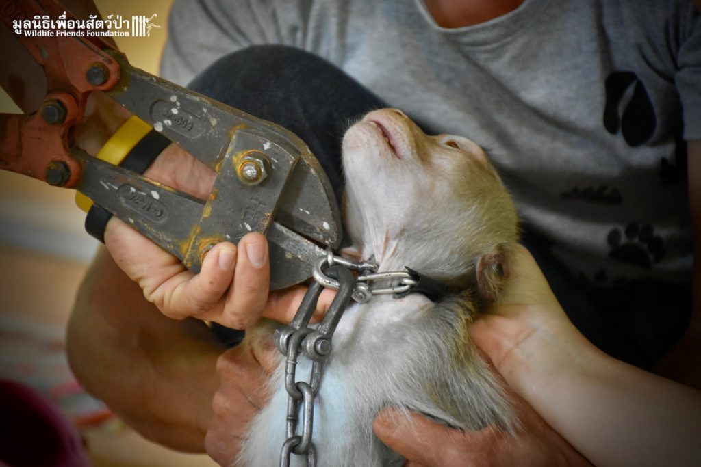 A few days ago the WFFT Rescue Team headed out to help this little guy, meet Tang Mo (Watermelon) the five-year-old long-tailed macaque (macaca fascicularis). Tang Mo was being kept at a petrol station in central Bangkok, confined to a chain this poor guy had nowhere to hide away from the people, pollution or extreme temperatures. Purchased as a pet when he was a tiny baby five years ago, it is likely that he was caught directly from the wild, witnessing the murder of his family or at least his mother. Thankfully we were asked to help by a veterinarian who had found him, and managed to talk the owners into giving him a better life. He was brought straight back to the WFFT Wildlife Hospital.