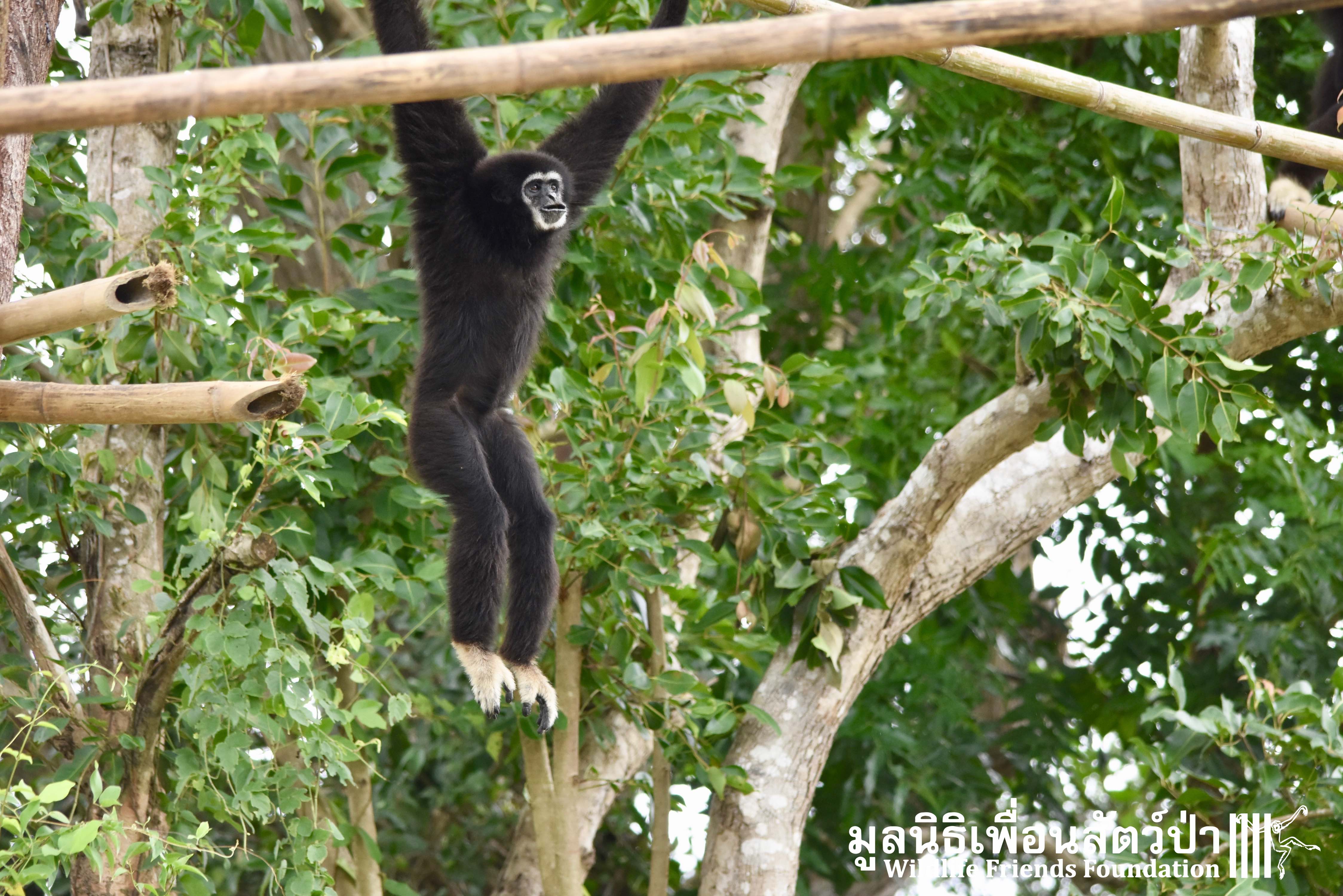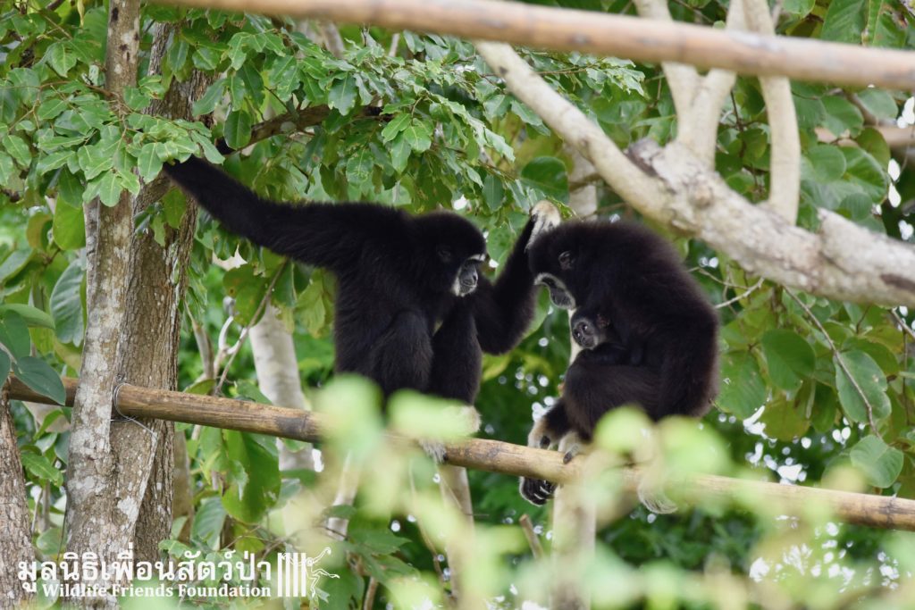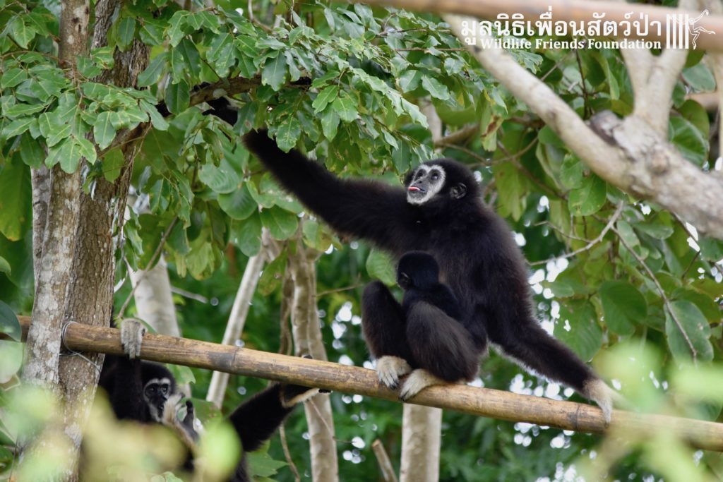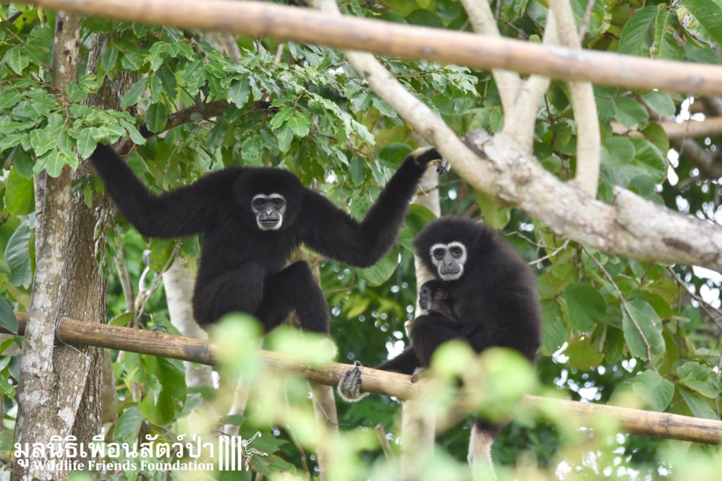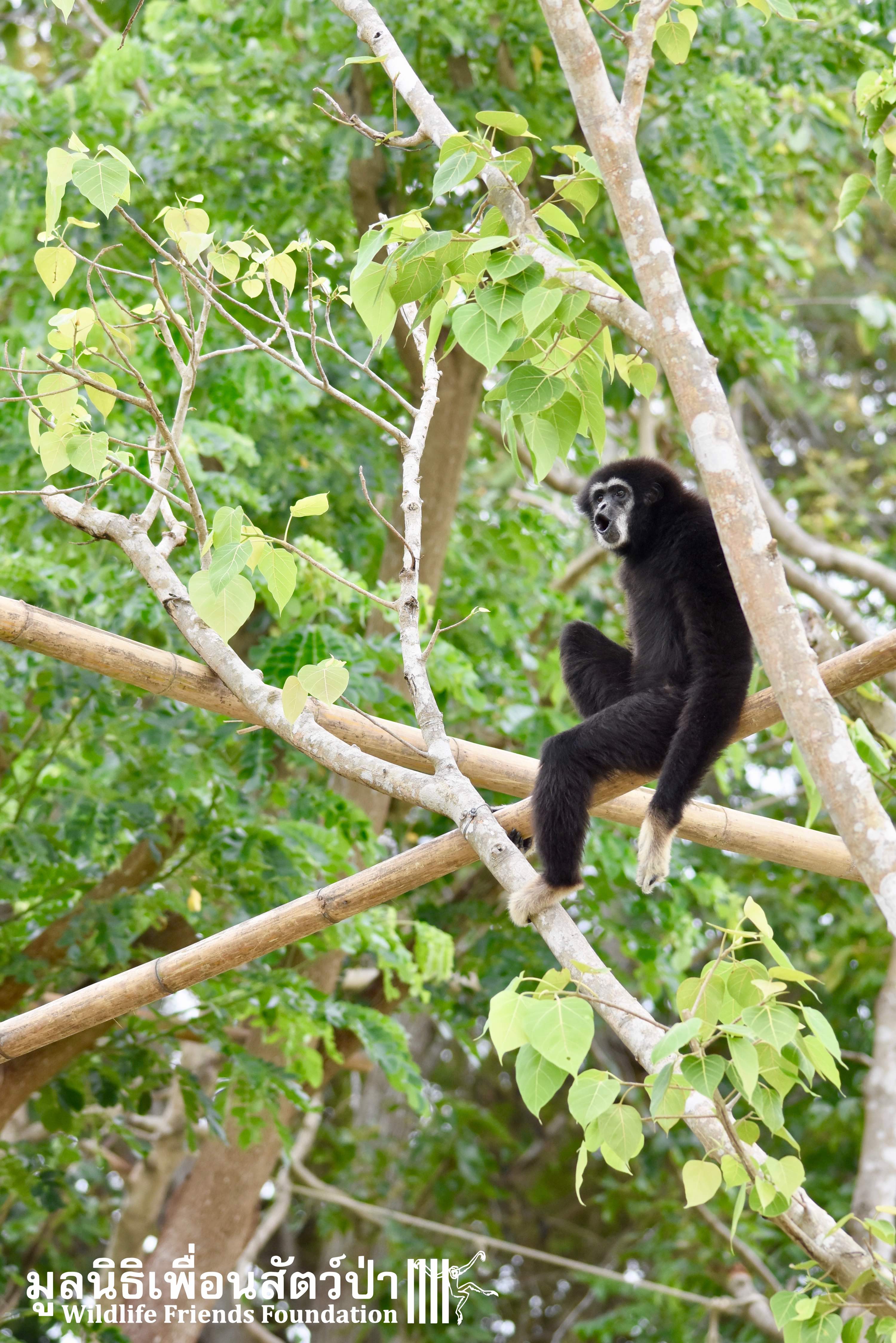 Bam, an endangered white handed gibbon, first came to WFFT after being kept illegally as a pet in Bangkok. She is now 17 years old and gave birth to Bowie four years ago at WFFT as well as Stardust in February of this year. Bowie and Stardust were fathered by Dome, a 19 year old white handed gibbon, who was rescued in 2009 from Prachuap Khiri Khan Province. This week the whole family moved to a new island on project 4. This large wildlife haven now has 6 gibbon islands.