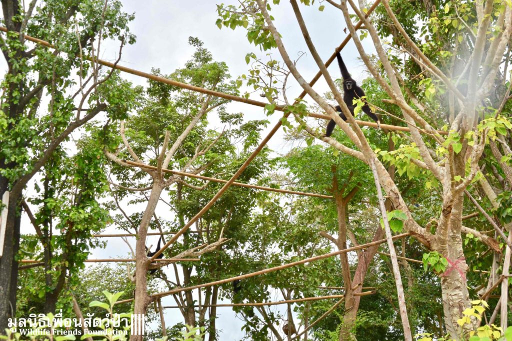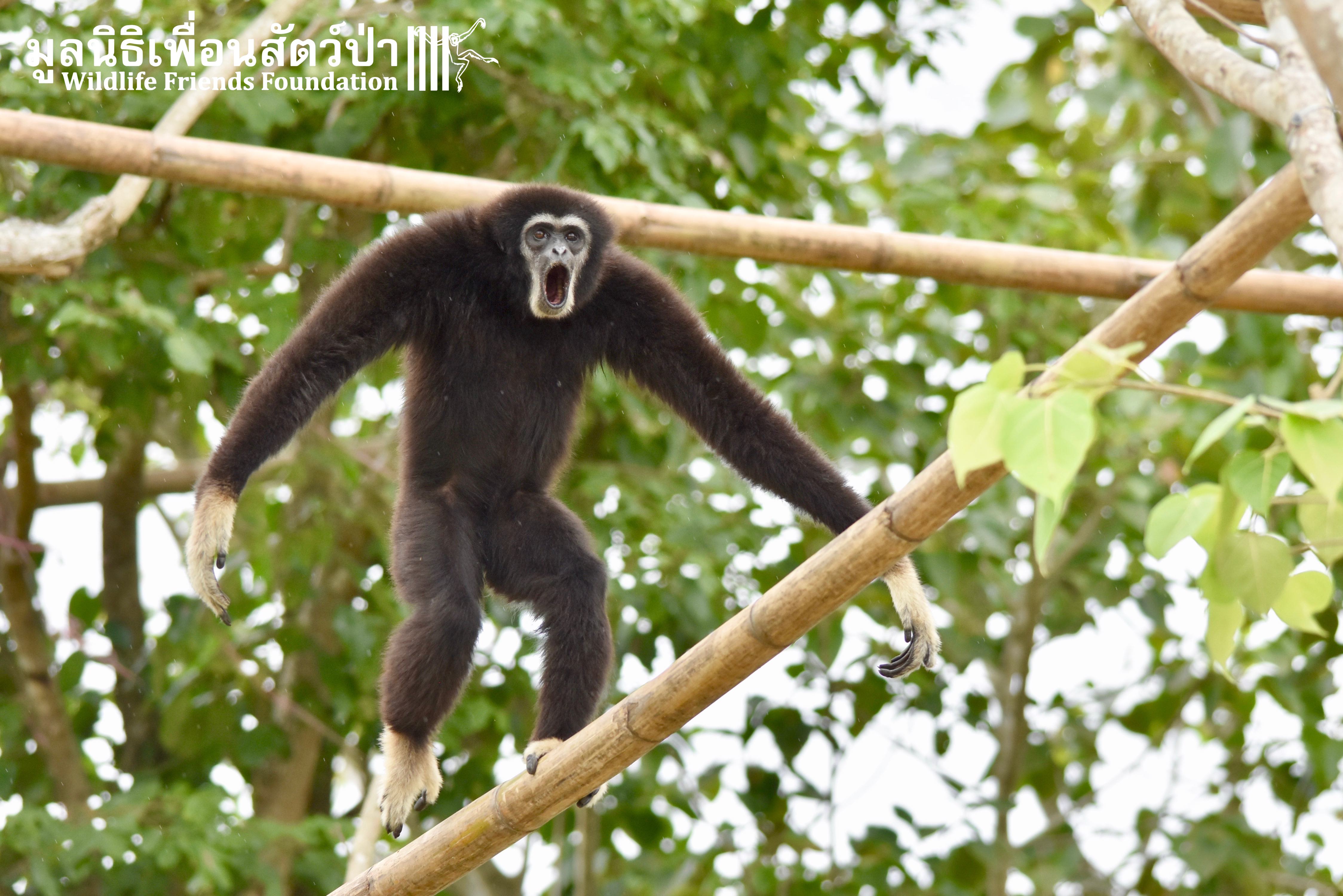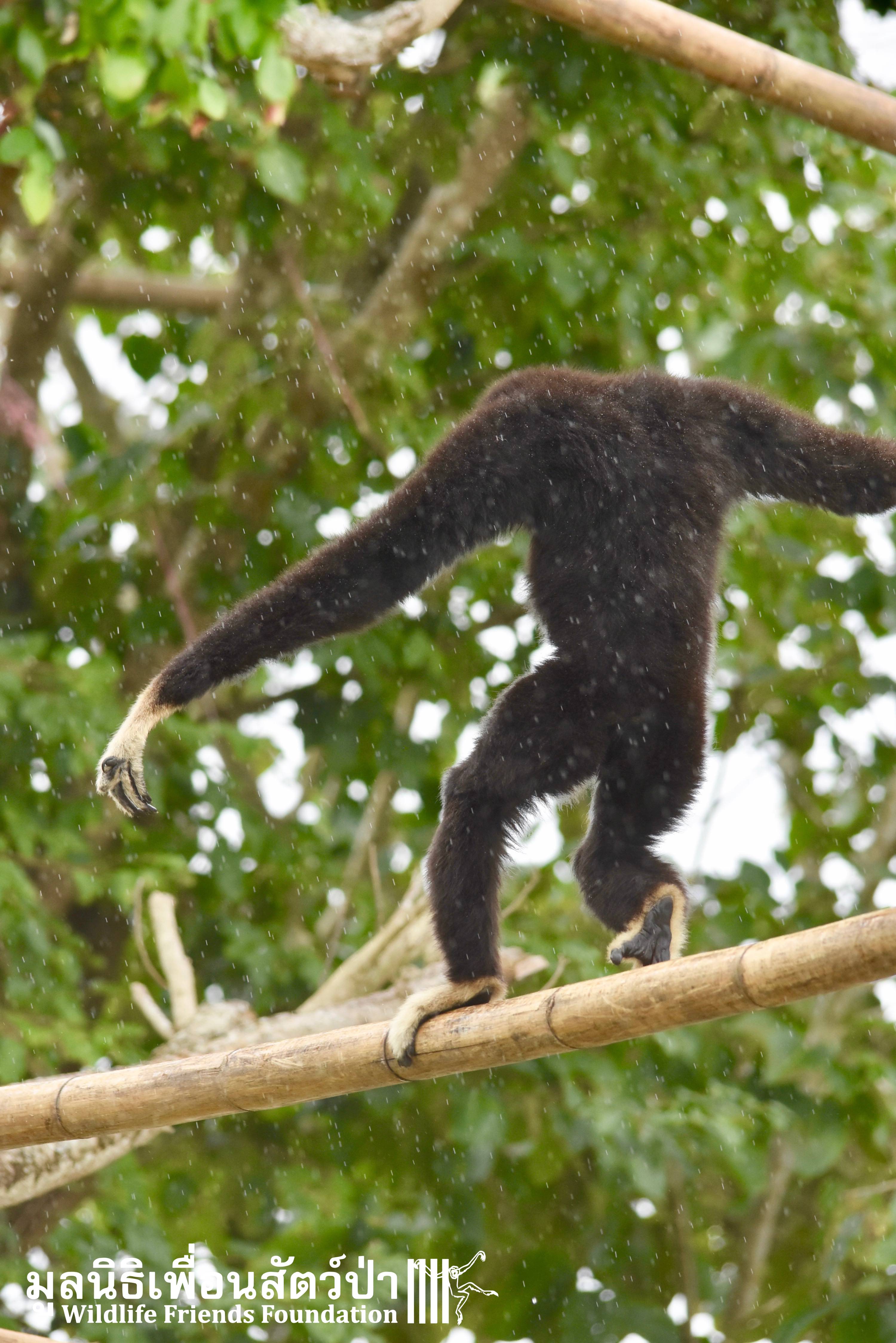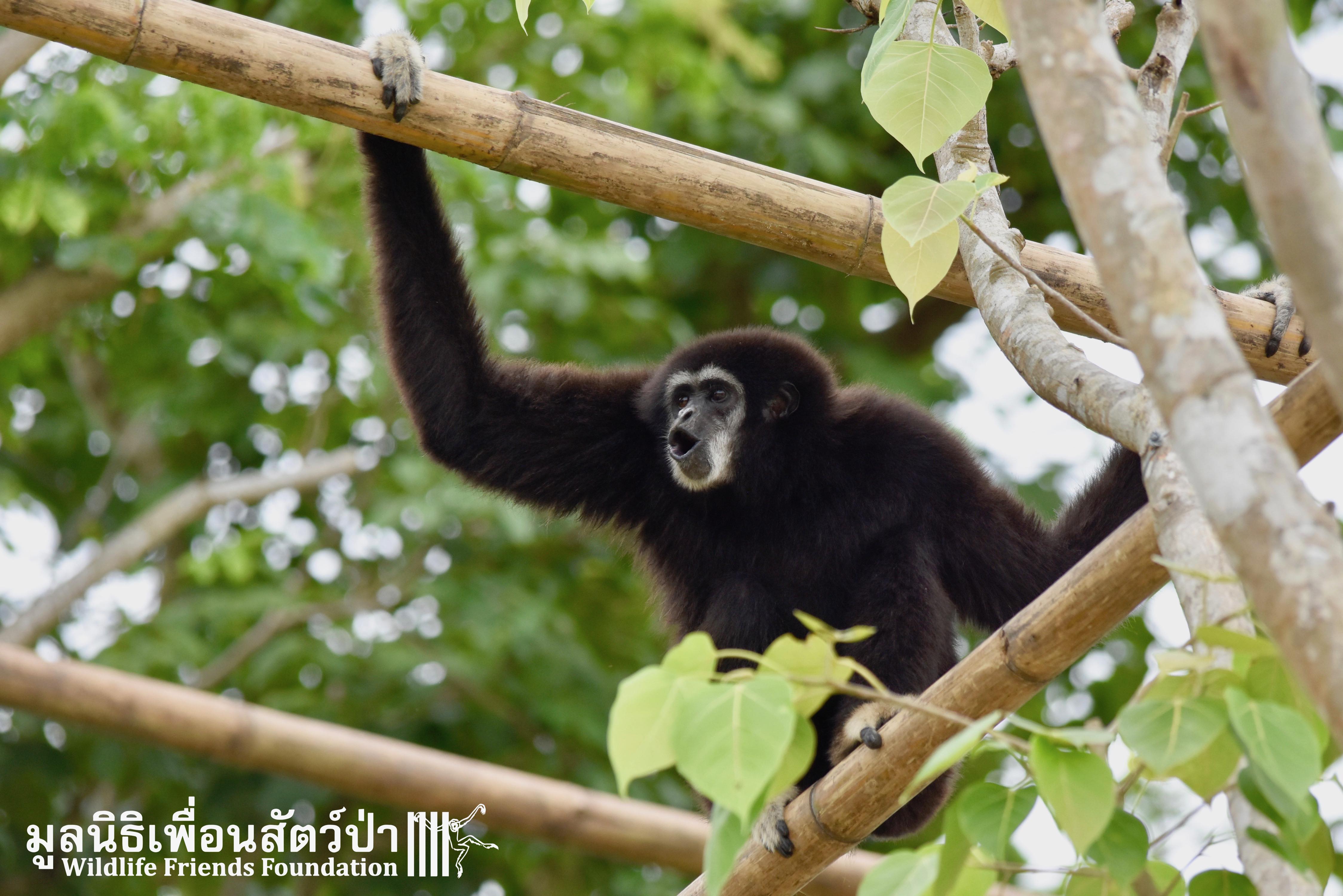 Bam, an endangered white handed gibbon, first came to WFFT after being kept illegally as a pet in Bangkok. She is now 17 years old and gave birth to Bowie four years ago at WFFT as well as Stardust in February of this year. Bowie and Stardust were fathered by Dome, a 19 year old white handed gibbon, who was rescued in 2009 from Prachuap Khiri Khan Province. This week the whole family moved to a new island on project 4. This large wildlife haven now has 6 gibbon islands.