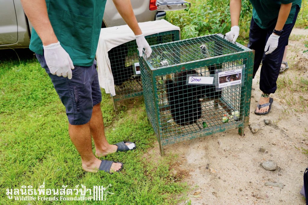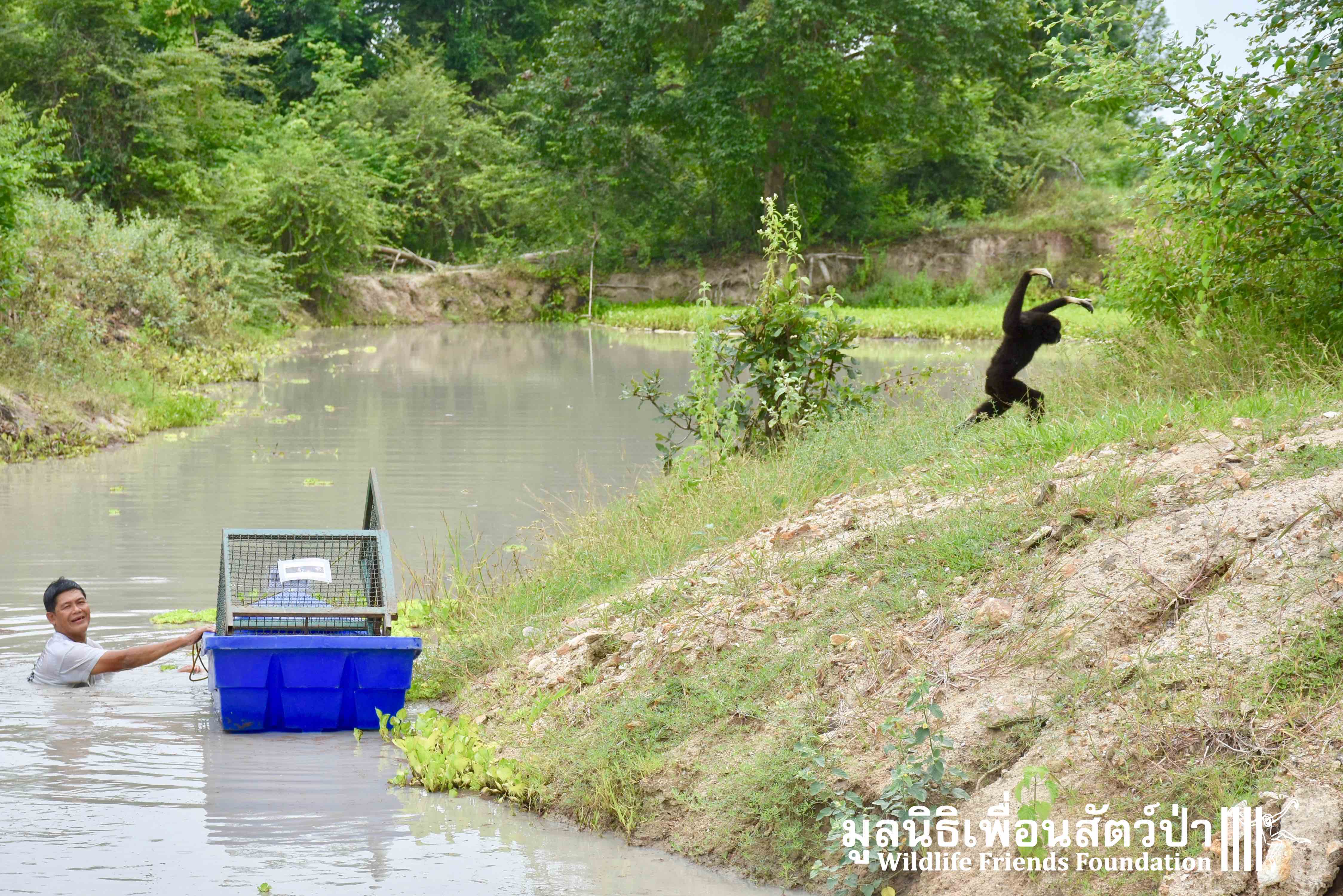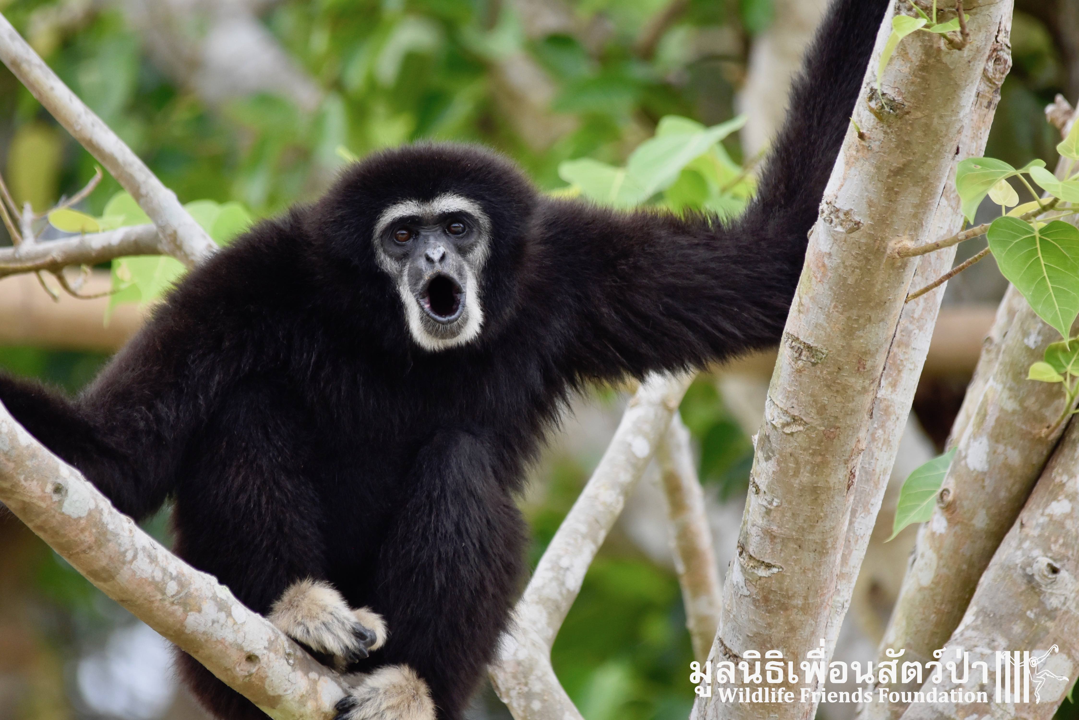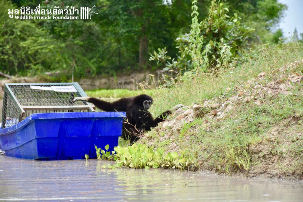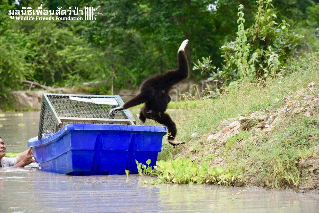 Bam, an endangered white handed gibbon, first came to WFFT after being kept illegally as a pet in Bangkok. She is now 17 years old and gave birth to Bowie four years ago at WFFT as well as Stardust in February of this year. Bowie and Stardust were fathered by Dome, a 19 year old white handed gibbon, who was rescued in 2009 from Prachuap Khiri Khan Province. This week the whole family moved to a new island on project 4. This large wildlife haven now has 6 gibbon islands.