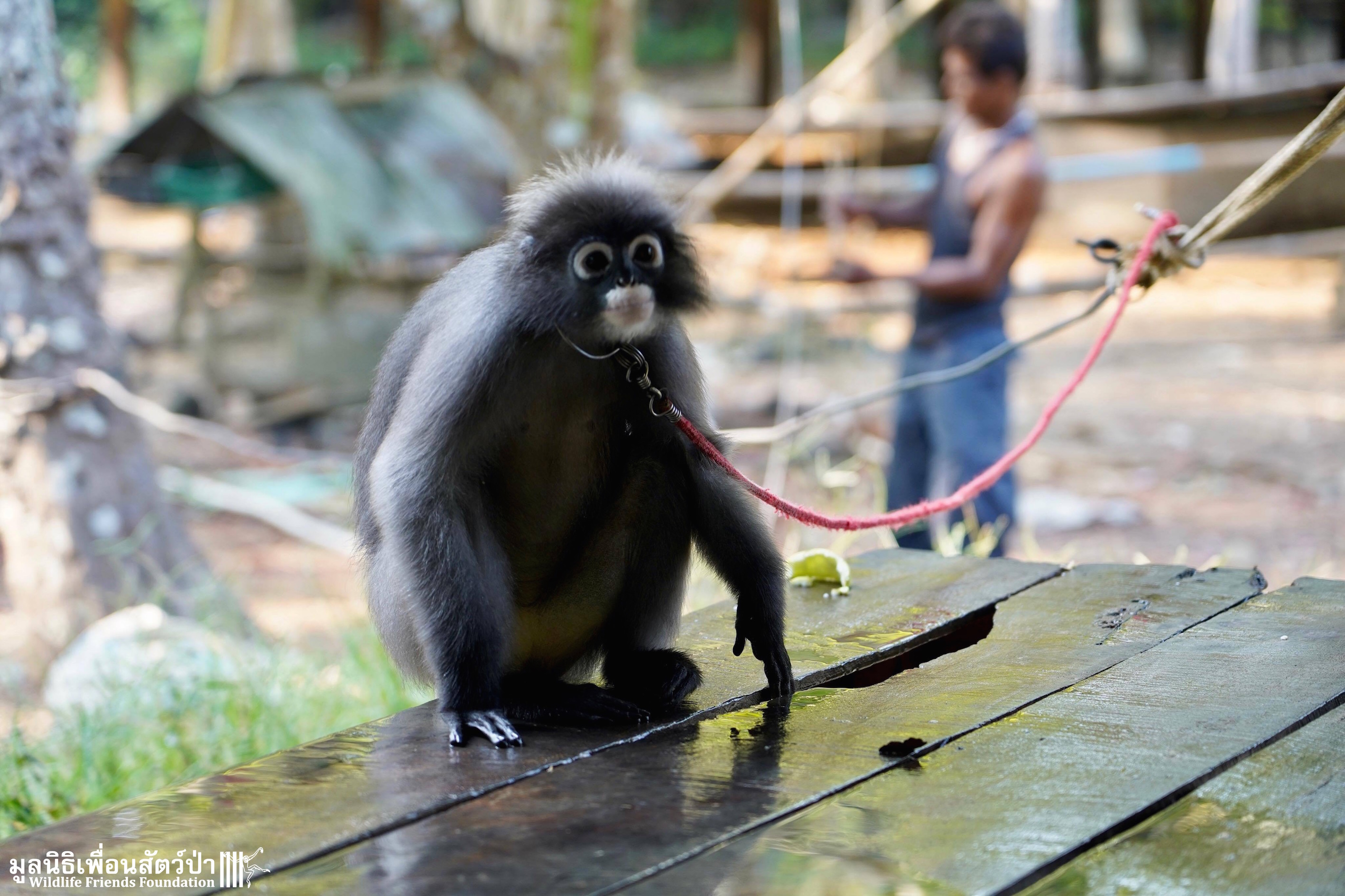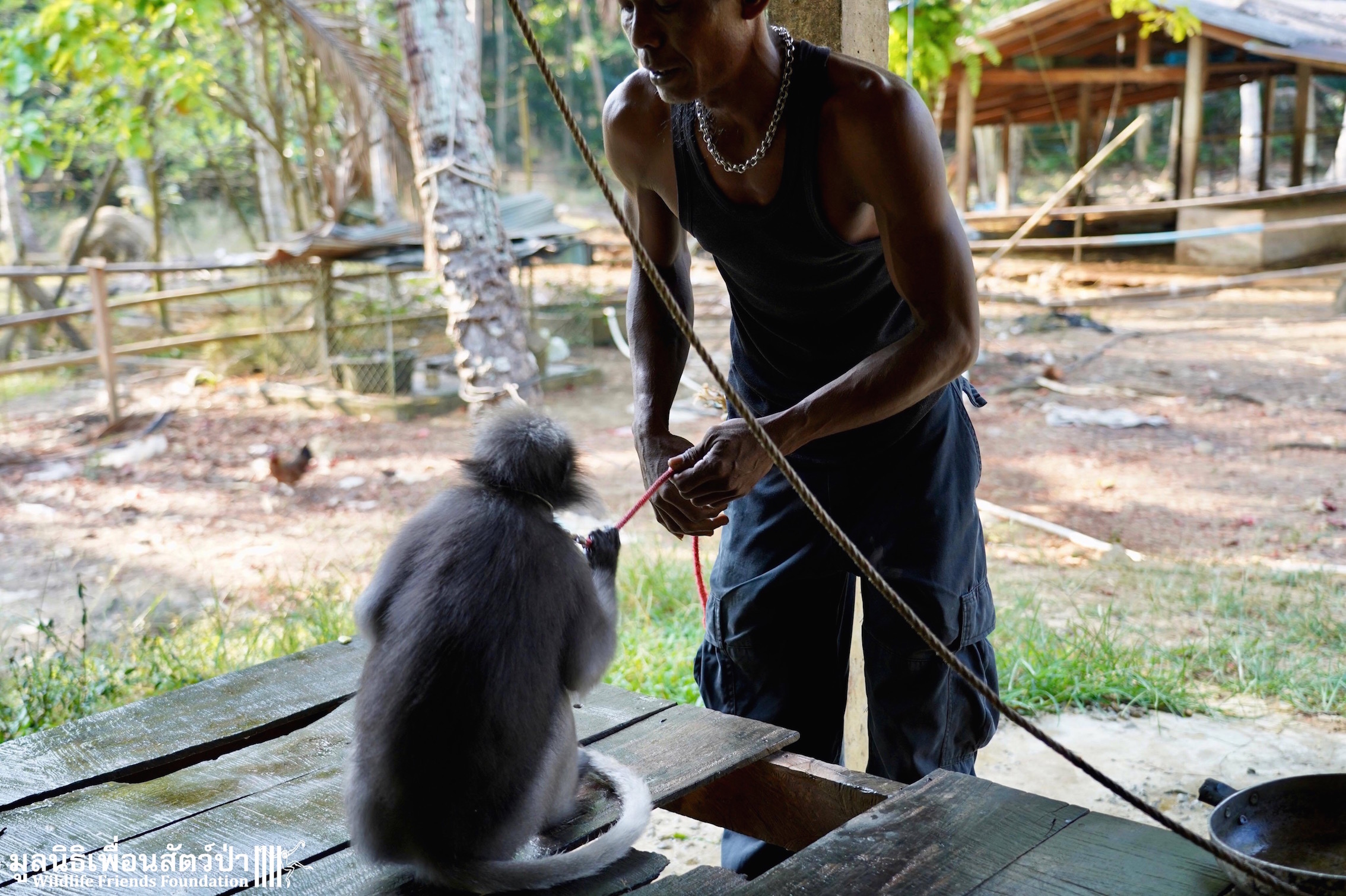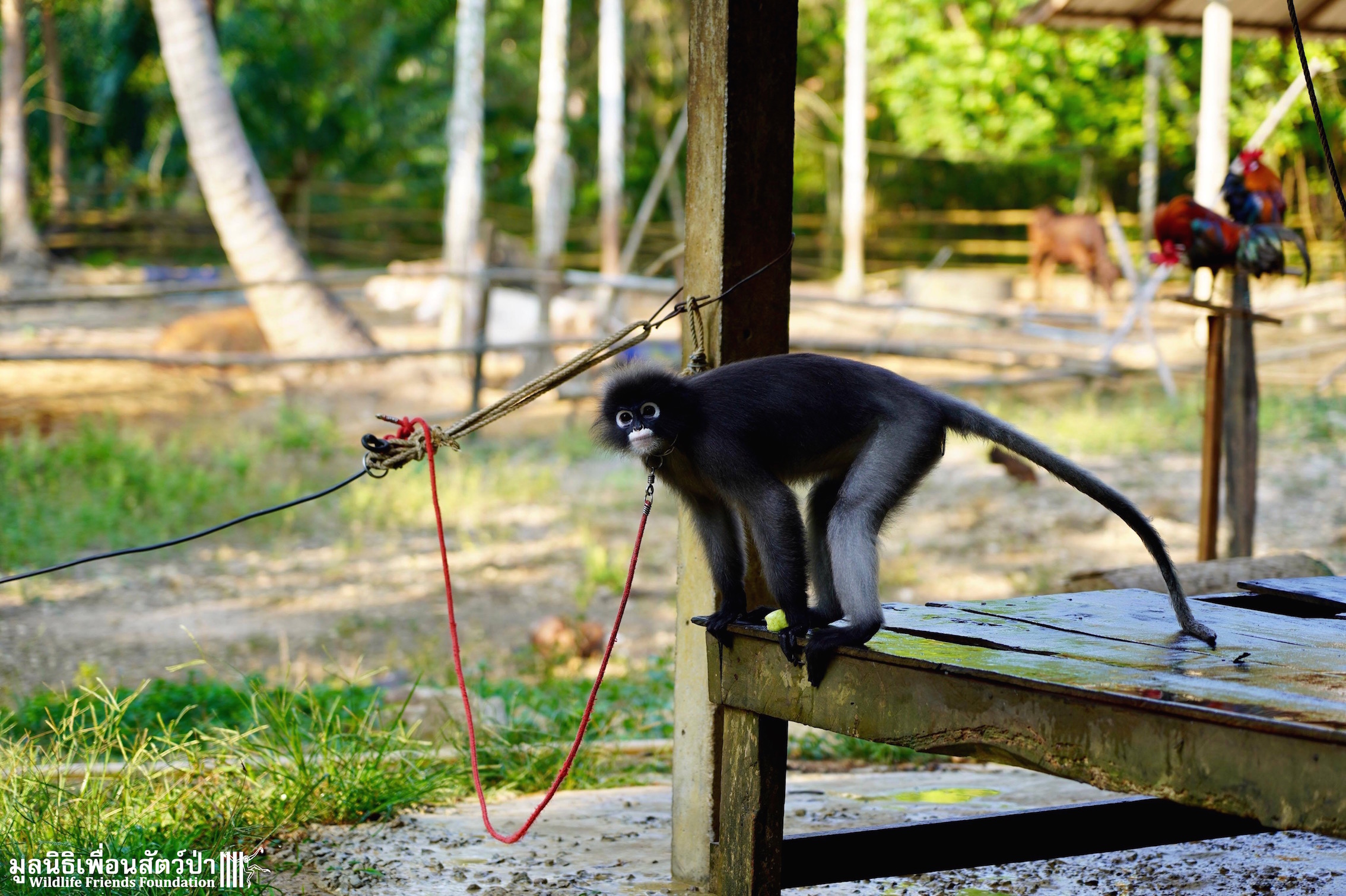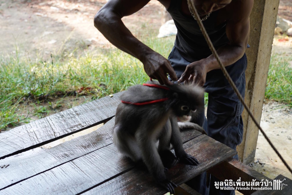 The first location was a small farm 30 minutes south of the city of Chumphon in a very rural location. There the team found a family of traditional farmers with a variety of caged and chained animals. Their target was a female Dusky Langur. About 3 years of age she had been kept as a pet since she was a baby. Living beside several Northern pig-tailed macaques (Macaca leonina) who were kept to harvest coconuts she was kept on a small leash. Unable to climb or mix with her own species she had become very nervous and was clearly exhibiting stereotypical behaviours. The team wasted no time placing her in a transport cage to remove her from this living hell.