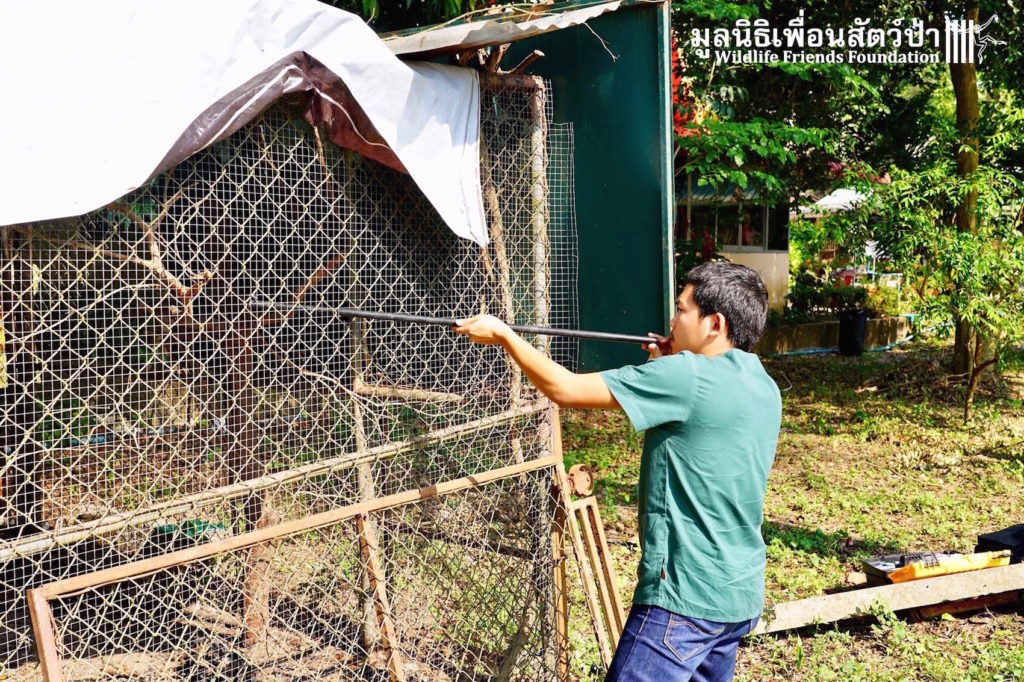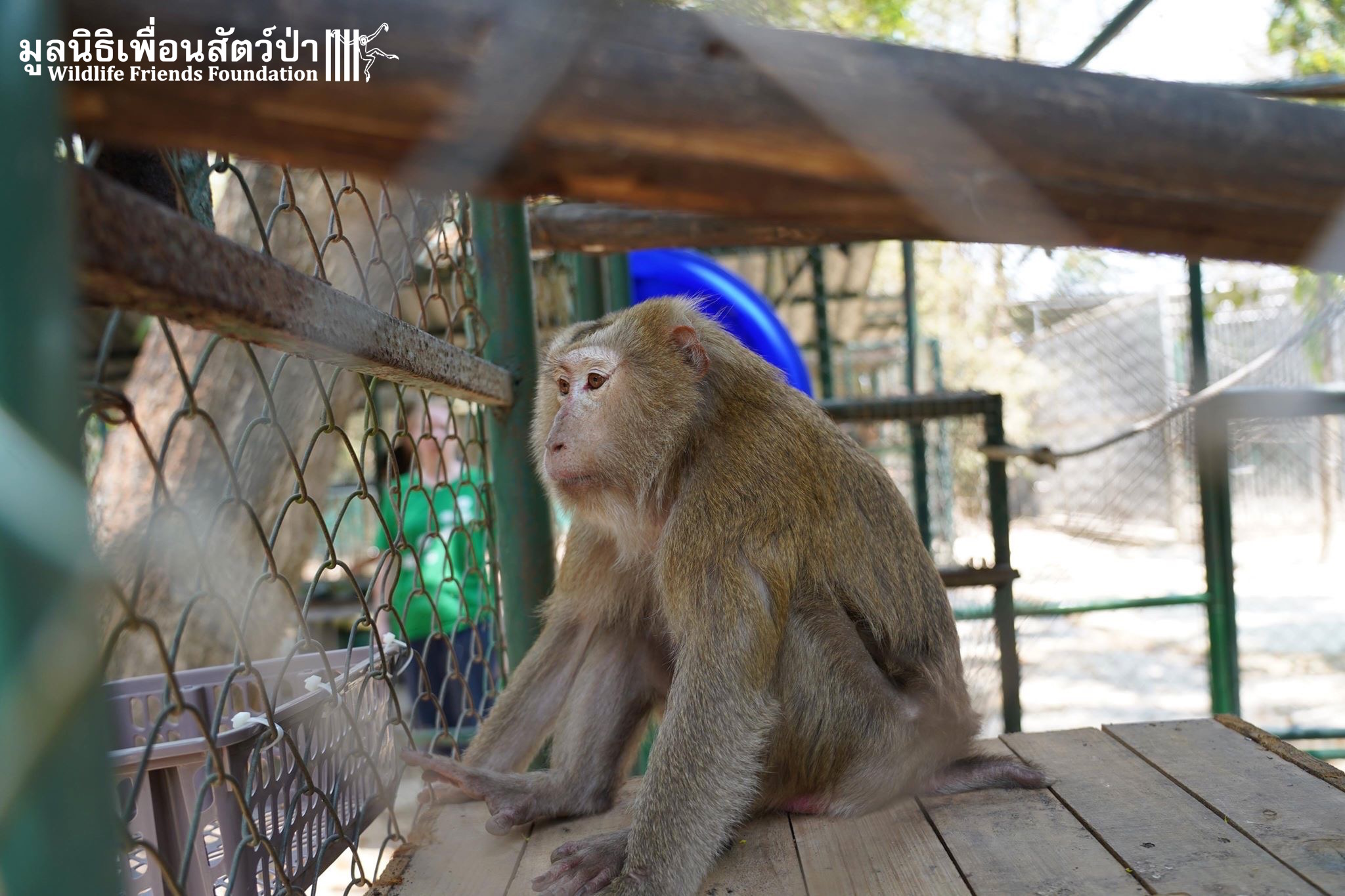 As they can inflict severe injury and major damage to property they were captured and placed in a cage at the temple. However as they were not a natural pair the smaller female was constantly being intimidated by the presence of the male and this caused her severe stress. The small cage offered no enrichment for the two and was somewhat dilapidated and dangerous. It also could not be cleaned so was becoming more of a heath risk the longer they spent there.