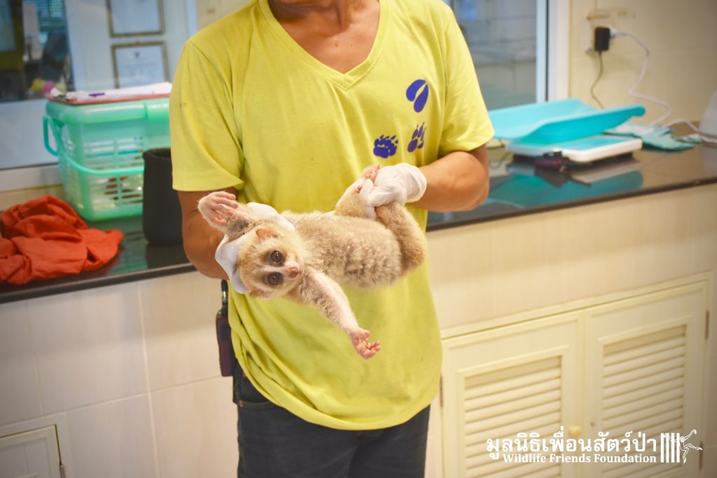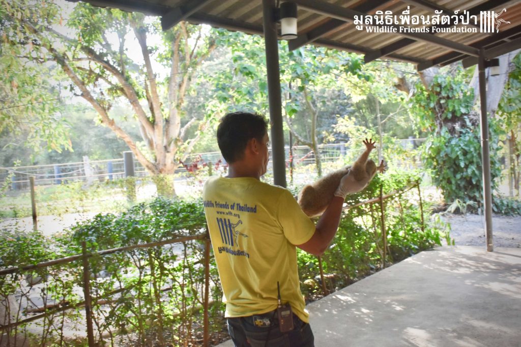 A few days ago 2 new residents, Ling-Ling & La La arrived at the WFFT Wildlife Rescue Centre. These rather large Bengal slow lorises (Nycticebus bengalensis) were previously kept as pets. The first owners were Russian ex-pats who had illegally purchased them. They initially had a male and female (Ling-Ling), who had a baby (La La), one day while being let out in their garden the male loris disappeared. One year ago the owners left the country to go back home and needed to find a solution for the loris. Ling-Ling and La La were then handed over to some friends of friends who then cared for them until contacted WFFT for help.