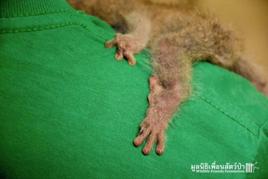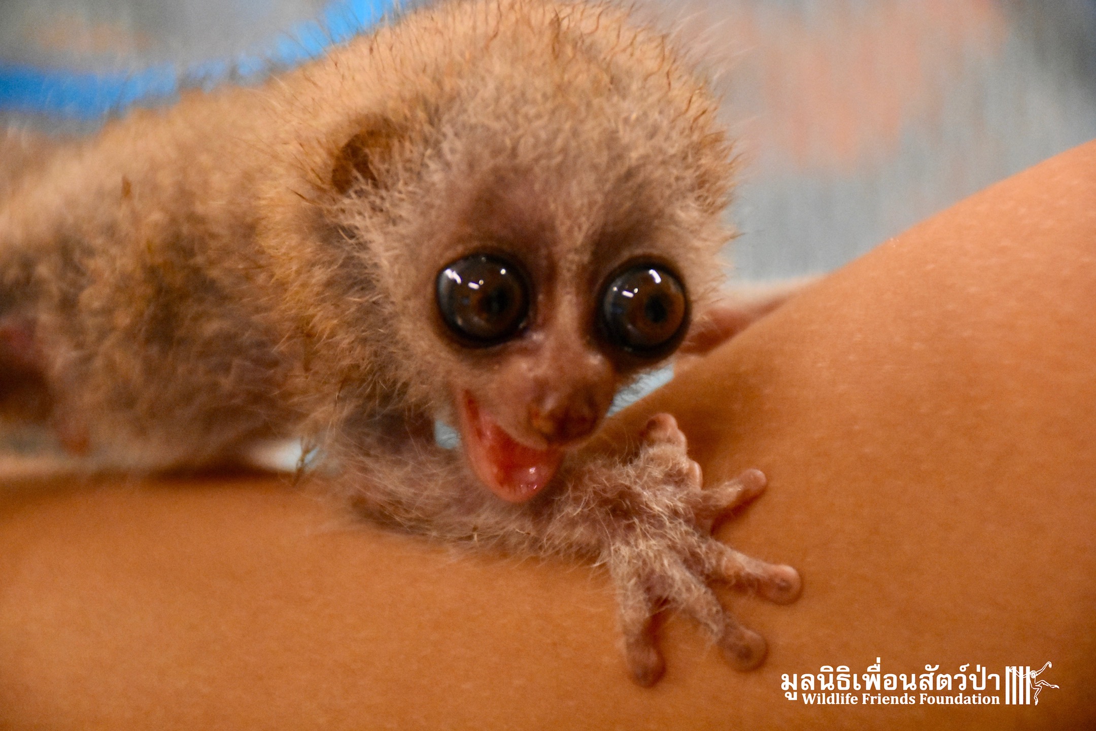 Over the past few weeks we have had numerous infant slow loris brought into the WFFT Wildlife Rescue Centre. A few days ago this little one was found in a basket outside a 7/11 store and was picked up by a tourist and brought to us. This small male Bengal slow loris (Nycticebus bengalensis) is only a few weeks old and will have been poached from the wild to be a pet.
