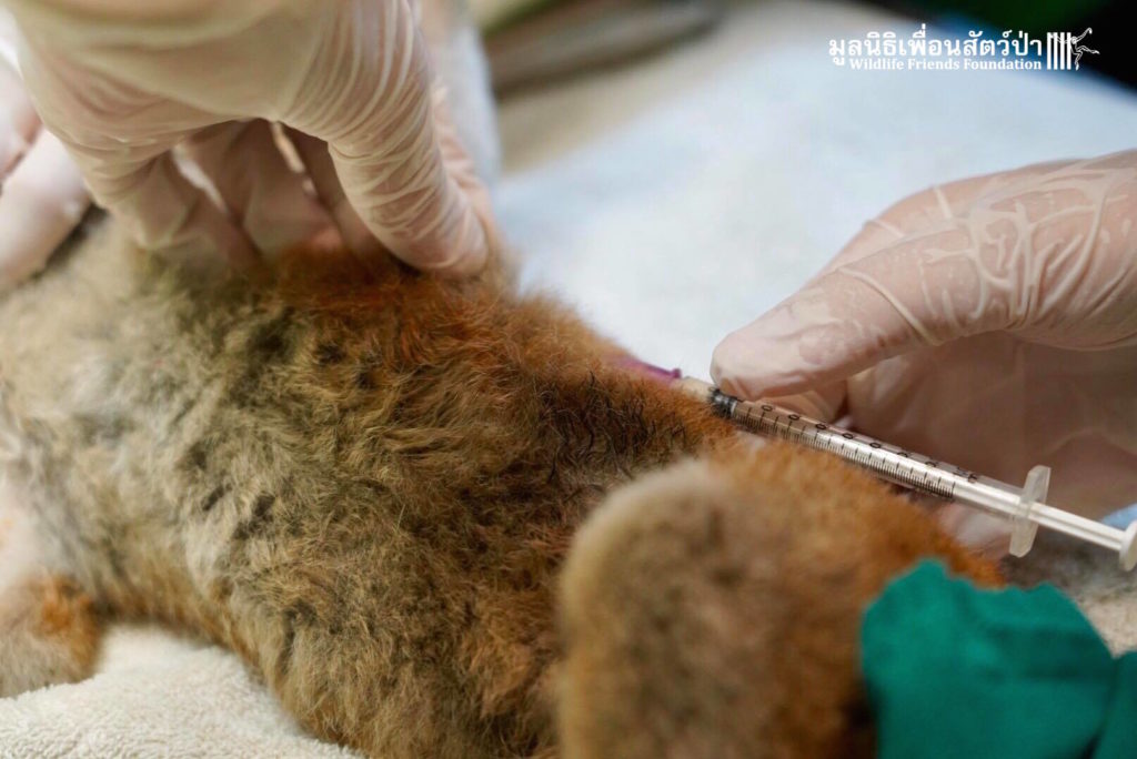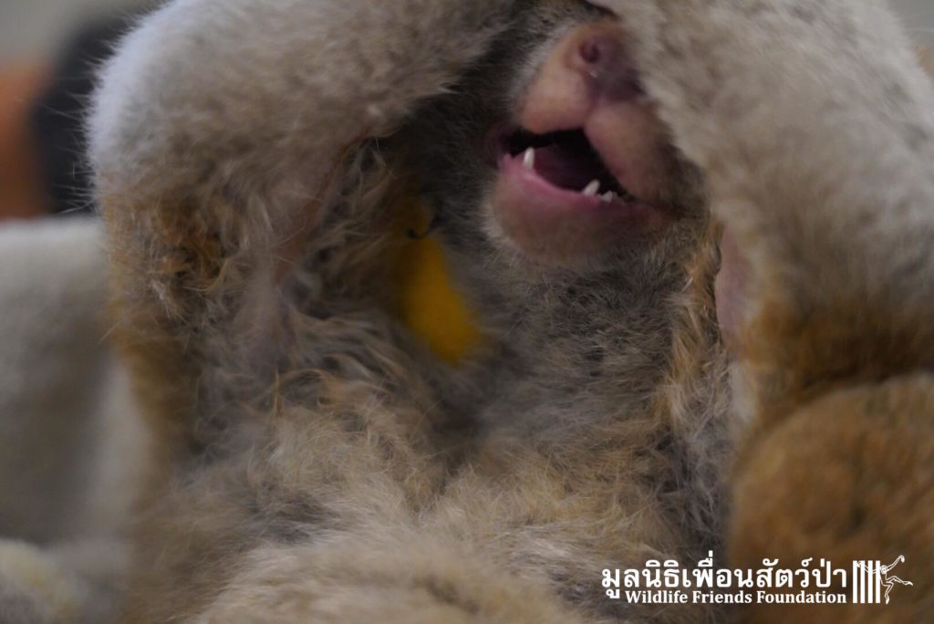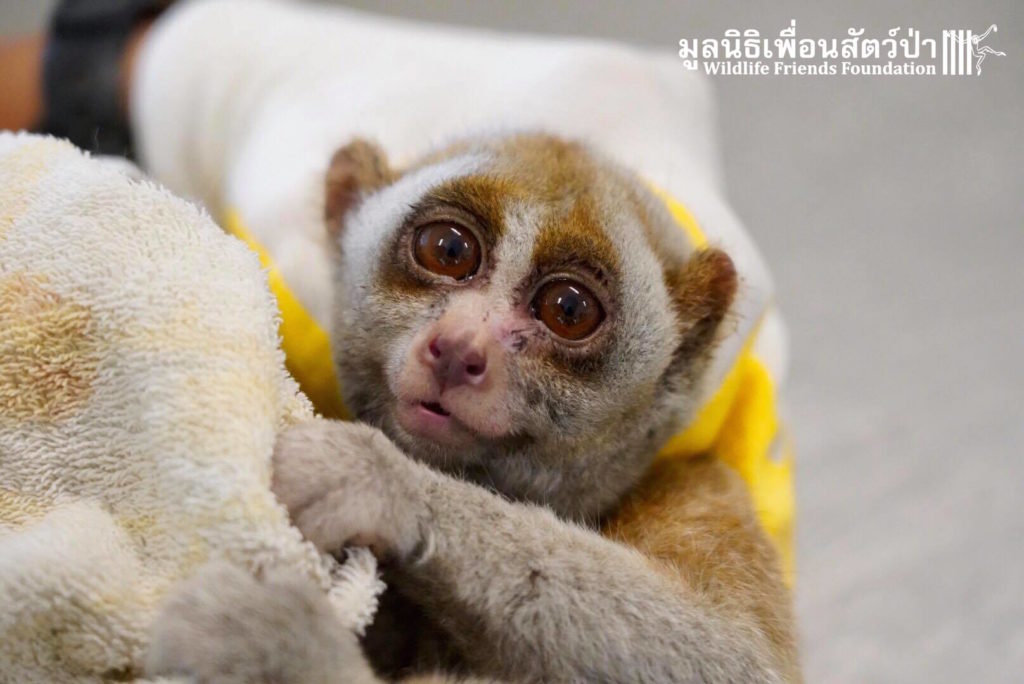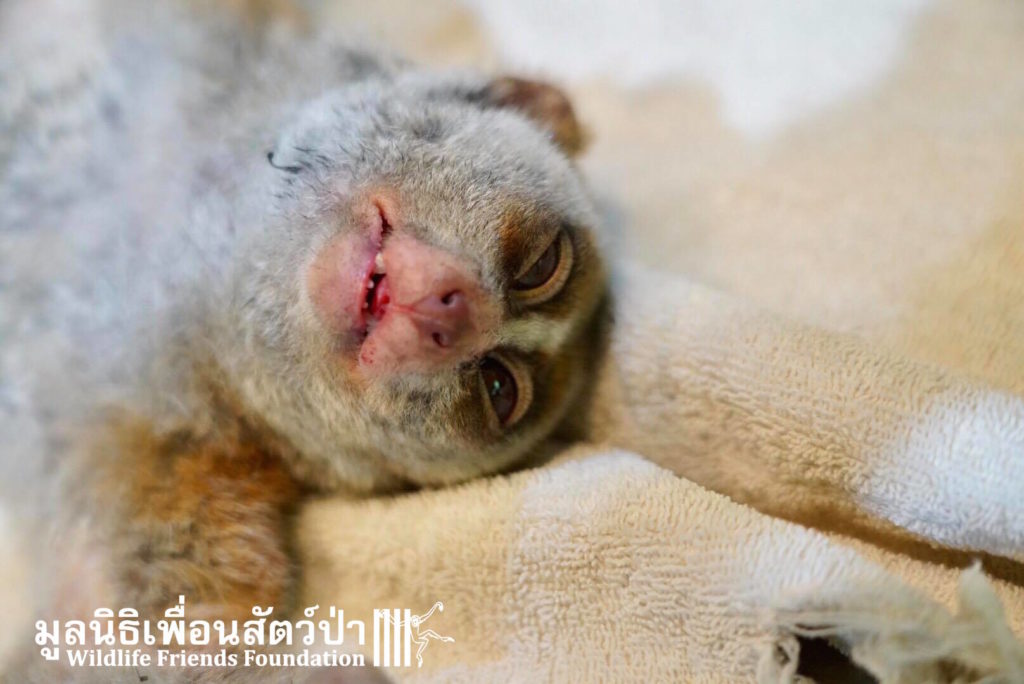 This week we got a got a call that a Slow Loris had been found in Bangkok. A driver was immediately dispensed to pick up this wayward animal from the concrete jungle. On arrival at the rescue centre they discovered a large Bengal Slow Loris in good condition and not as afraid of humans as we would expect. It was discovered he had a rotten upper canine tooth root. The tooth had been clipped at some point to try to make him more suitable as a pet: but only one! Usually all 4 canines are clipped as the loris can inflict a painful bite that can be venomous. This clipping is extremely painful and can result in infections that can be fatal. We have no idea why only one tooth was clipped in this case and how he came to be free in the city but he has had surgery to remove the infected root fragment and is responding well to treatment. Slow lorises are commonly kept illegally as pets. They are solitary nocturnal animals with specialist dietary requirements. They may look cute in photos with their massive eyes but those eyes are designed to see in the dark and are damaged when exposed to bright sunshine. They have developed special glands in their elbows, which they lick. Mixed with saliva this produces a toxin, which can cause an anaphylactic reaction in some people when bitten. We may never find out what has happened with particular loris to be found in such an alien environment but we can guarantee his future will be a bit kinder to him. We have named him Donald. Following treatment and rehabilitation we hope that he can be released back to the wild where his species is in serious decline.