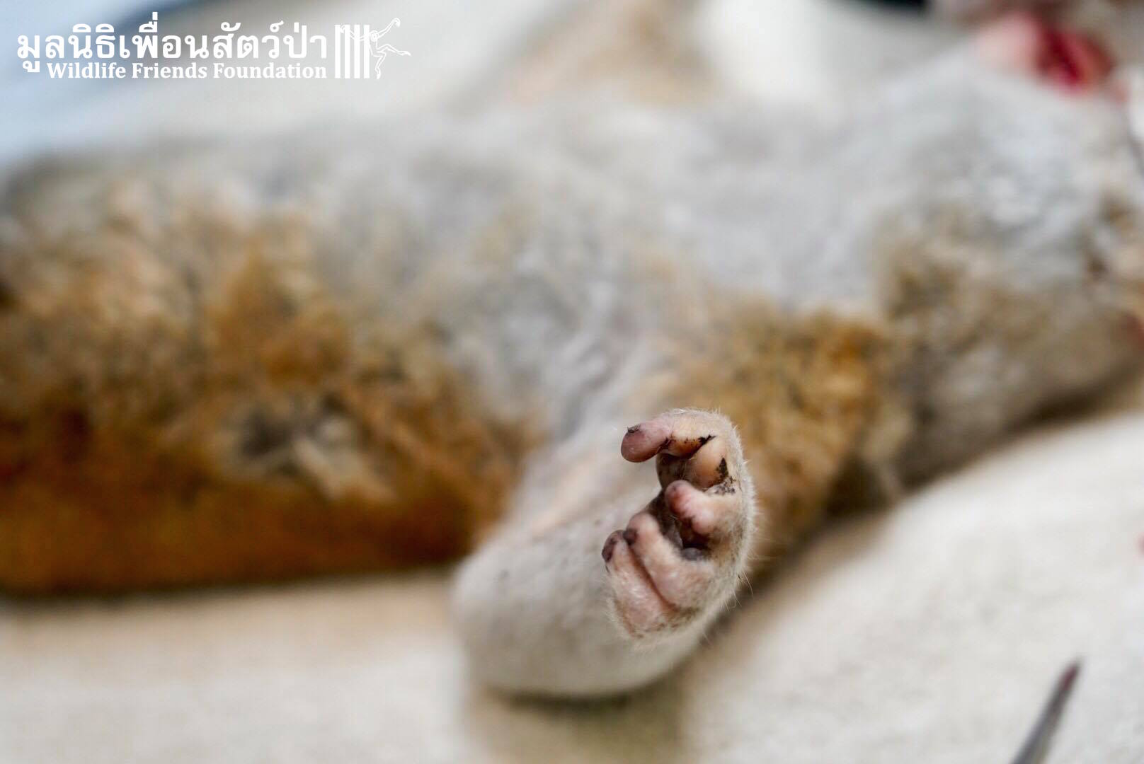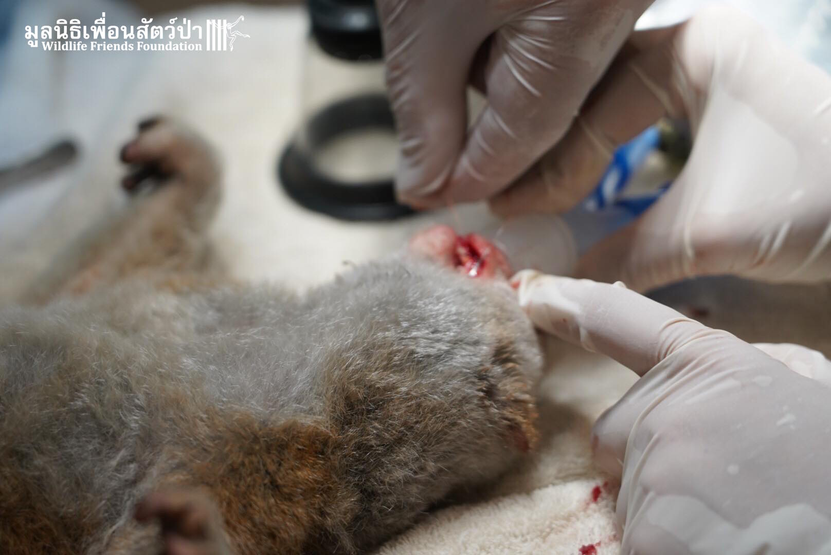 This week we got a got a call that a Slow Loris had been found in Bangkok. A driver was immediately dispensed to pick up this wayward animal from the concrete jungle. On arrival at the rescue centre they discovered a large Bengal Slow Loris in good condition and not as afraid of humans as we would expect. It was discovered he had a rotten upper canine tooth root. The tooth had been clipped at some point to try to make him more suitable as a pet: but only one! Usually all 4 canines are clipped as the loris can inflict a painful bite that can be venomous. This clipping is extremely painful and can result in infections that can be fatal. We have no idea why only one tooth was clipped in this case and how he came to be free in the city but he has had surgery to remove the infected root fragment and is responding well to treatment. Slow lorises are commonly kept illegally as pets. They are solitary nocturnal animals with specialist dietary requirements. They may look cute in photos with their massive eyes but those eyes are designed to see in the dark and are damaged when exposed to bright sunshine. They have developed special glands in their elbows, which they lick. Mixed with saliva this produces a toxin, which can cause an anaphylactic reaction in some people when bitten. We may never find out what has happened with particular loris to be found in such an alien environment but we can guarantee his future will be a bit kinder to him. We have named him Donald. Following treatment and rehabilitation we hope that he can be released back to the wild where his species is in serious decline.