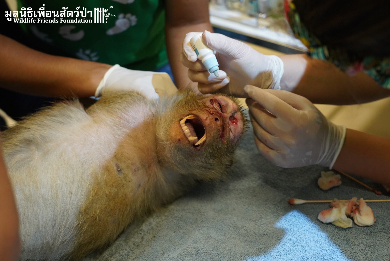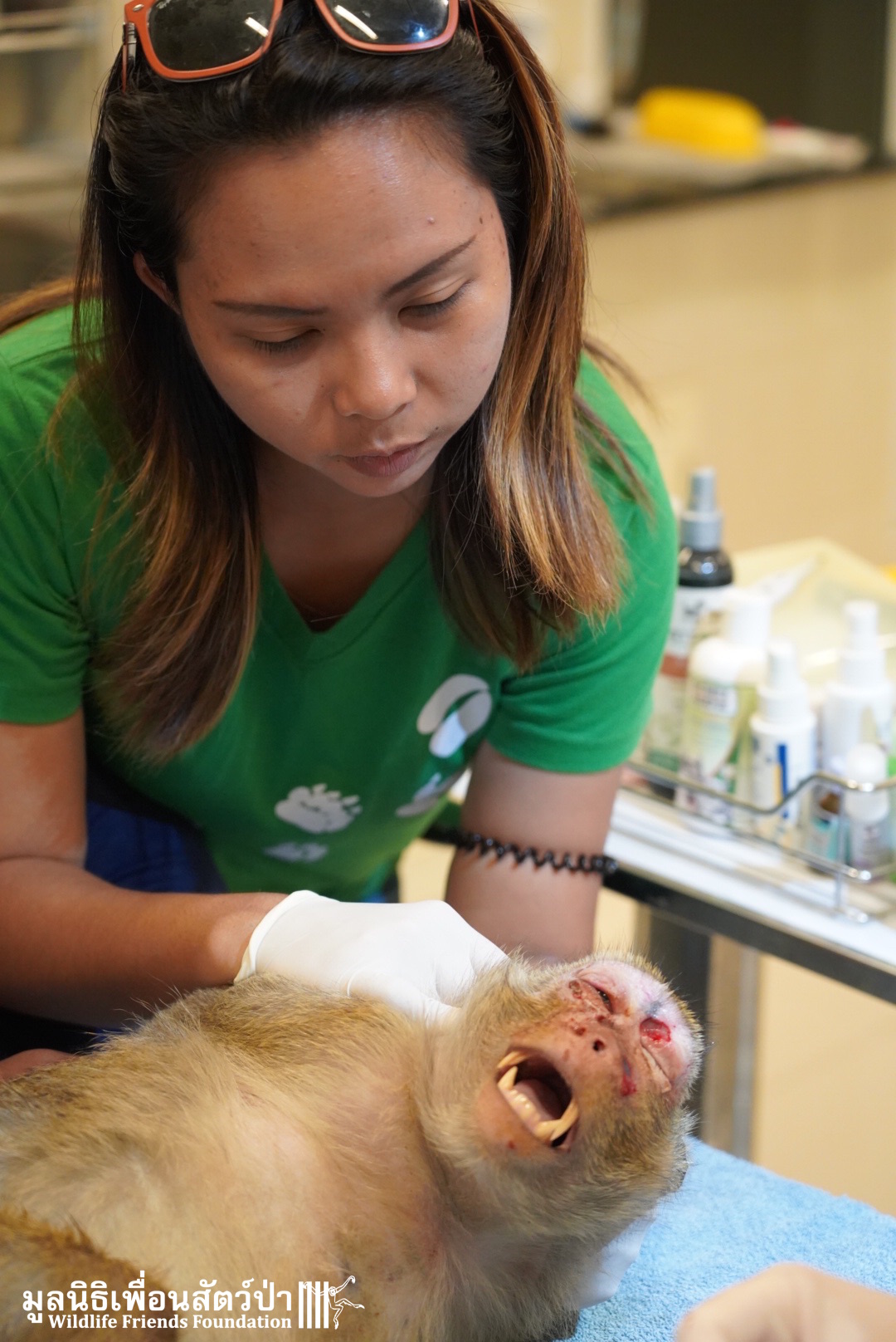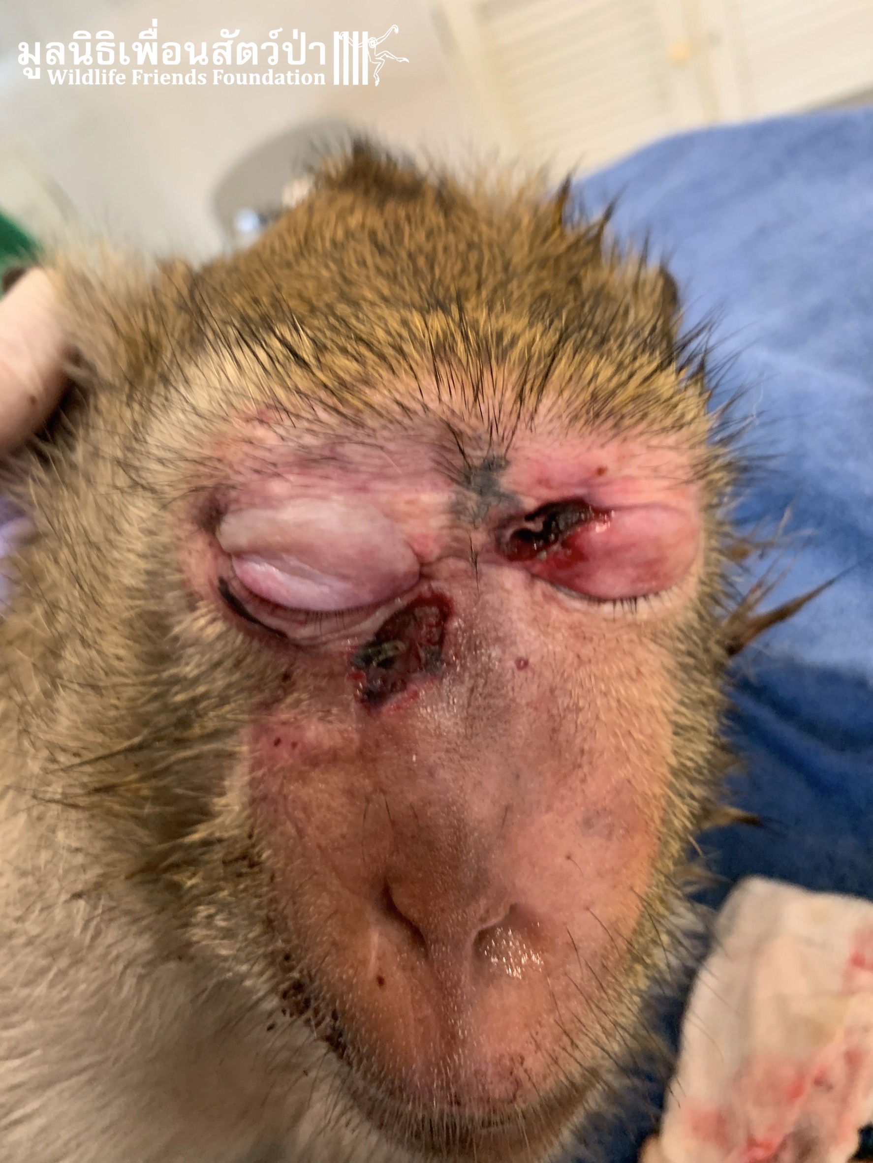 Late on Friday evening the WFFT Vet Team were called to attend an injured long-tailed macaque from an urban troop in Khao Wang, around 40km from the centre. The macaque had an injury to the face and had been found by locals walking about blindly.