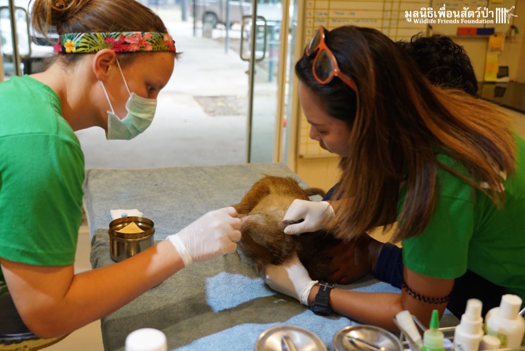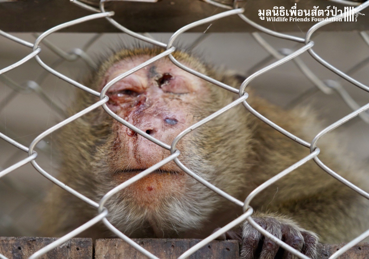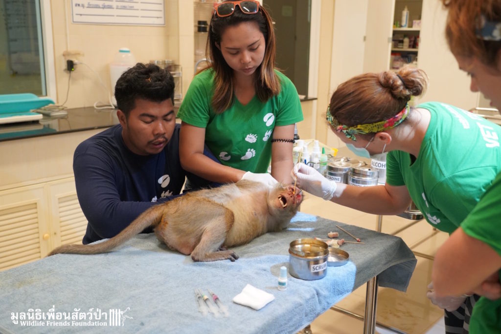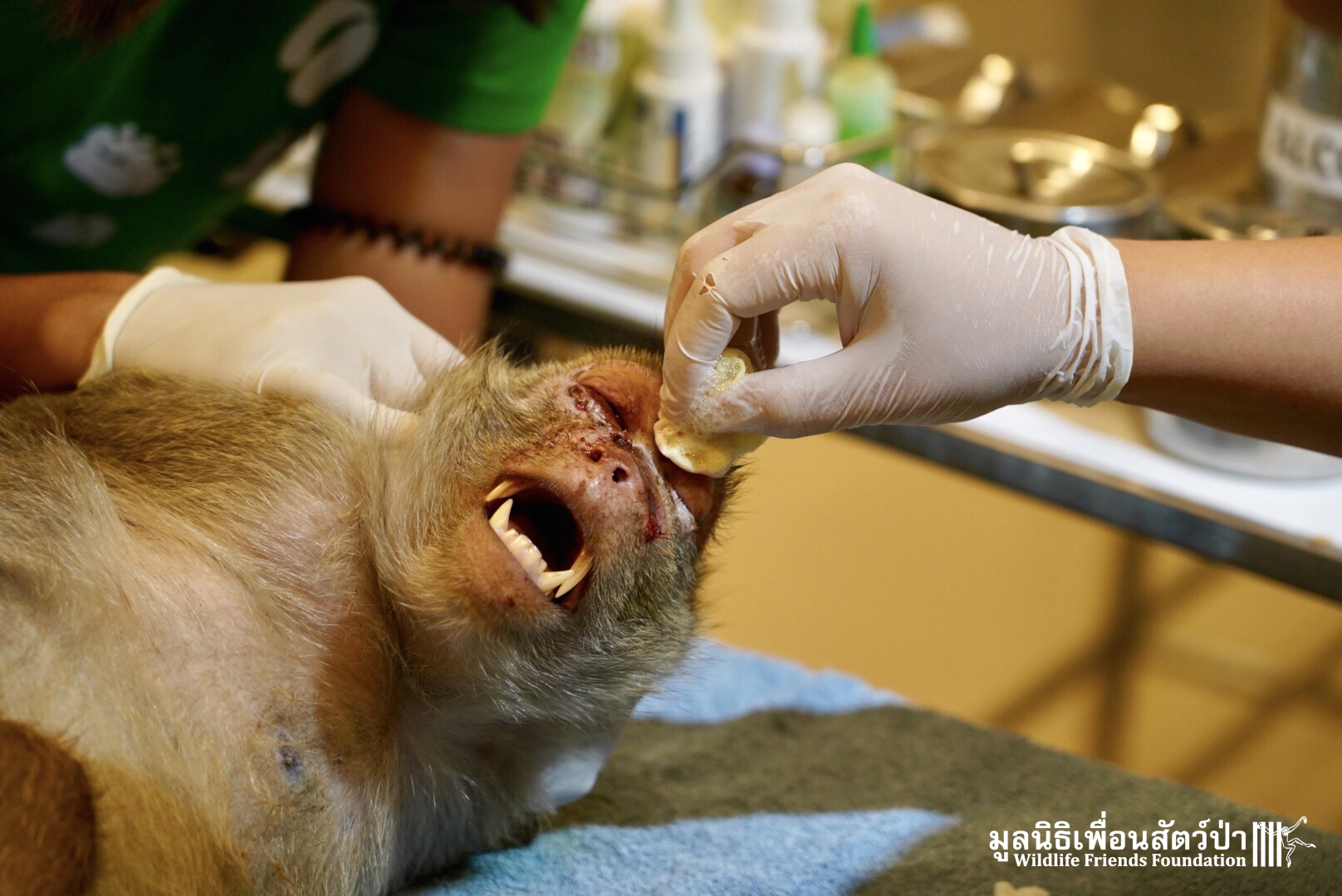 Late on Friday evening the WFFT Vet Team were called to attend an injured long-tailed macaque from an urban troop in Khao Wang, around 40km from the centre. The macaque had an injury to the face and had been found by locals walking about blindly.
