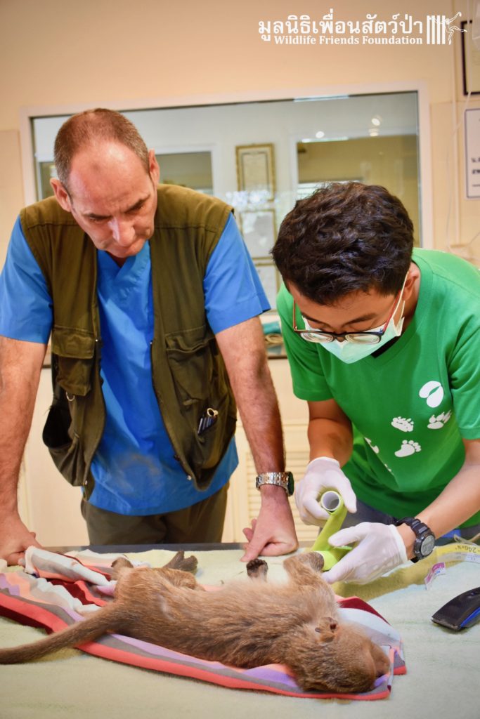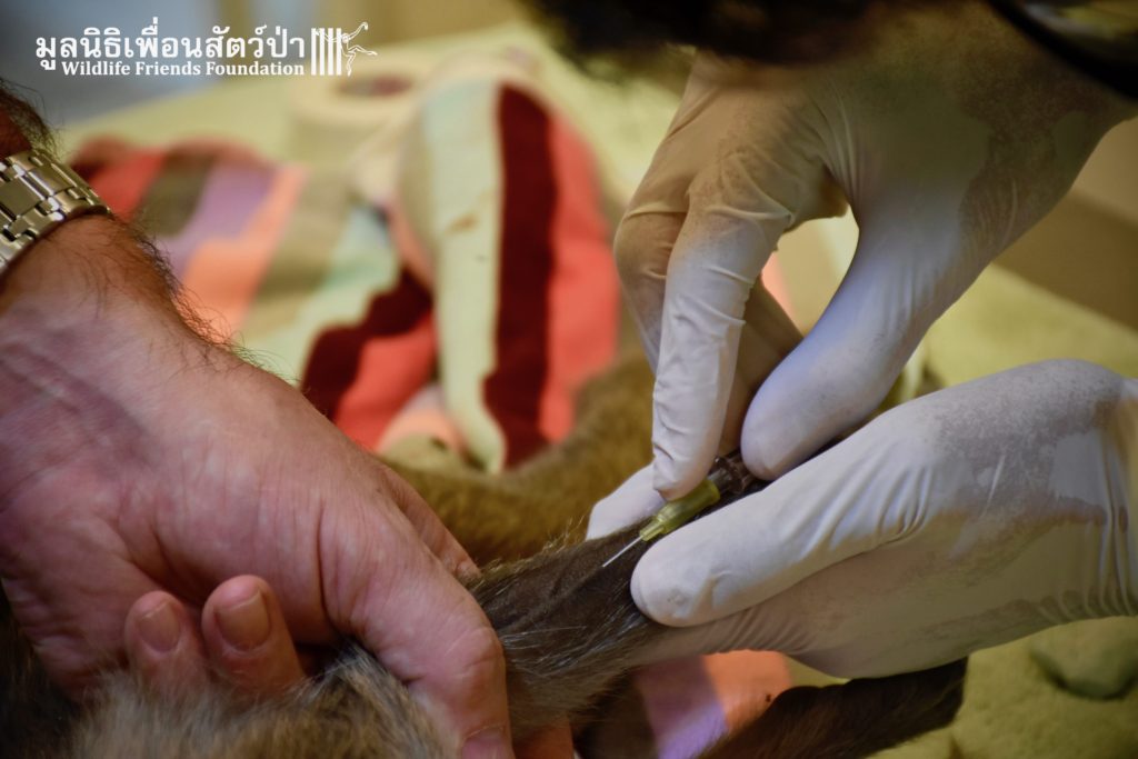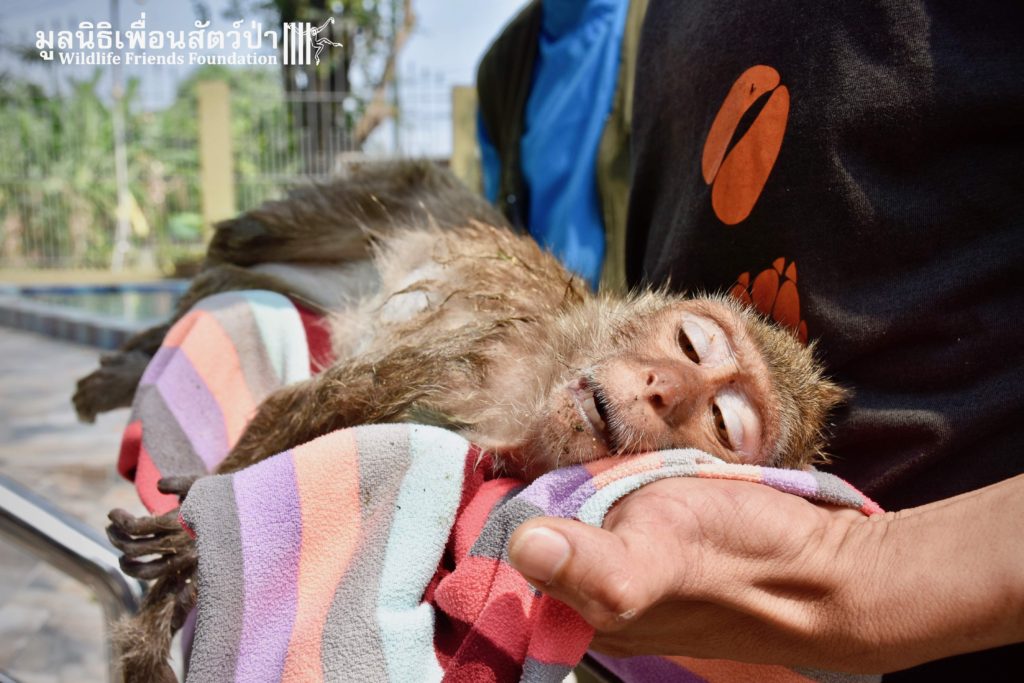 Recently the WFFT Wildlife Hospital Rescue Team were called by a local woman working at Khao Yoi Temple about a female long-tailed macaque who fell from a tree and could not move. The macaque in question had a young infant so the situation was even more urgent. When the Rescue Team arrived on site, they found a poor monkey laying in a gutter. The woman who called us and kept an eye on the injured mother macaque told us the baby was now holding onto another female that we could see walking away with the infant. She was in bad condition. Fast breathing, almost unanimated, the Vet Team decided to give her a light sedative to ensure her safety.