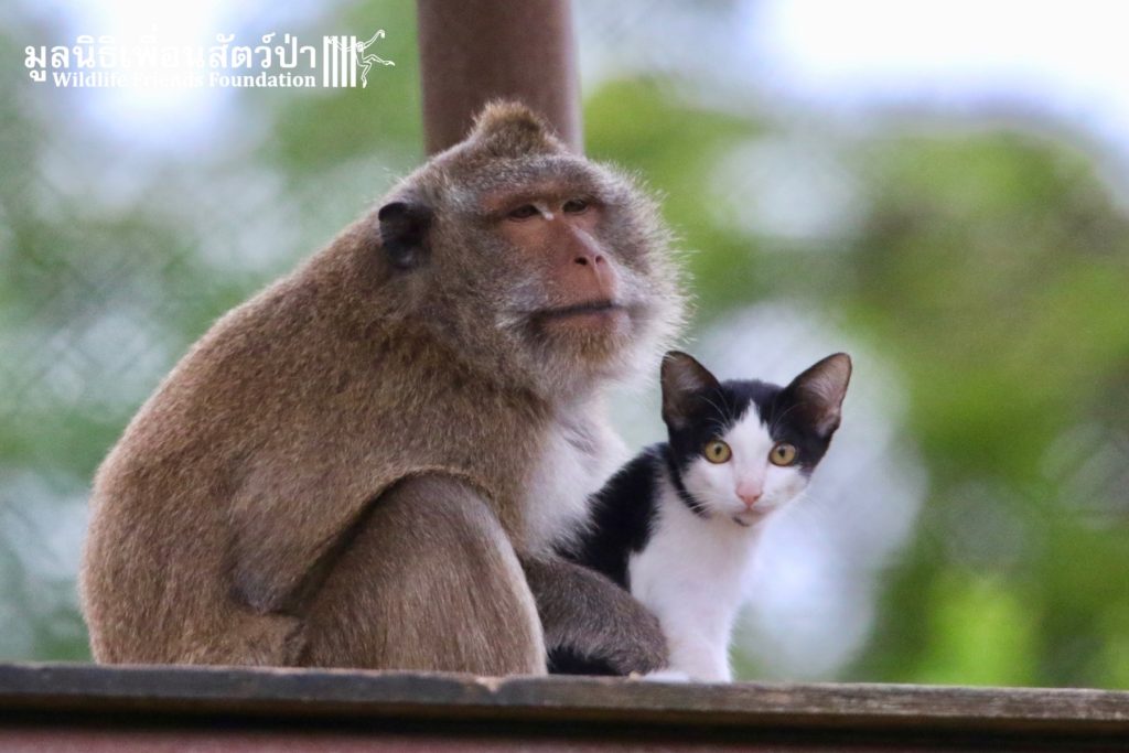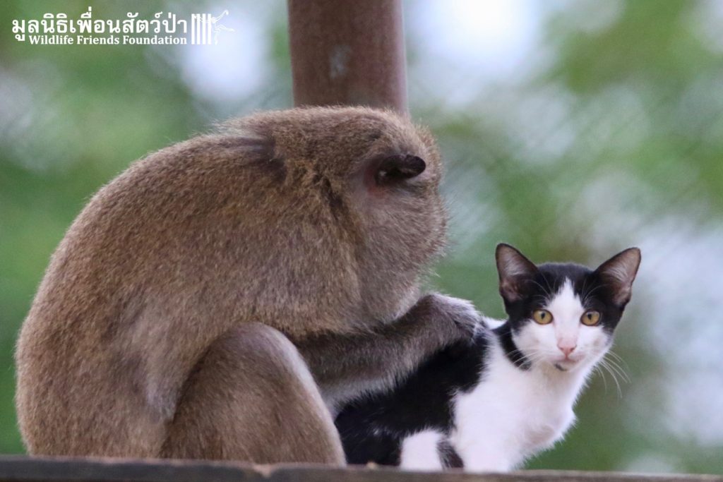 Jo Jo the rescued long-tailed macaque here at the Wildlife Friends Foundation Thailand Wildlife Rescue Centre has found himself a new best friend, in the form of Alan the stray domestic cat. Little Alan appeared in the newlands area a few weeks ago and has taken up residence in the macaque field, he shares food with the macaques. Although this is not an ideal situation and something we do not encourage, Alan is unharmed and Jo Jo seems to love him, so we have decided to leave them together.