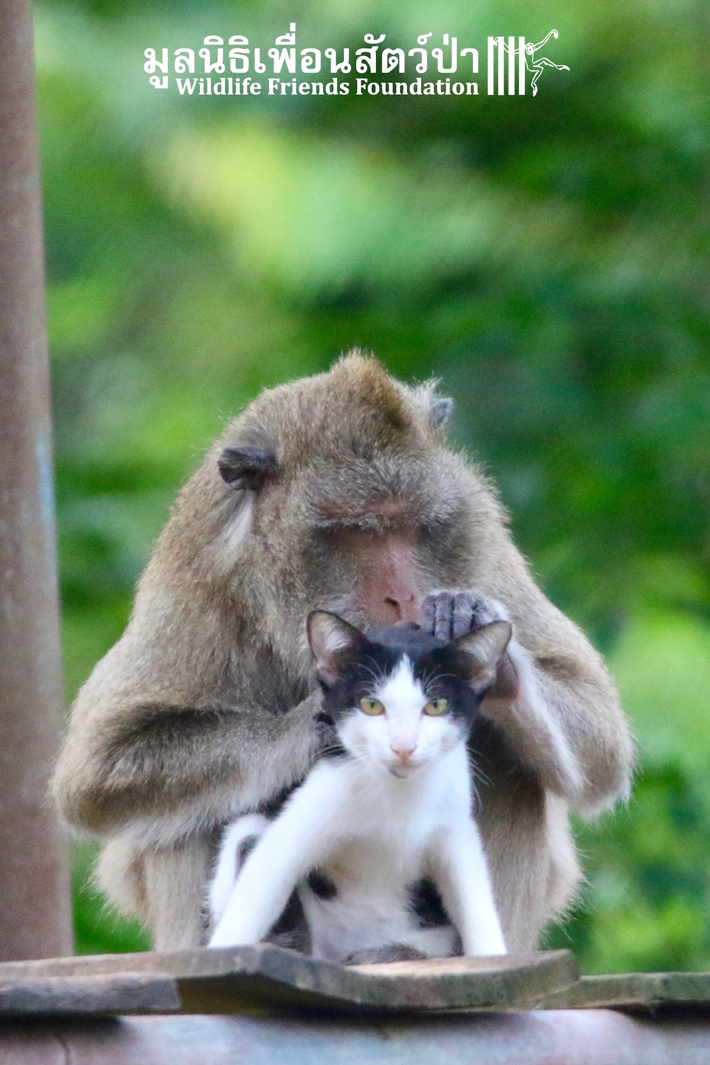 Jo Jo the rescued long-tailed macaque here at the Wildlife Friends Foundation Thailand Wildlife Rescue Centre has found himself a new best friend, in the form of Alan the stray domestic cat. Little Alan appeared in the newlands area a few weeks ago and has taken up residence in the macaque field, he shares food with the macaques. Although this is not an ideal situation and something we do not encourage, Alan is unharmed and Jo Jo seems to love him, so we have decided to leave them together.