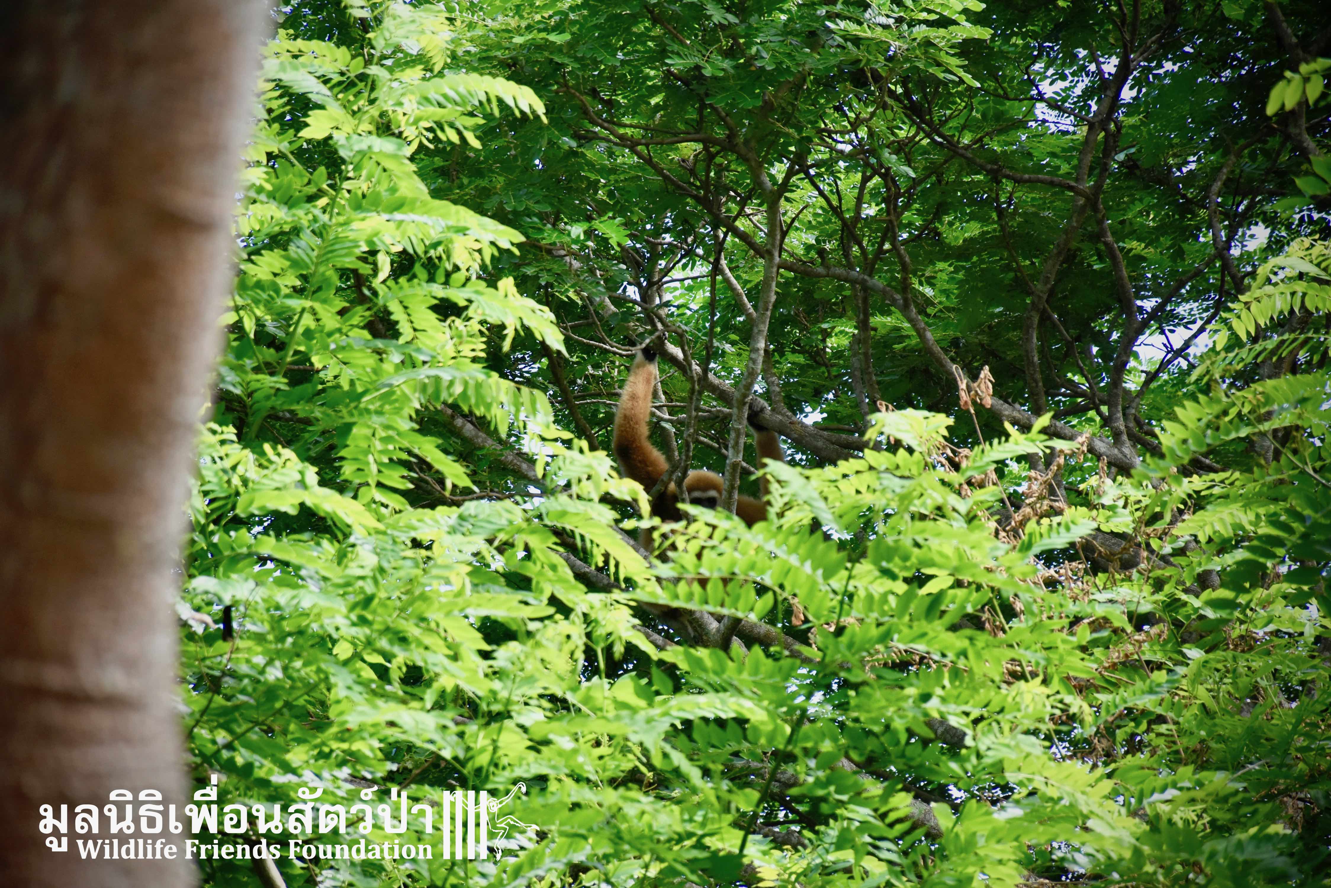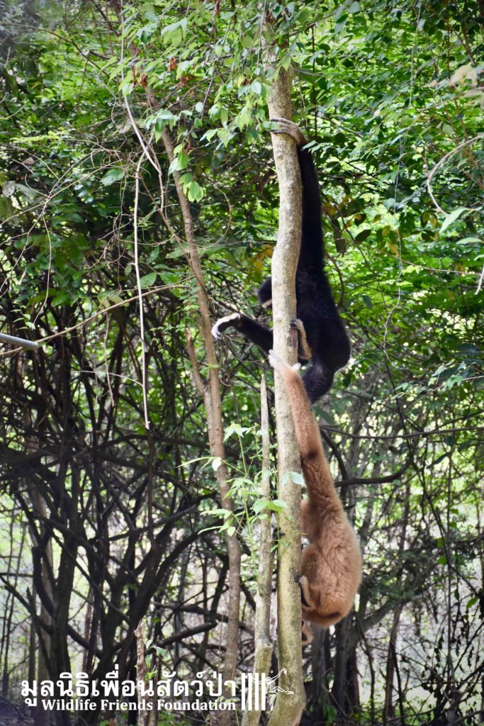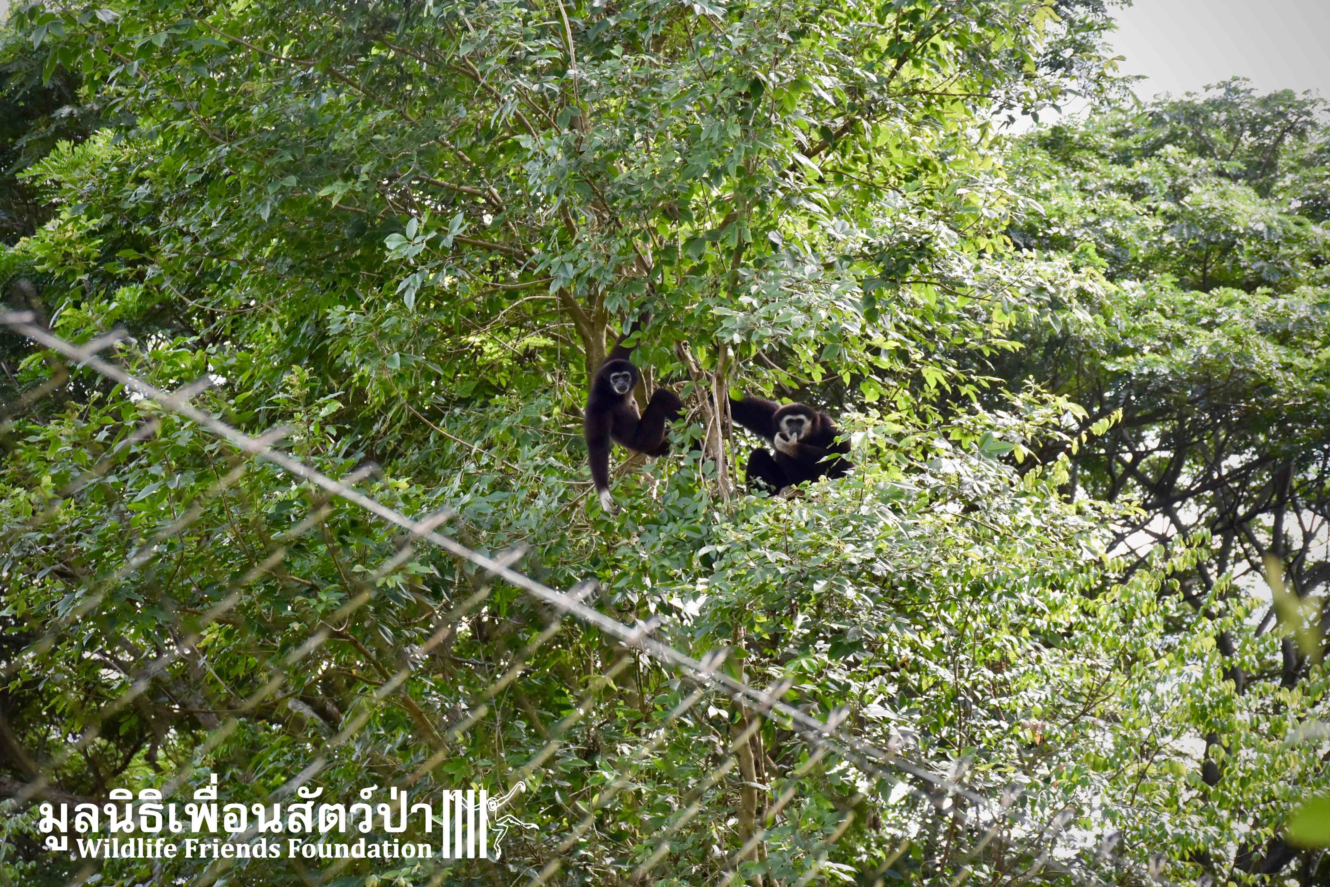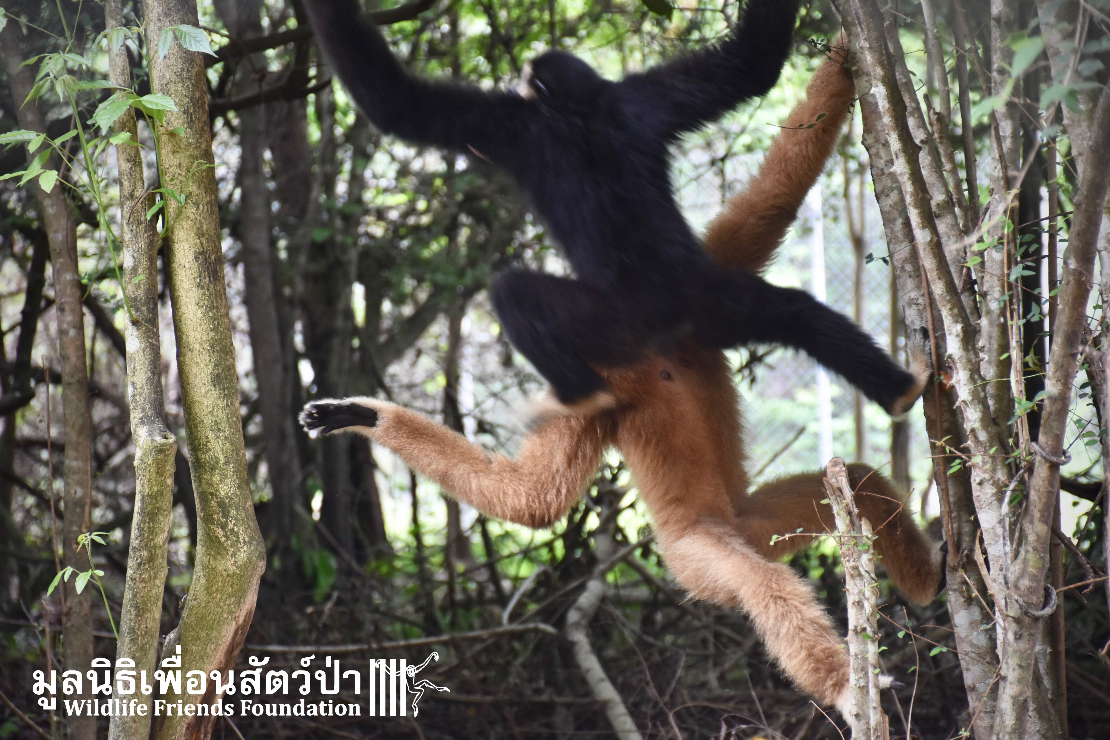 Yesterday two sub-adult white-handed gibbons (Hylobates lar), Oreo and Aung Aing, moved into a huge new forest enclosure where they can swing, sing and sleep in the forest canopy. Both of these gibbons were poached from the wild as very young infants and illegally sold into the pet trade. The female Aung Aing is 5 years old, she was rescued by WFFT in January 2016. The male Oreo is 6 years old and was rescued in June 2012. These special gibbons were hand raised here at the WFFT Wildlife Rescue Centre. Last year they were introduced with the view of them forming a social pair. We try to emulate wild gibbon societies by housing them in male/female pairs. They love exploring their new arboreal home, they especially enjoy climbing high in the tree canopy and brachiating from branch to branch.