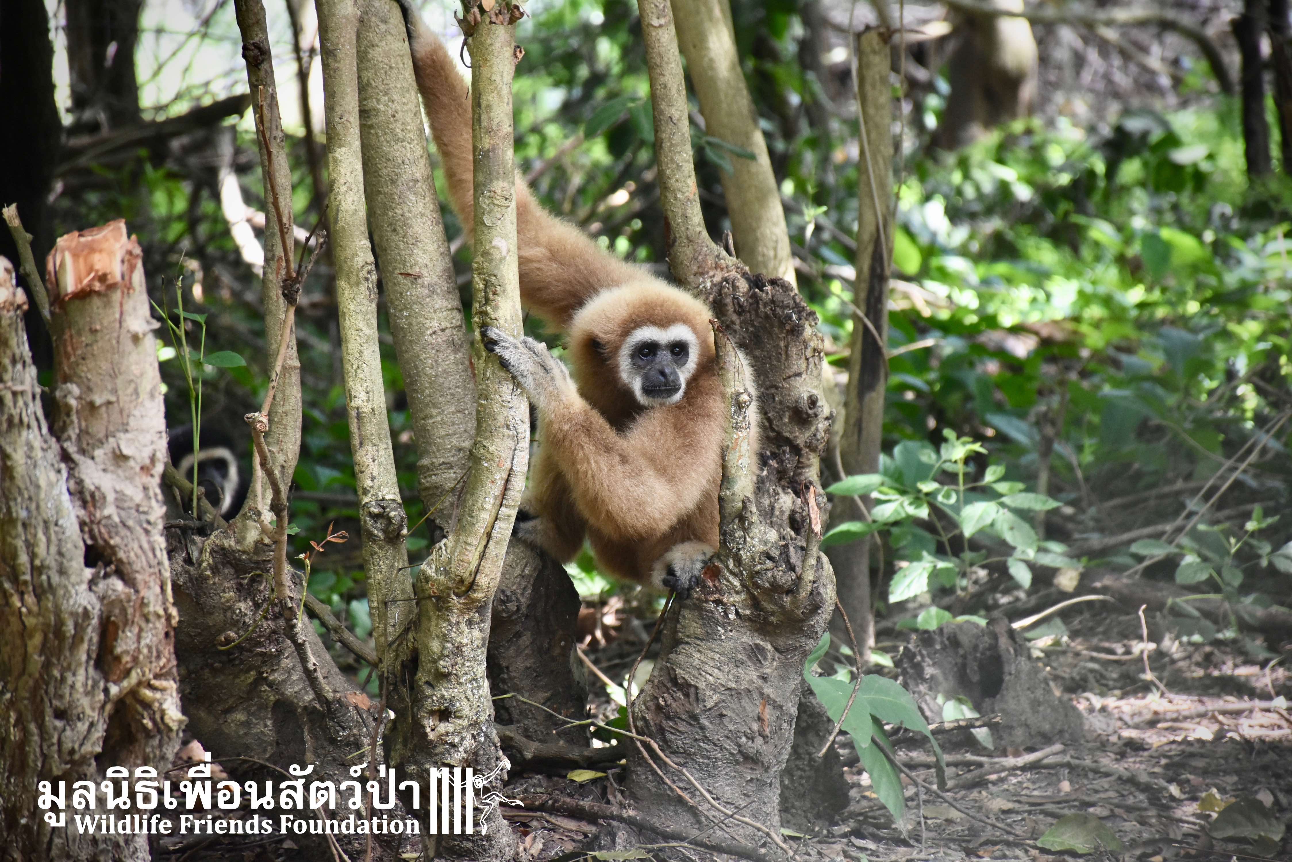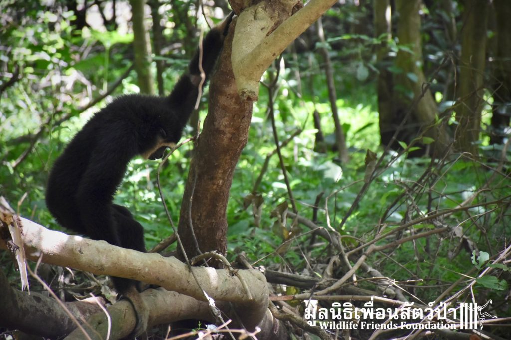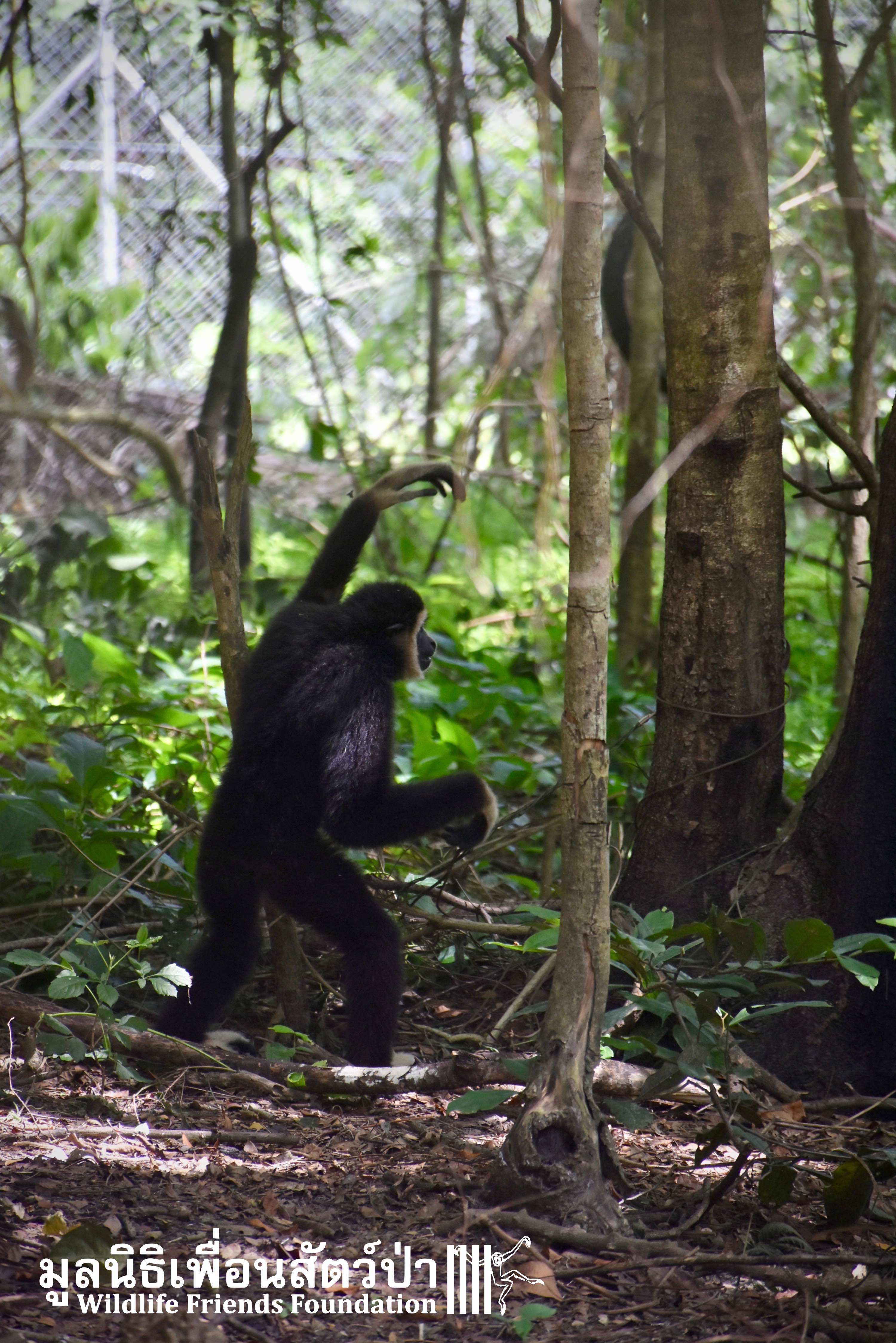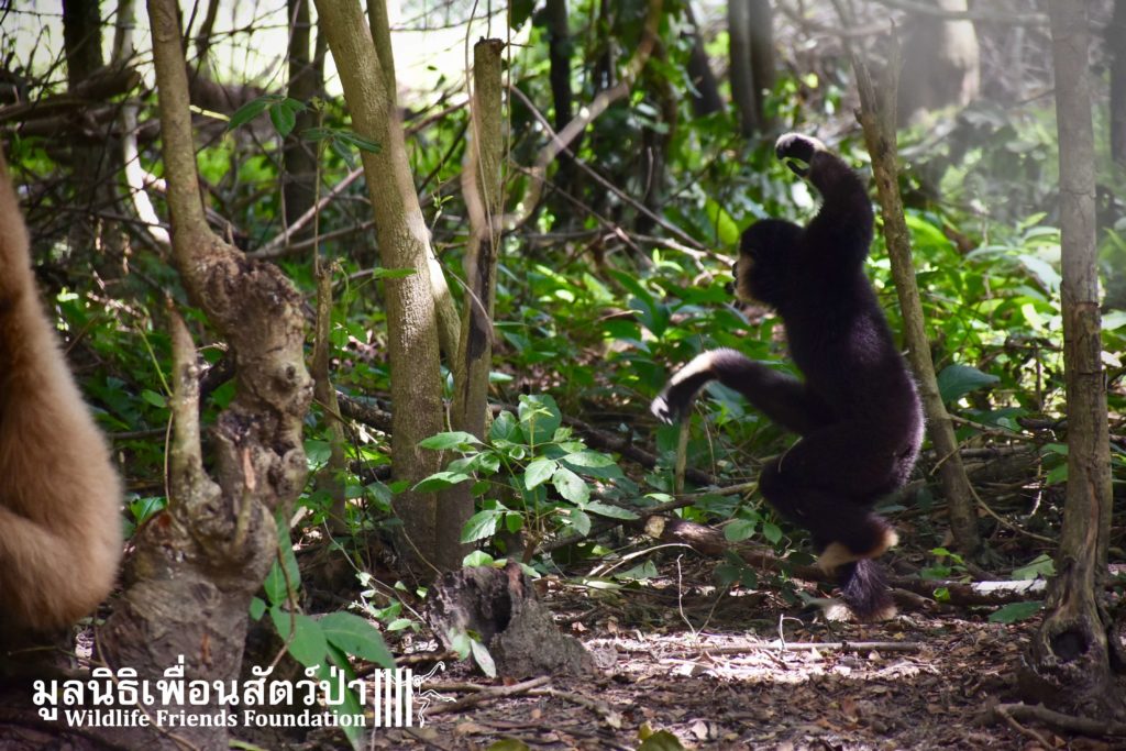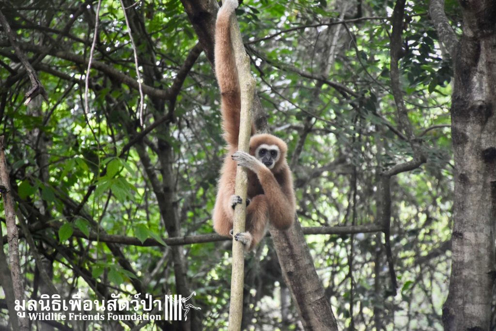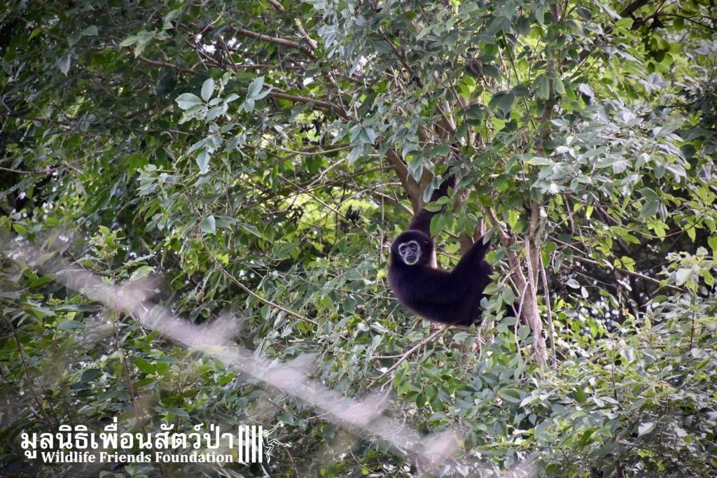 Yesterday two sub-adult white-handed gibbons (Hylobates lar), Oreo and Aung Aing, moved into a huge new forest enclosure where they can swing, sing and sleep in the forest canopy. Both of these gibbons were poached from the wild as very young infants and illegally sold into the pet trade. The female Aung Aing is 5 years old, she was rescued by WFFT in January 2016. The male Oreo is 6 years old and was rescued in June 2012. These special gibbons were hand raised here at the WFFT Wildlife Rescue Centre. Last year they were introduced with the view of them forming a social pair. We try to emulate wild gibbon societies by housing them in male/female pairs. They love exploring their new arboreal home, they especially enjoy climbing high in the tree canopy and brachiating from branch to branch.