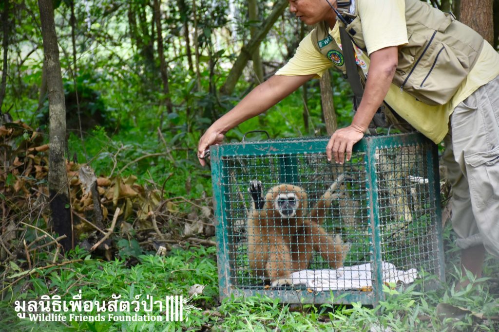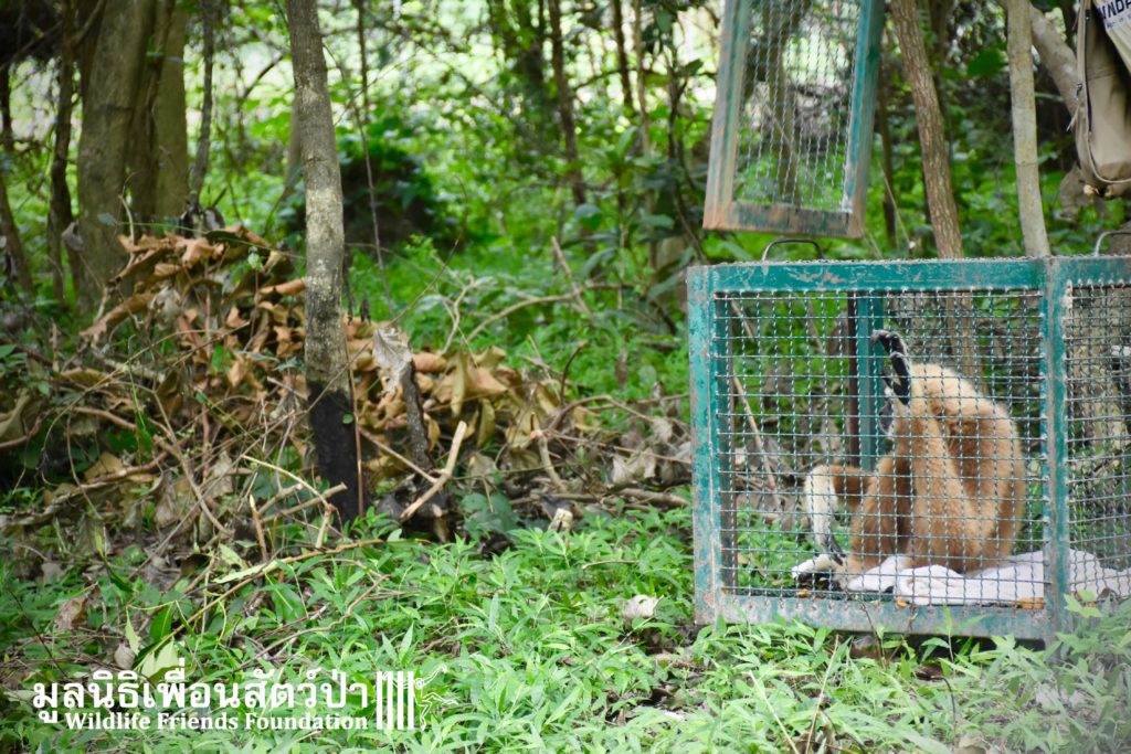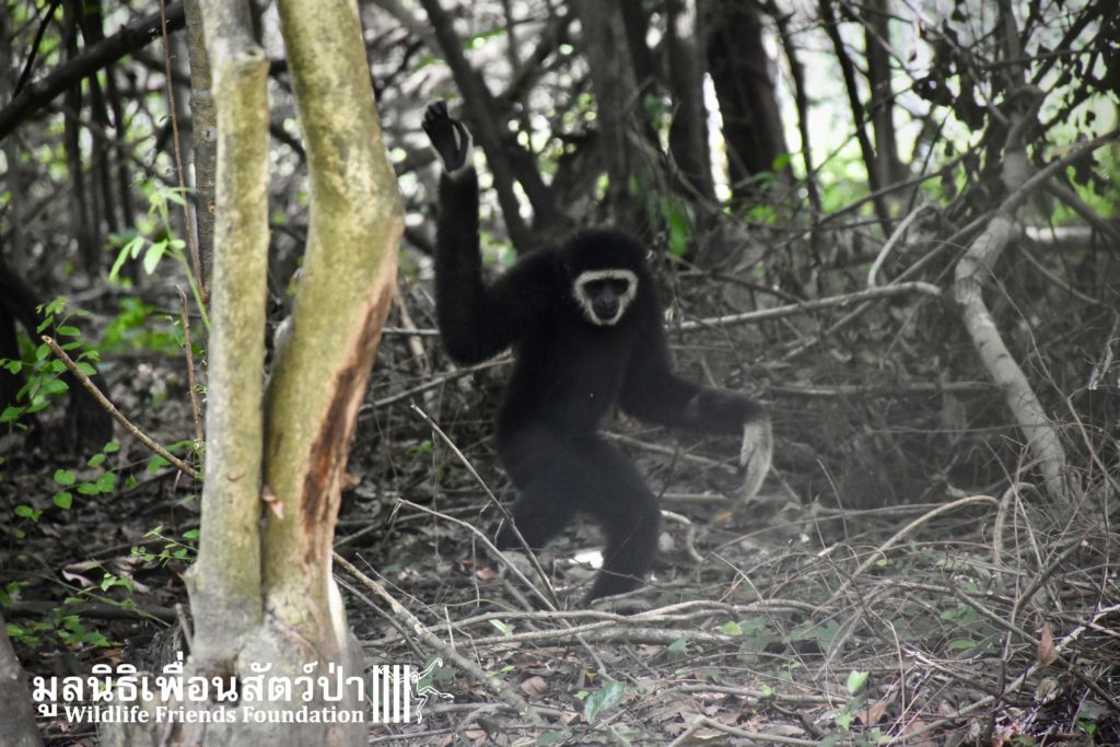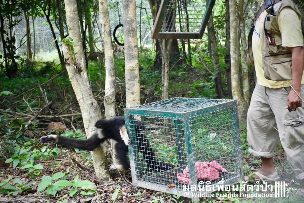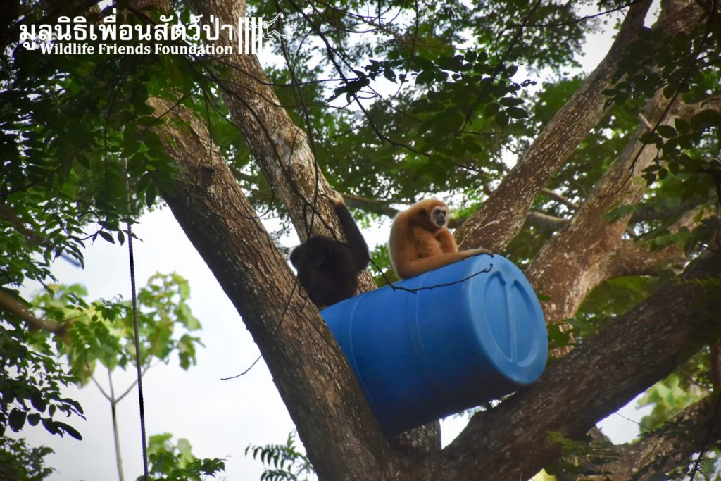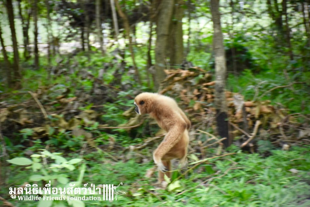 Yesterday two sub-adult white-handed gibbons (Hylobates lar), Oreo and Aung Aing, moved into a huge new forest enclosure where they can swing, sing and sleep in the forest canopy. Both of these gibbons were poached from the wild as very young infants and illegally sold into the pet trade. The female Aung Aing is 5 years old, she was rescued by WFFT in January 2016. The male Oreo is 6 years old and was rescued in June 2012. These special gibbons were hand raised here at the WFFT Wildlife Rescue Centre. Last year they were introduced with the view of them forming a social pair. We try to emulate wild gibbon societies by housing them in male/female pairs. They love exploring their new arboreal home, they especially enjoy climbing high in the tree canopy and brachiating from branch to branch.