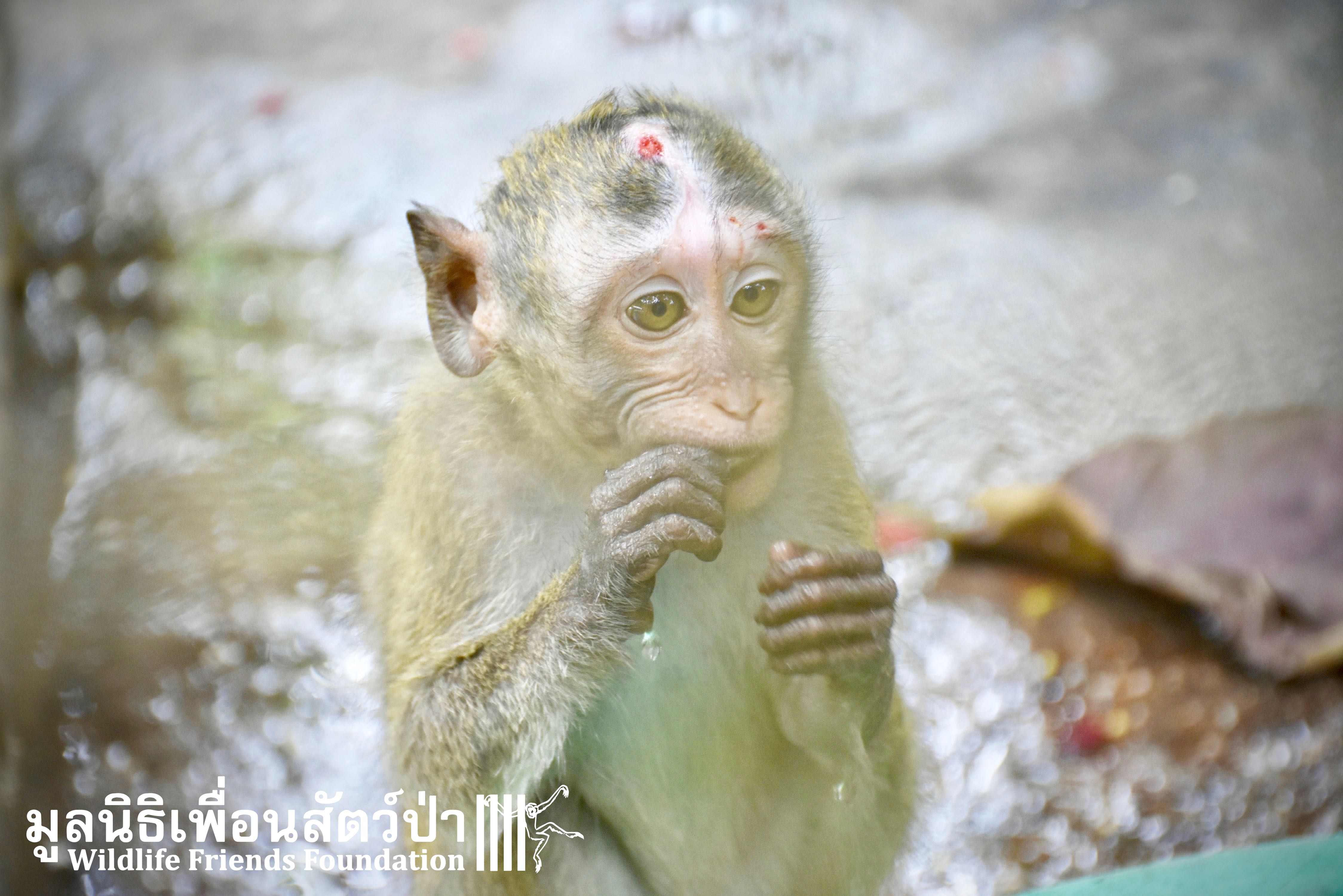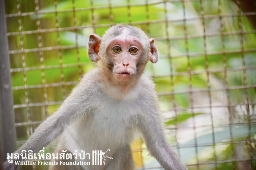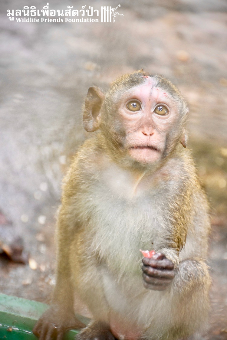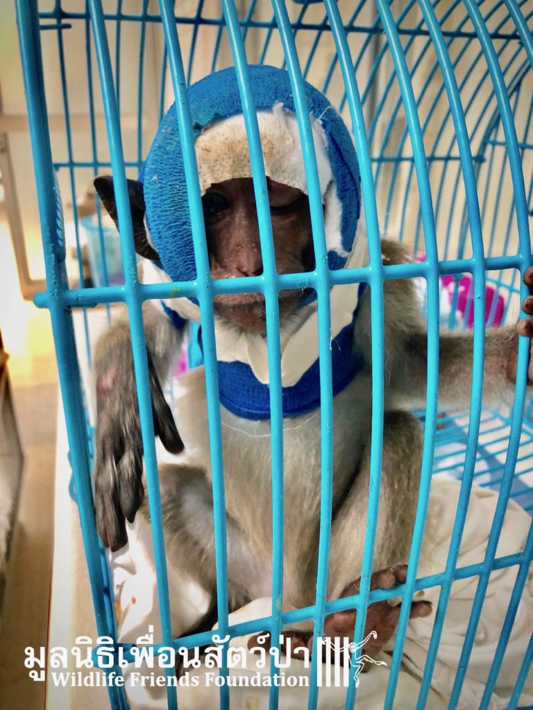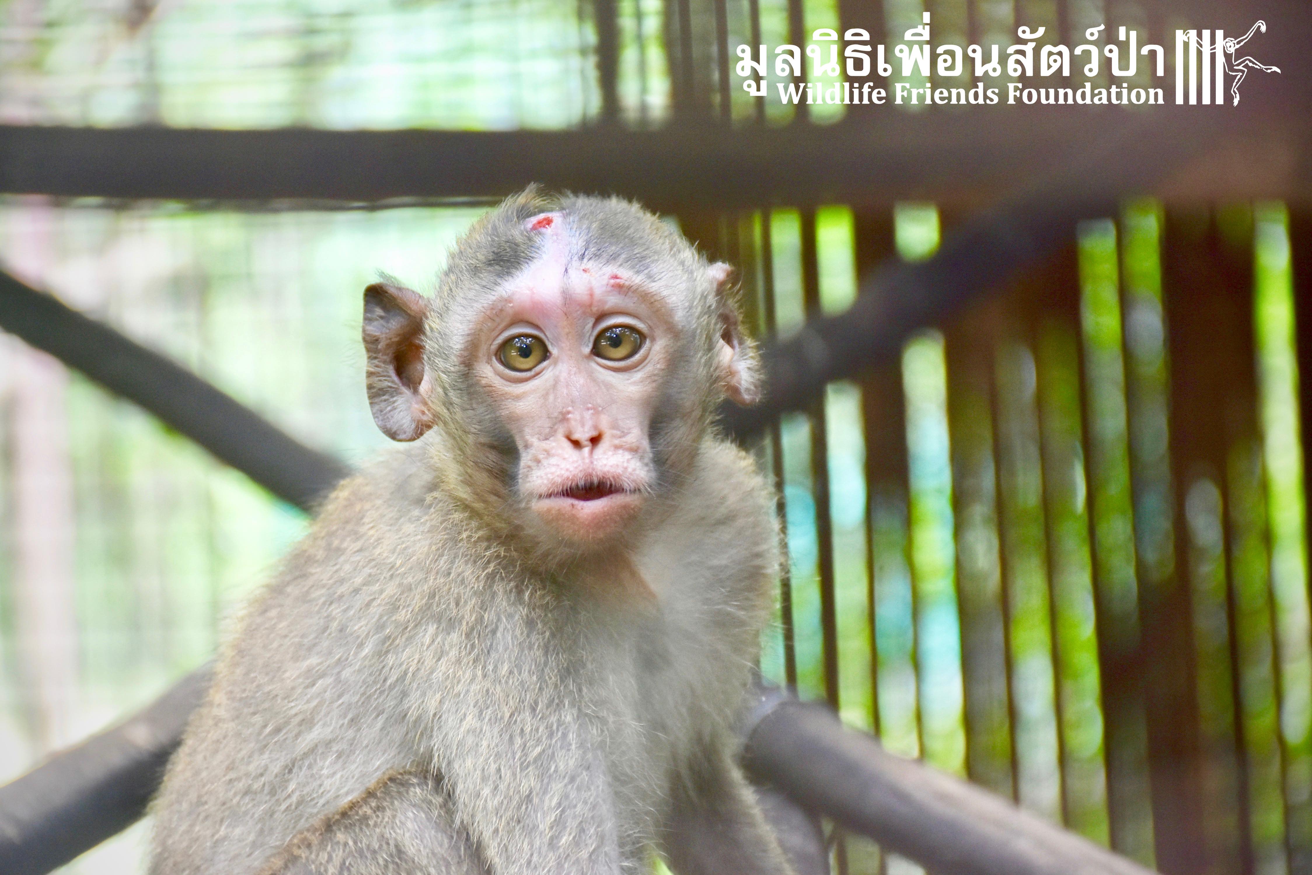 Four weeks ago the WFFT Vet Team were called by Kasetsart University to help with a young female long-tailed macaque ‘Jeng’. We were told she had been attacked by another macaque on the beach in Hua Hin and taken to the university for treatment. See more of the rescue story at www.wfft.org/wildlife-general/jeng-joines-the-wfft-menagerie/