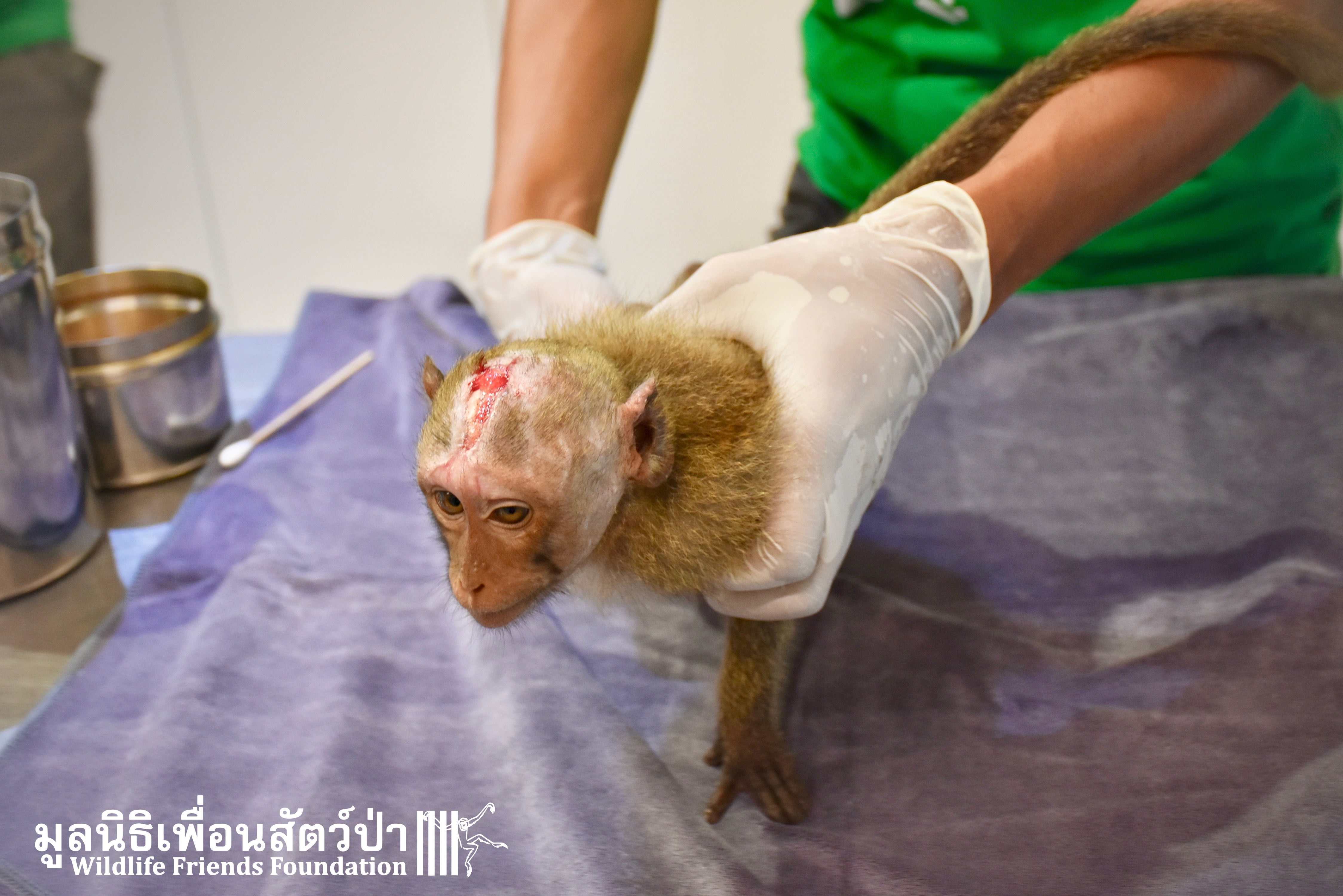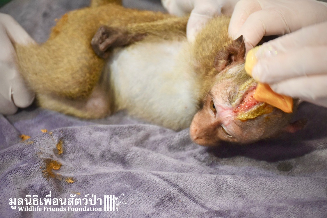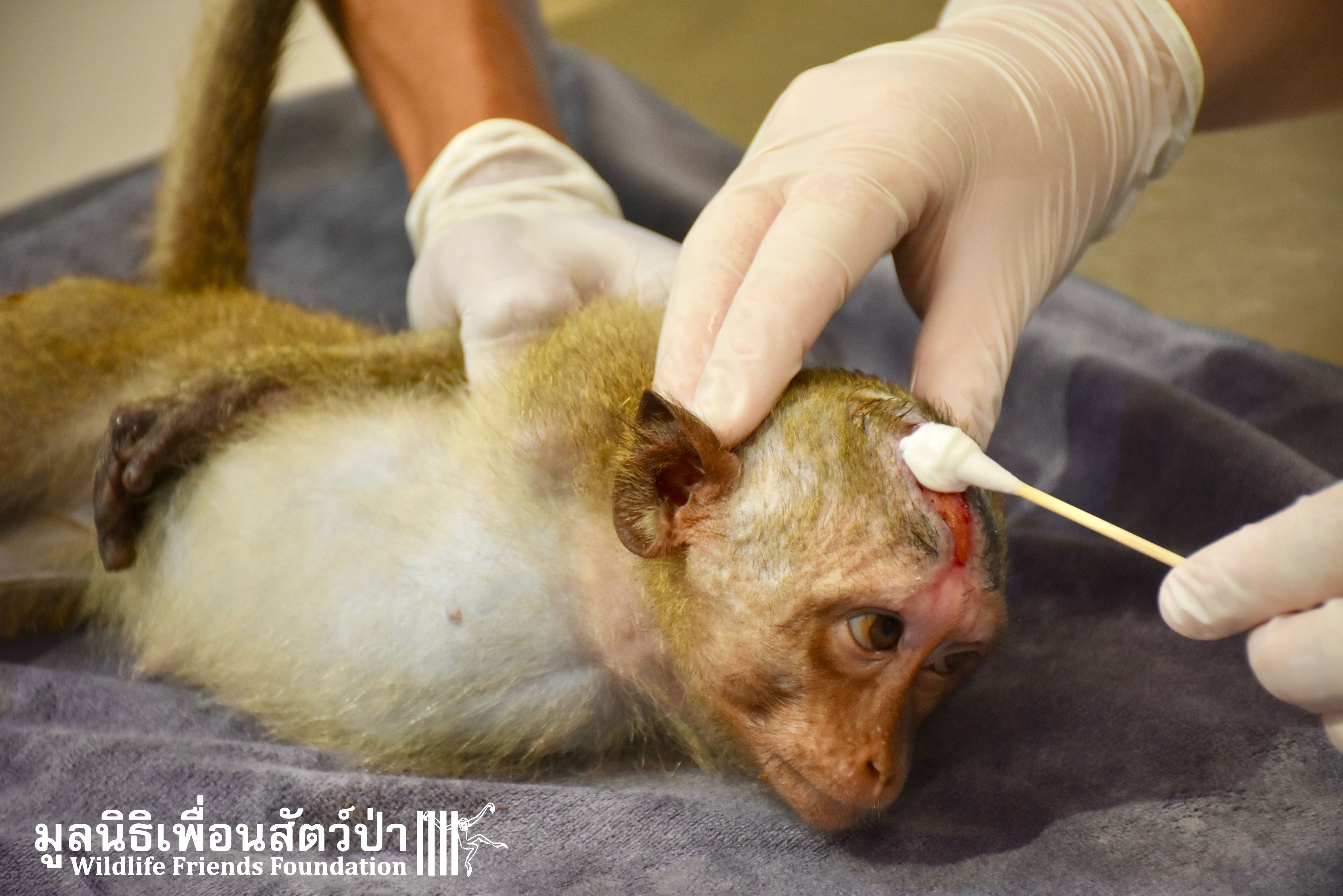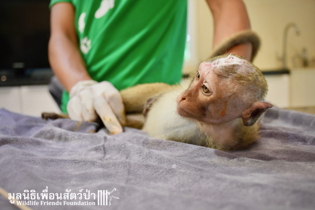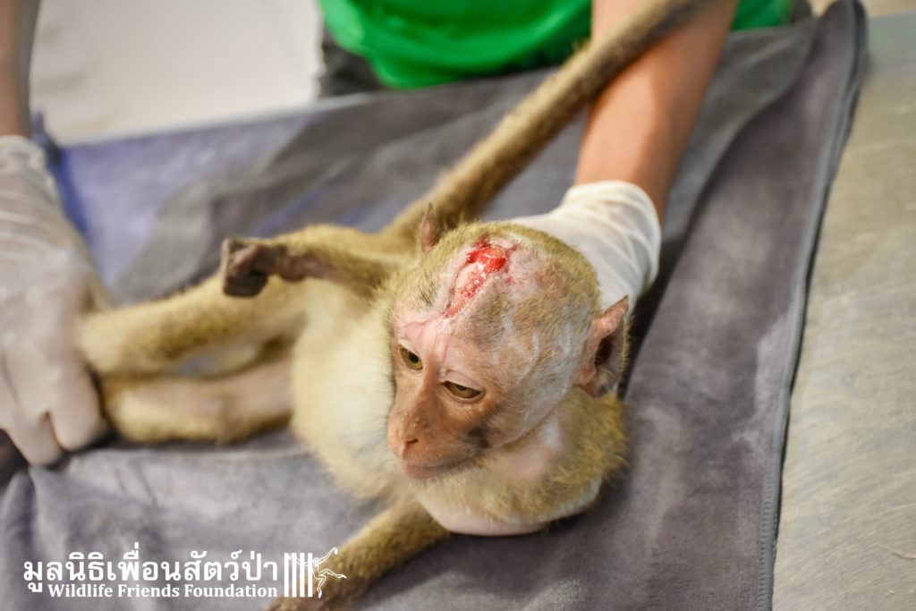 Four weeks ago the WFFT Vet Team were called by Kasetsart University to help with a young female long-tailed macaque ‘Jeng’. We were told she had been attacked by another macaque on the beach in Hua Hin and taken to the university for treatment. See more of the rescue story at www.wfft.org/wildlife-general/jeng-joines-the-wfft-menagerie/