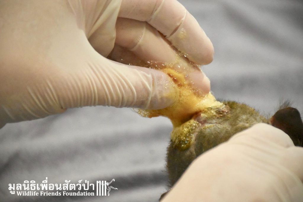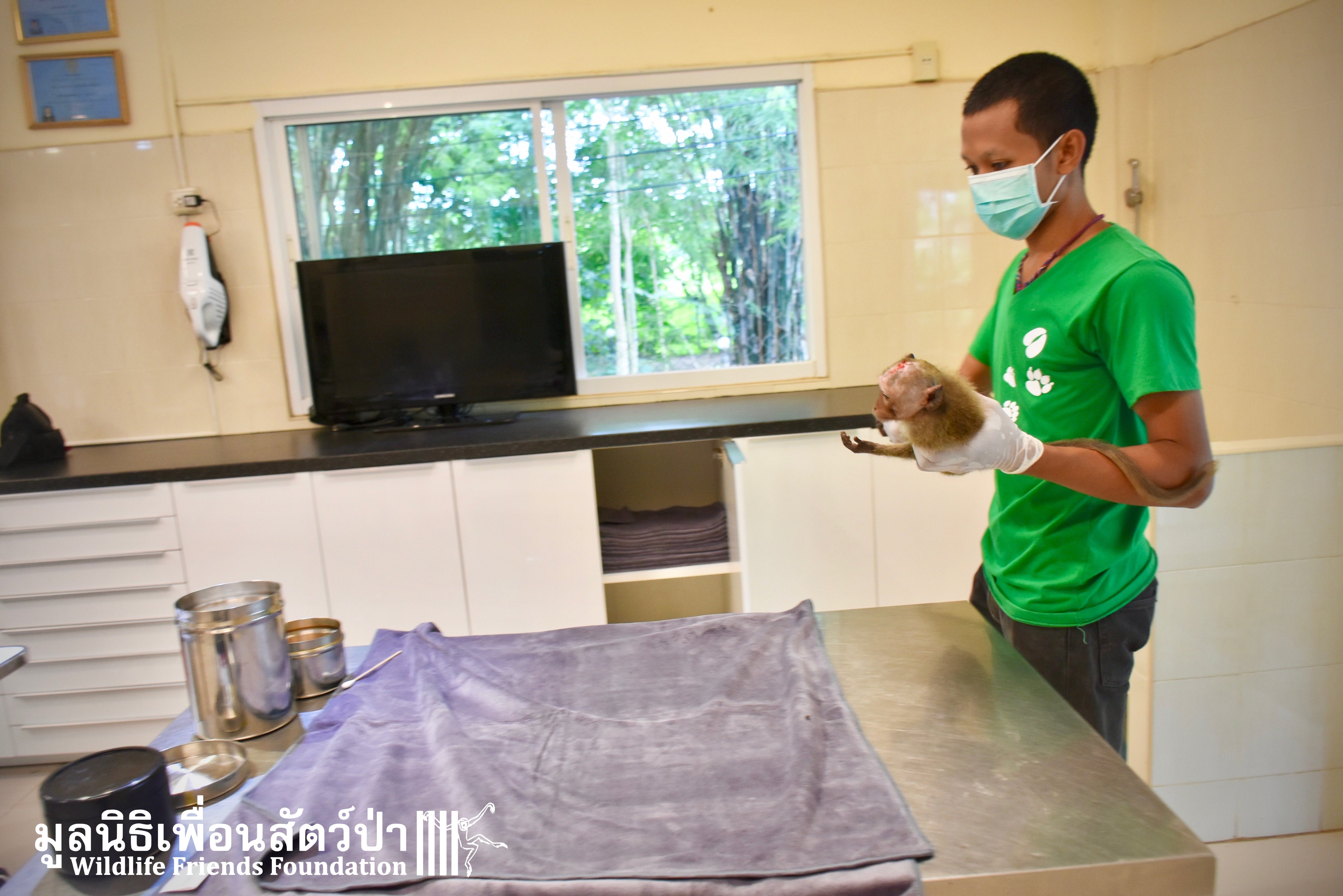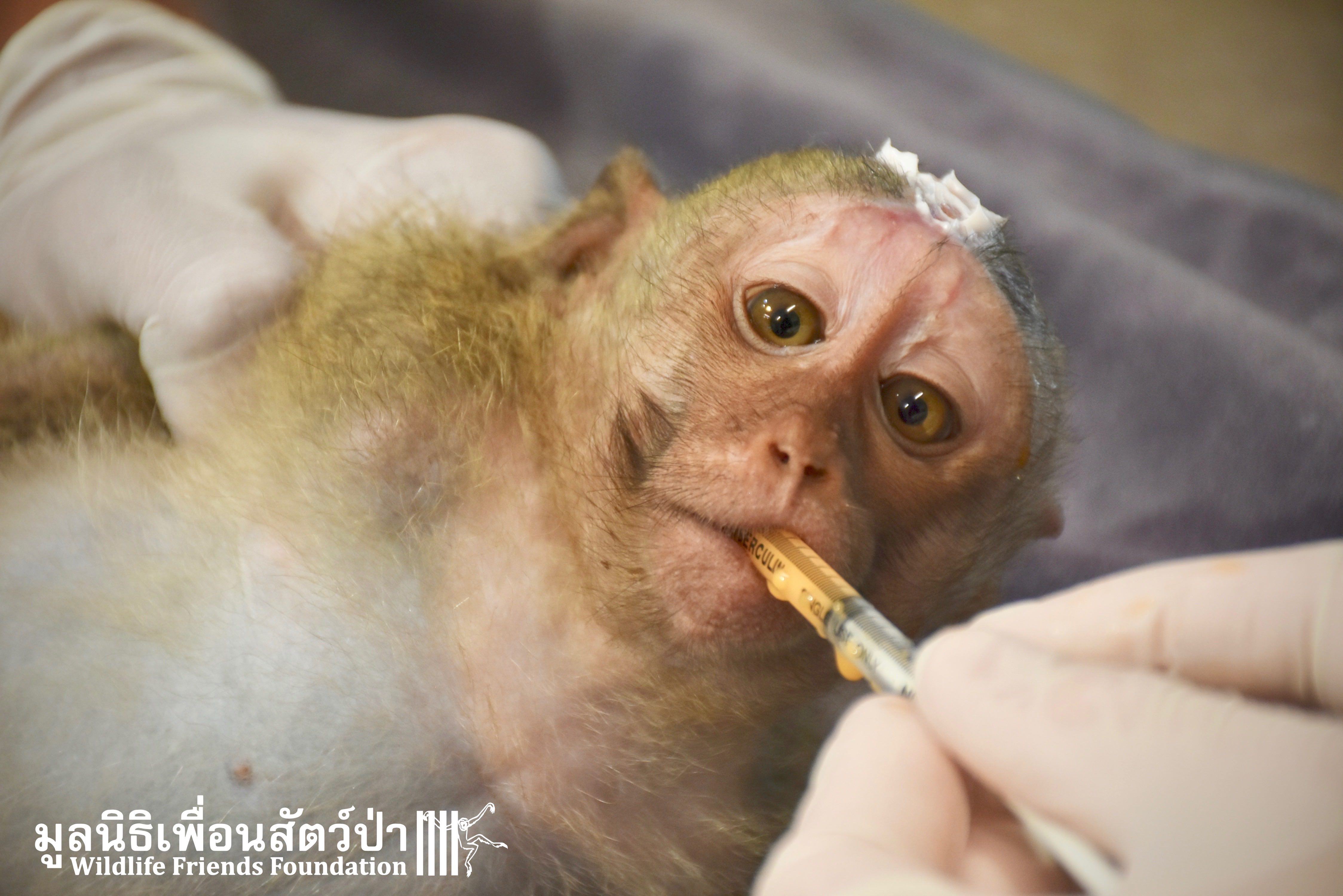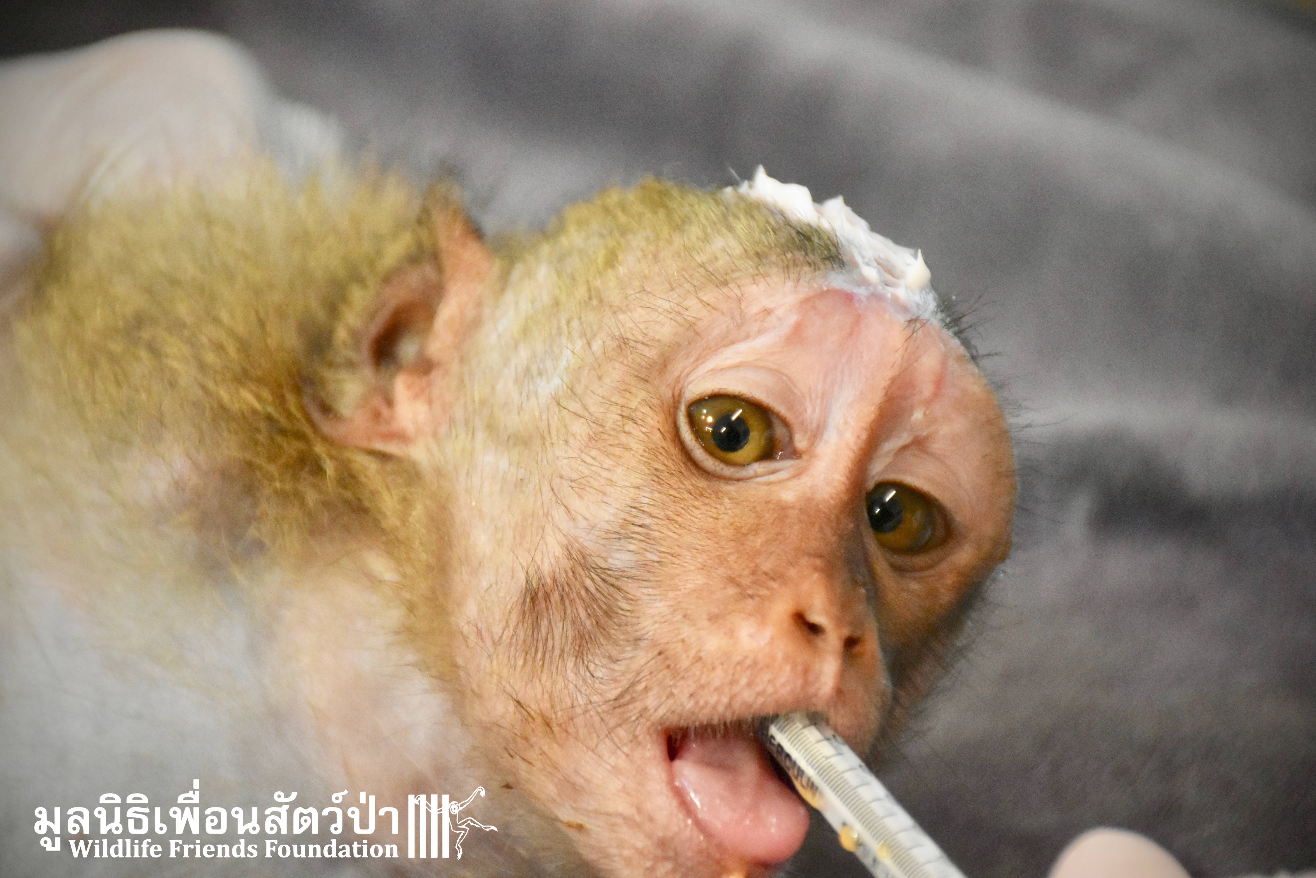 Four weeks ago the WFFT Vet Team were called by Kasetsart University to help with a young female long-tailed macaque ‘Jeng’. We were told she had been attacked by another macaque on the beach in Hua Hin and taken to the university for treatment. See more of the rescue story at www.wfft.org/wildlife-general/jeng-joines-the-wfft-menagerie/