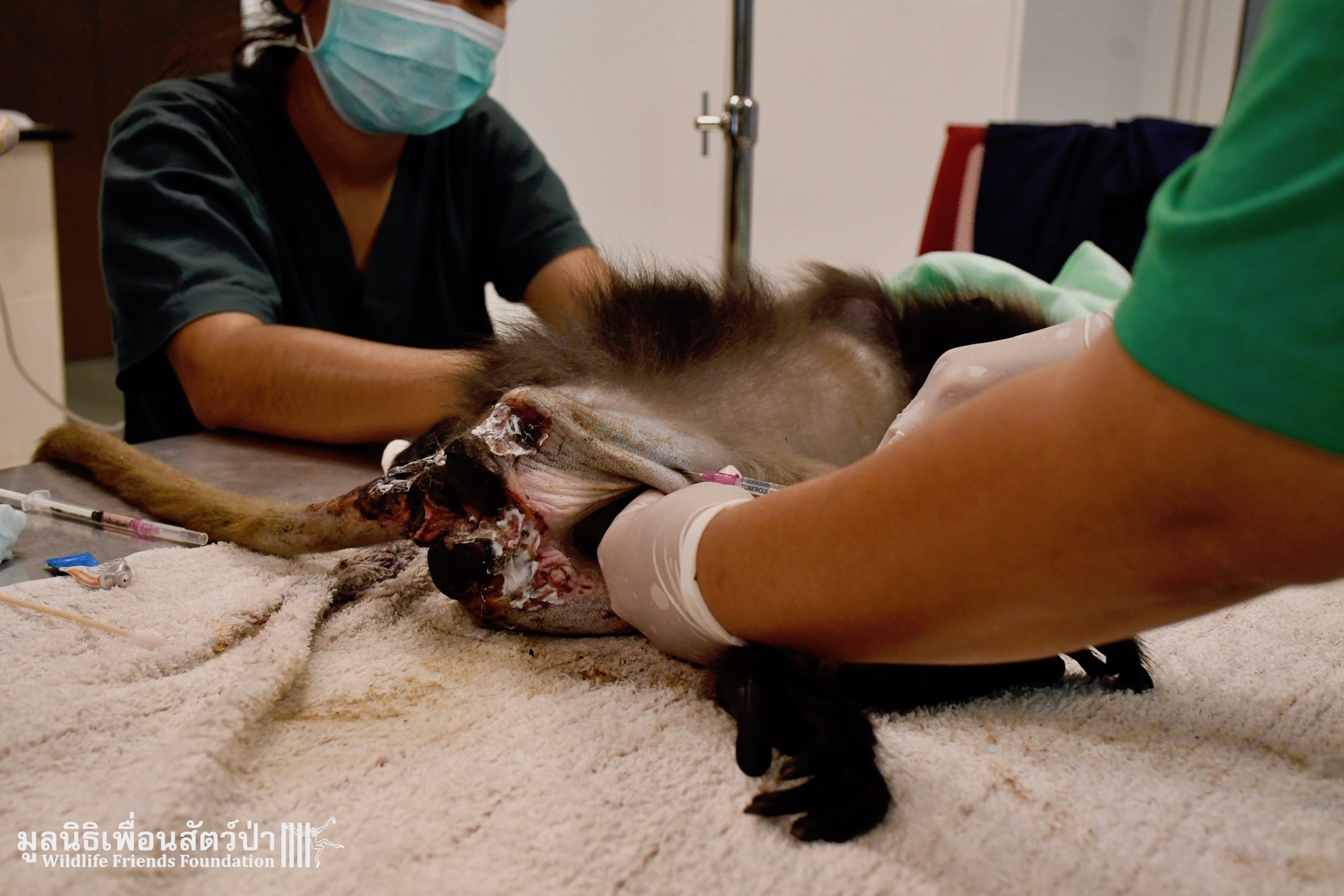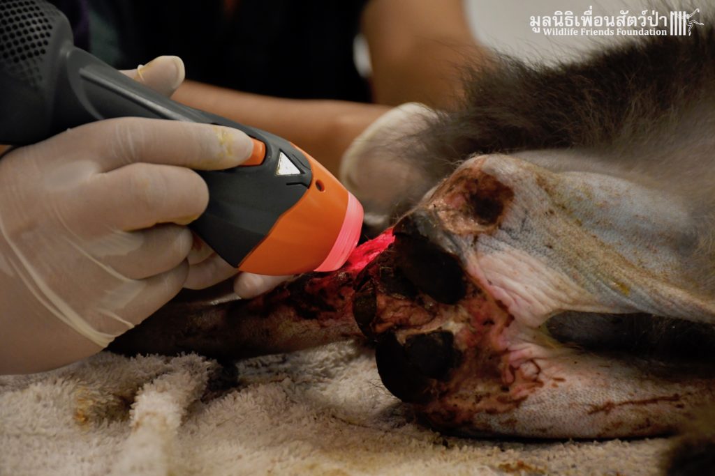 We drove 4 ½ hours south to rescue Wendee. A domestic animal veterinarian close to where she was found gave her an initial examination and treatment. Thank you to Baan Nai Hua Vet Hospital for helping rescue her. Upon arrival to the WFFT Wildlife Hospital her wounds were cleaned, she was given pain relief and fluids, the WFFT Vet Team then set to work utilising a veterinary lazar we are currently renting. We only have this equipment for a few more weeks for treatment of other injured animals. Unfortunately we have to hand this machine back to the rental company due to lack of funds.