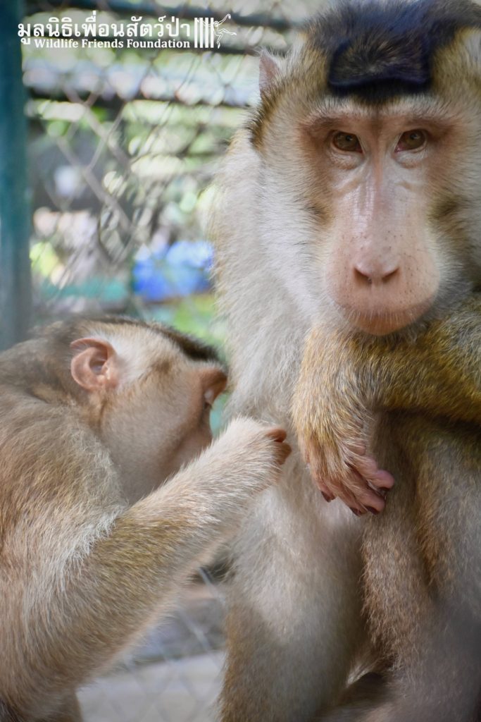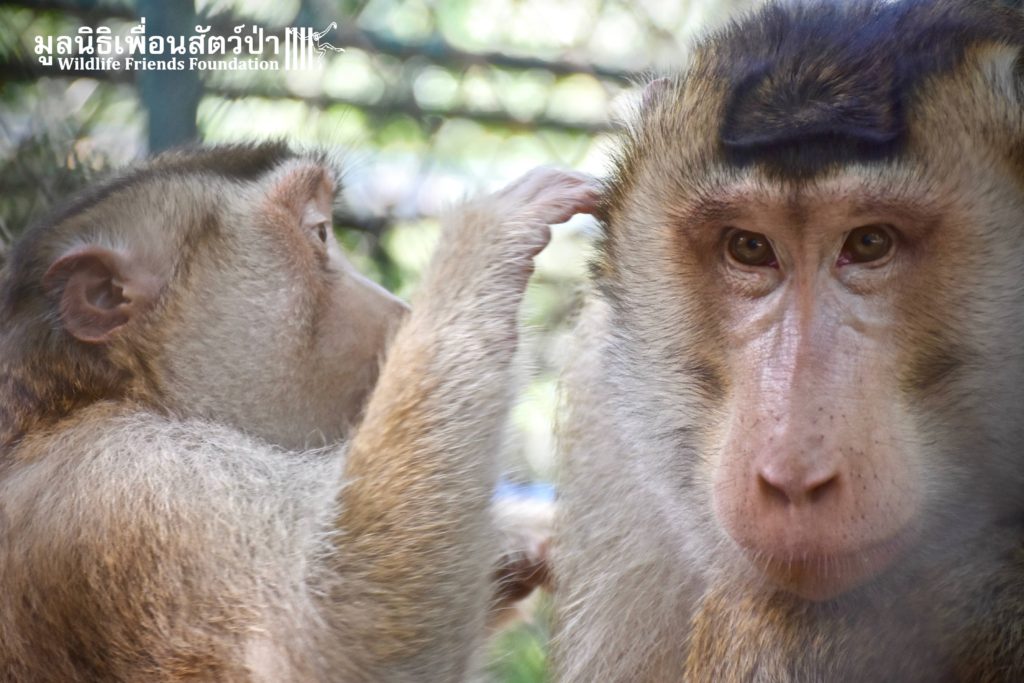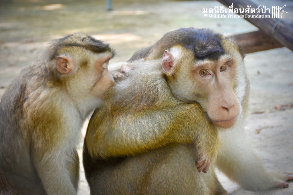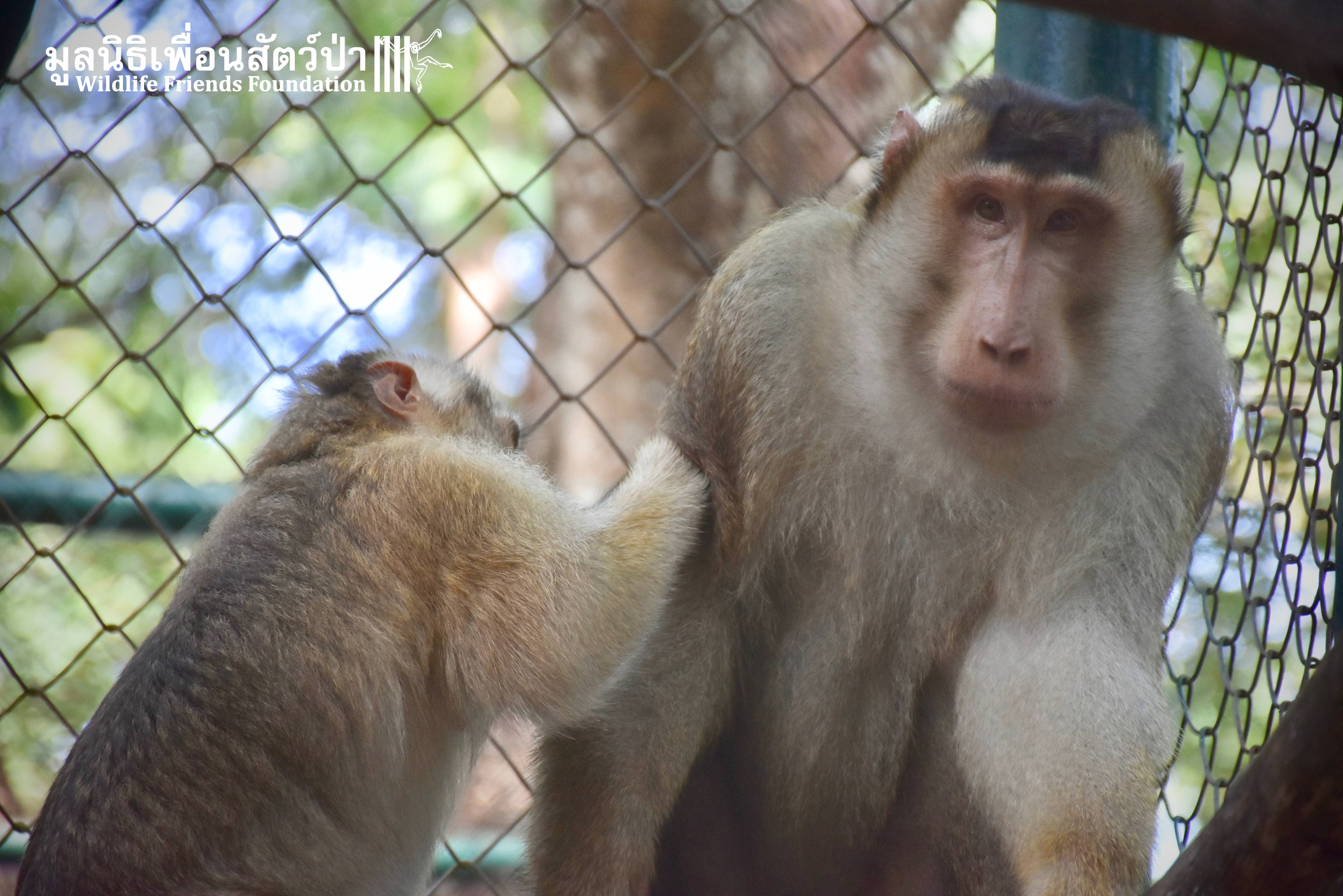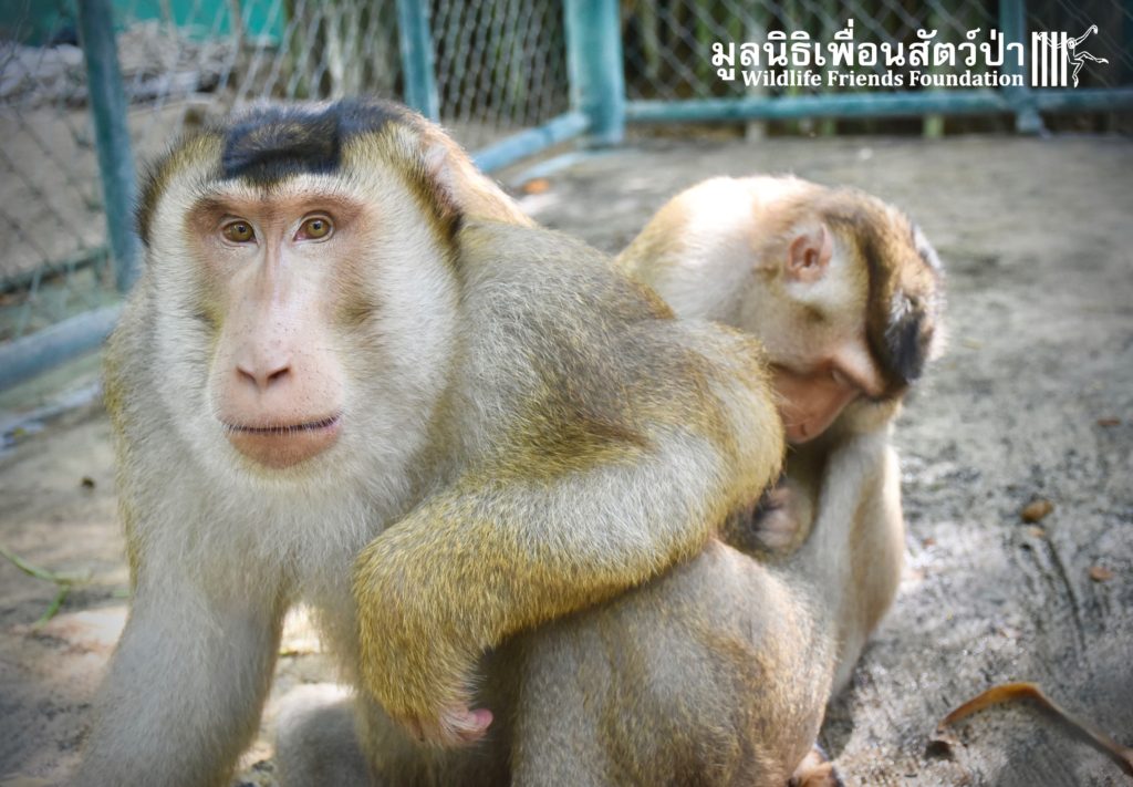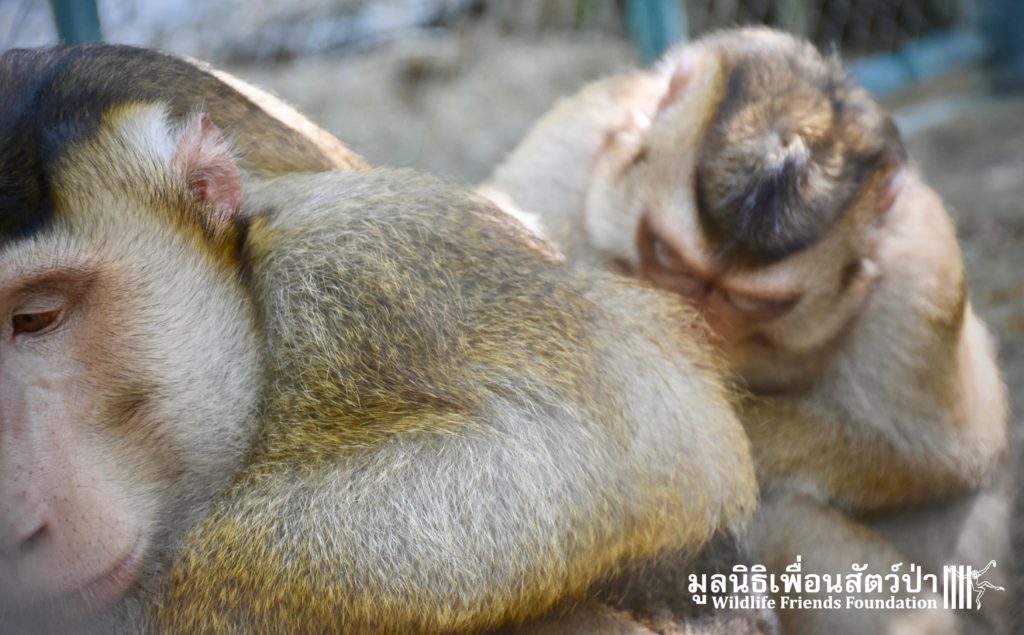 For the second time this month, Bobo the female Southern pig-tailed Macaque rescued at the beginning of October 2017, who already found a friend in Nam Phet, also a female Southern Pig-tailed Macaque, rescue in August of this year ( See the full story of this touching friendship here: https://staging.wfft.org/wildlife-general/friendship-first-sight-endless-cuddly-moment-bobo-nam-phet/ ), met big male Silver.