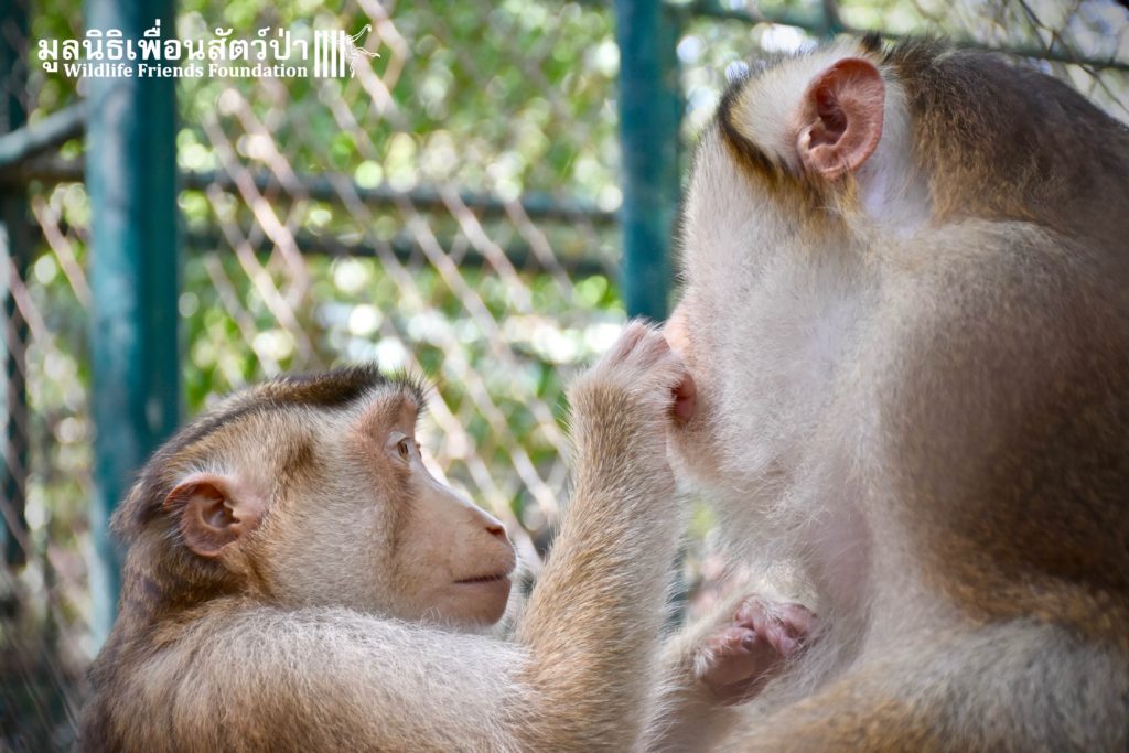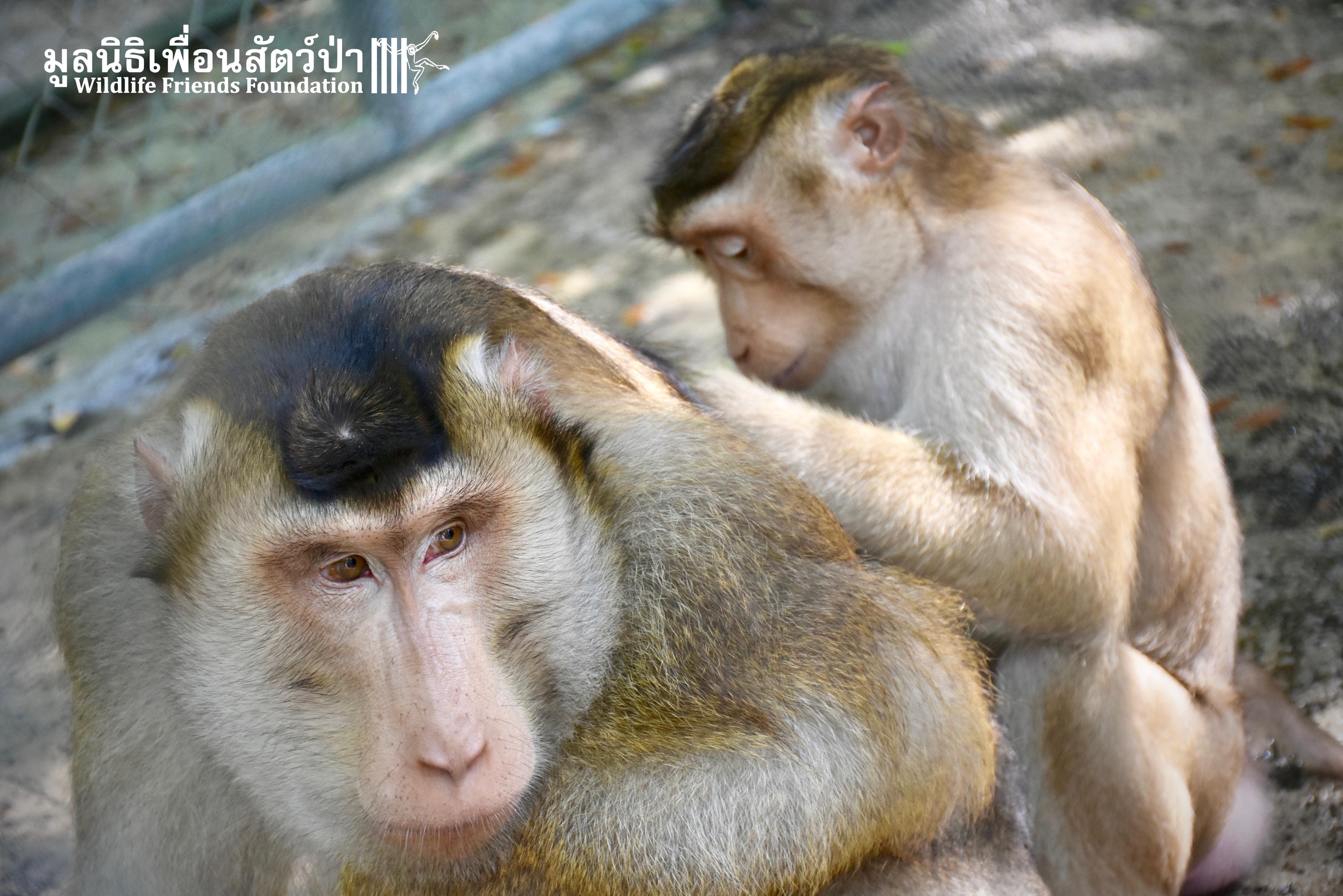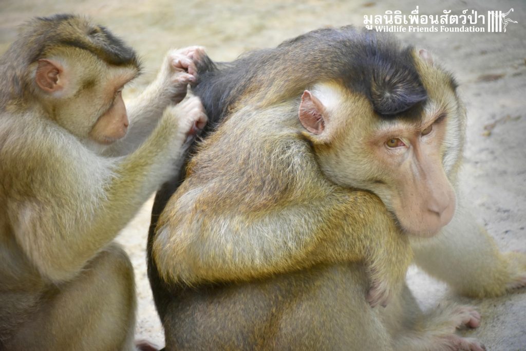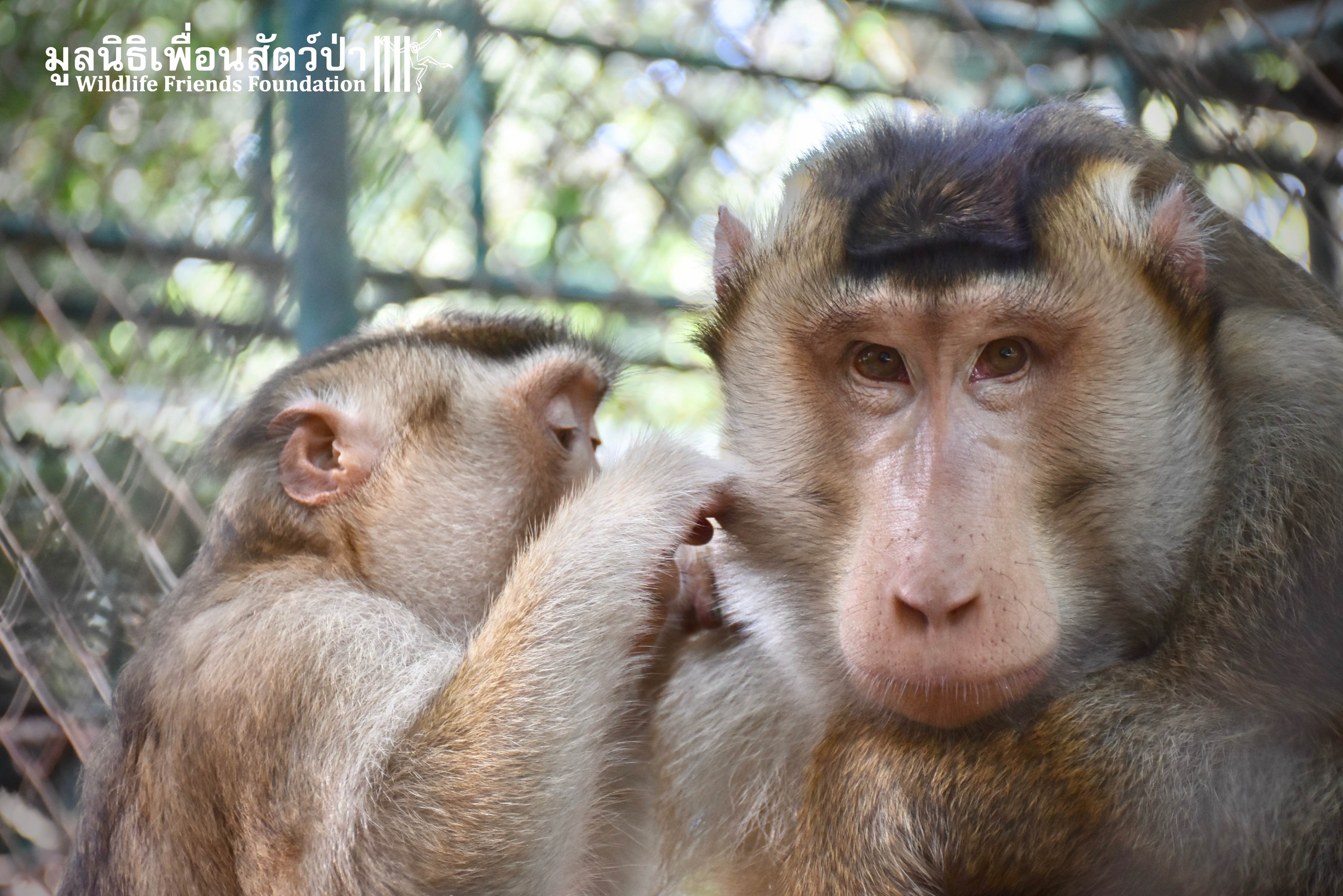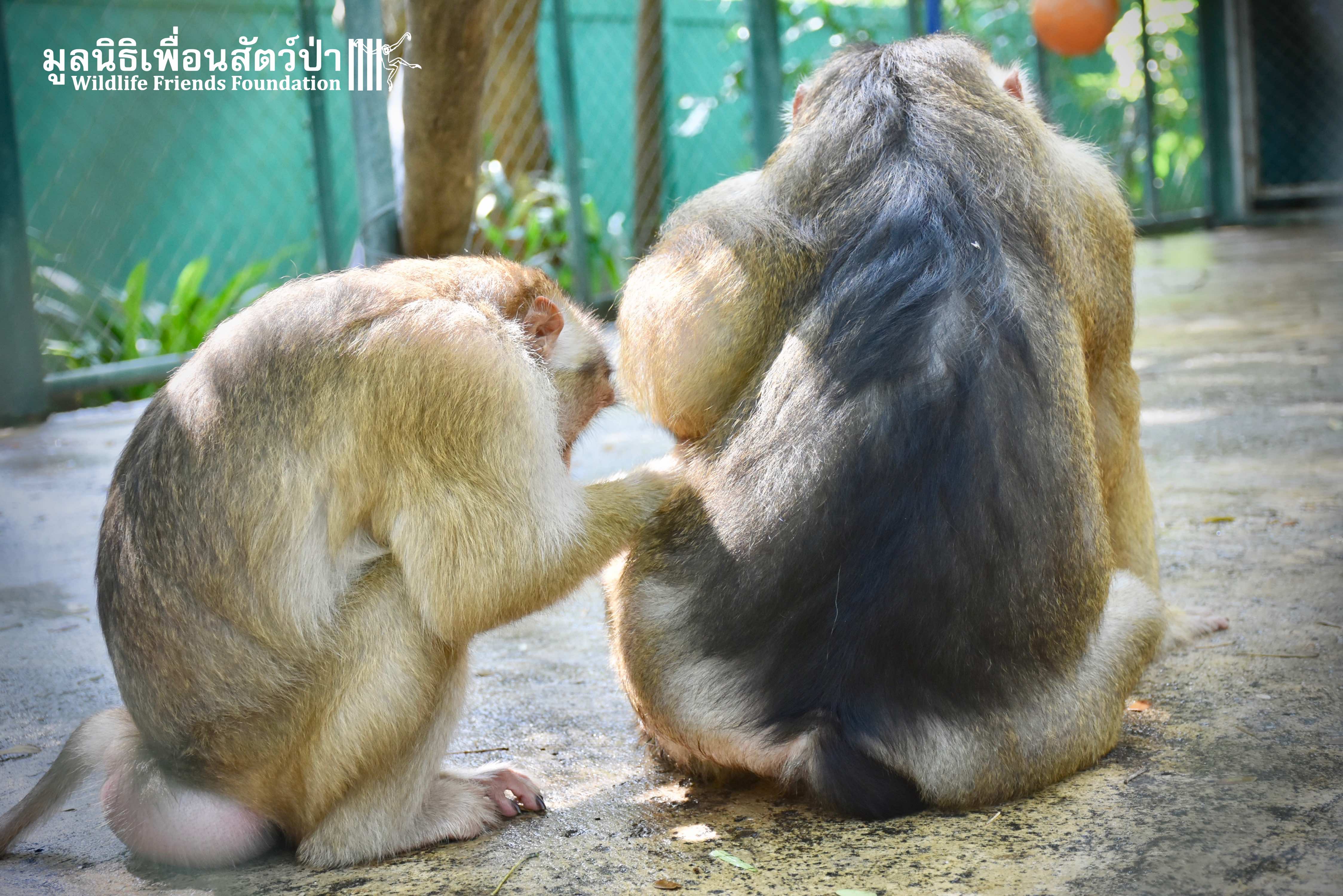 For the second time this month, Bobo the female Southern pig-tailed Macaque rescued at the beginning of October 2017, who already found a friend in Nam Phet, also a female Southern Pig-tailed Macaque, rescue in August of this year ( See the full story of this touching friendship here: https://staging.wfft.org/wildlife-general/friendship-first-sight-endless-cuddly-moment-bobo-nam-phet/ ), met big male Silver.