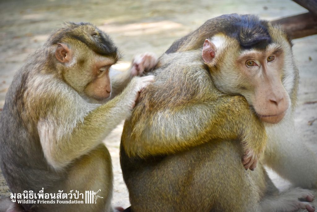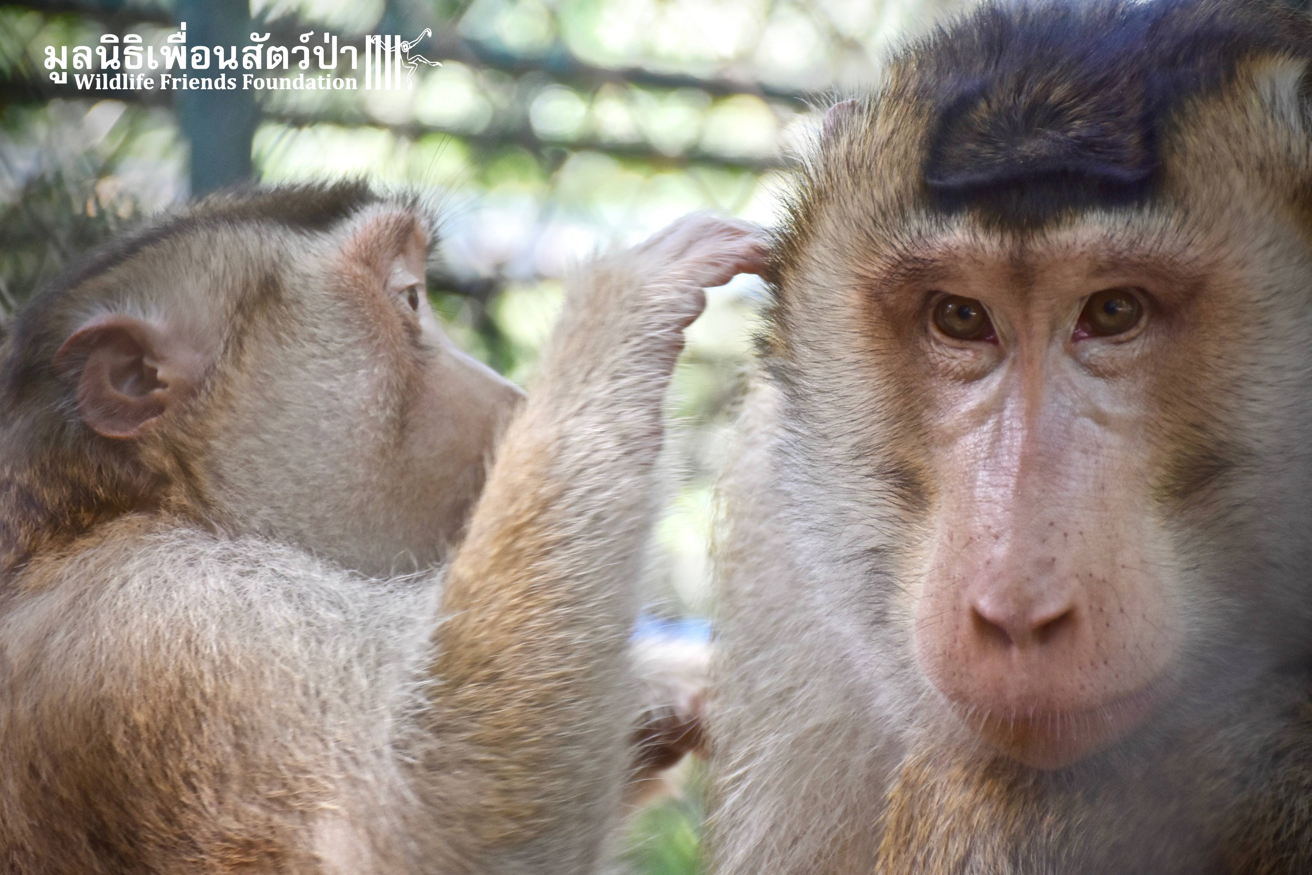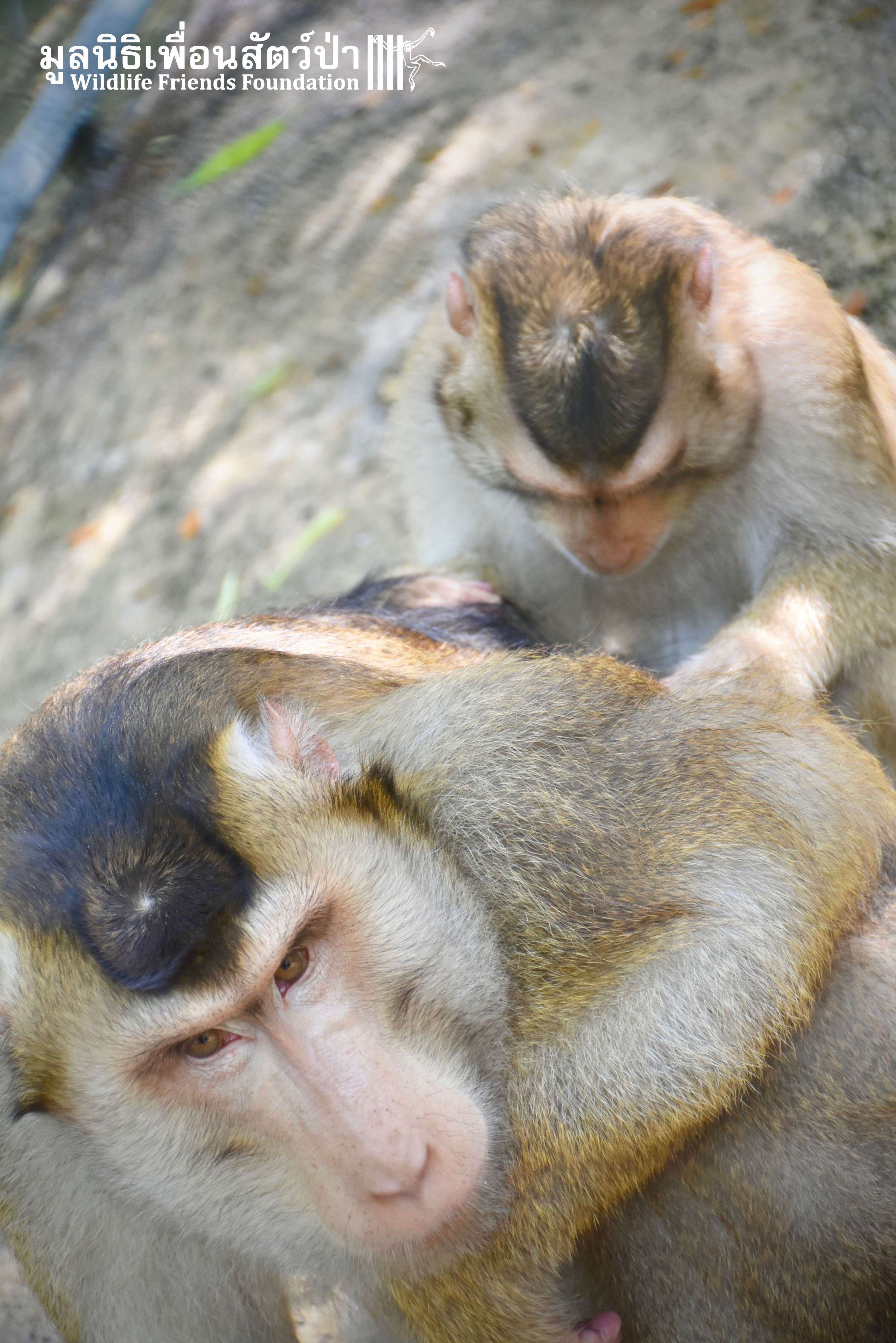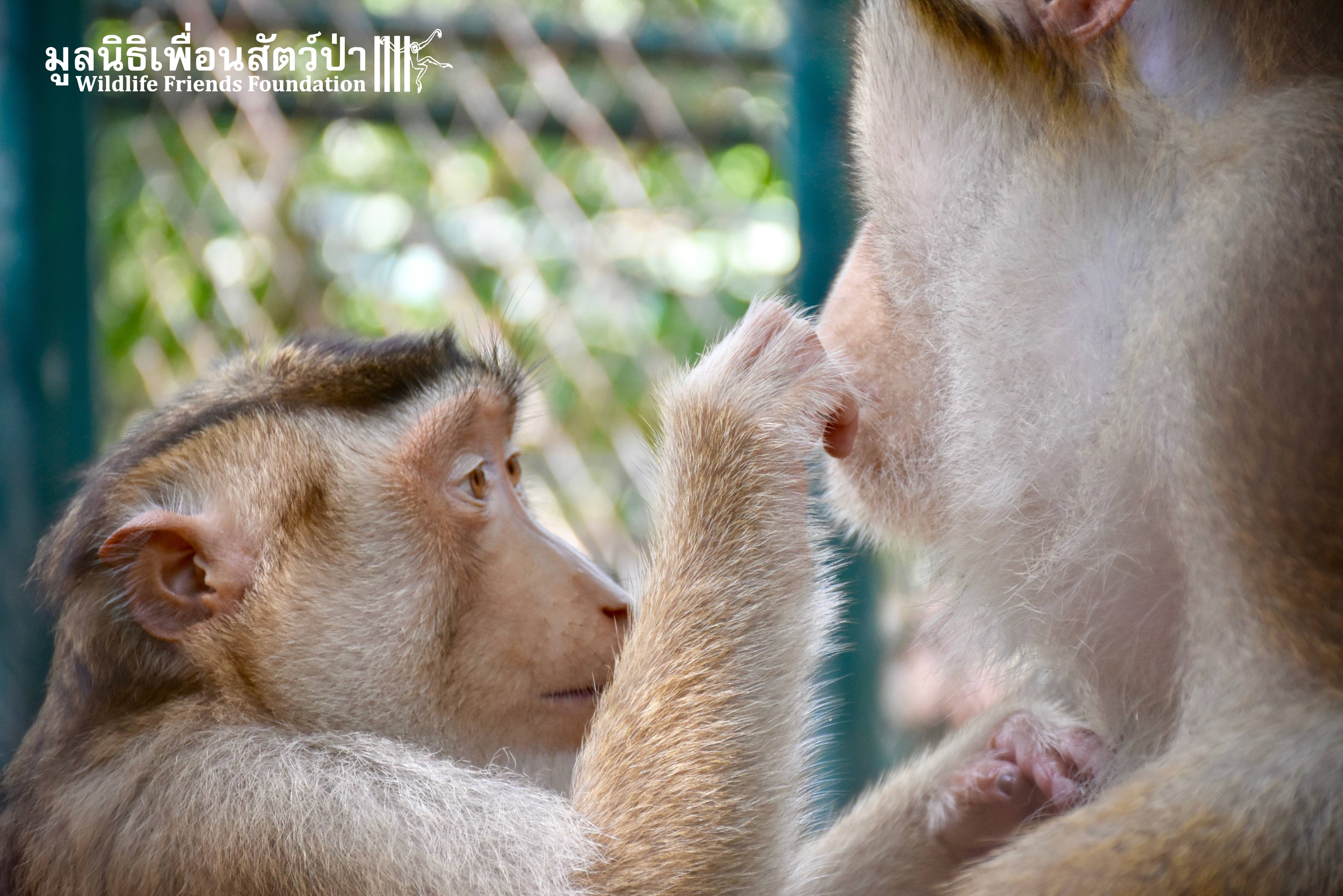 For the second time this month, Bobo the female Southern pig-tailed Macaque rescued at the beginning of October 2017, who already found a friend in Nam Phet, also a female Southern Pig-tailed Macaque, rescue in August of this year ( See the full story of this touching friendship here: https://staging.wfft.org/wildlife-general/friendship-first-sight-endless-cuddly-moment-bobo-nam-phet/ ), met big male Silver.