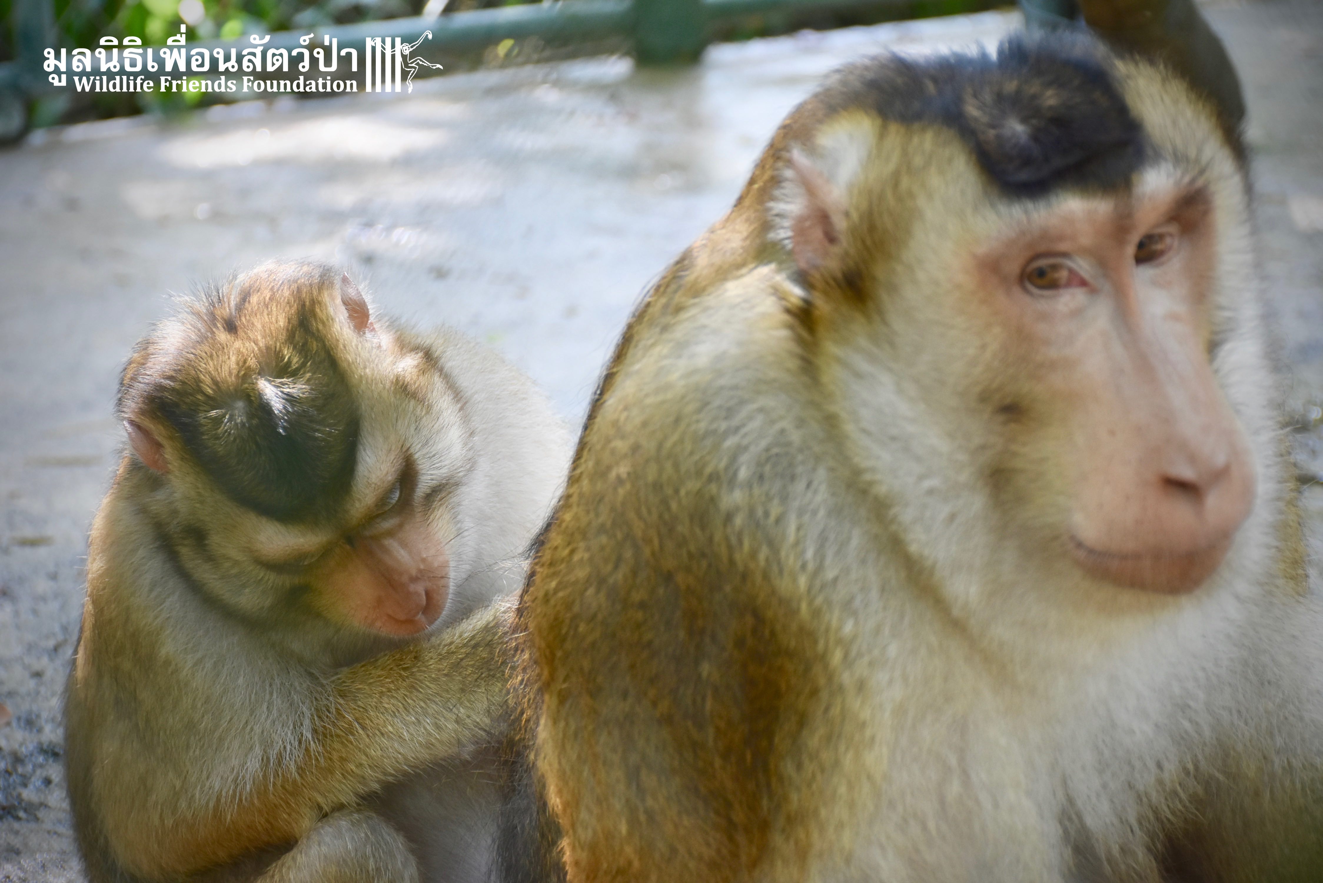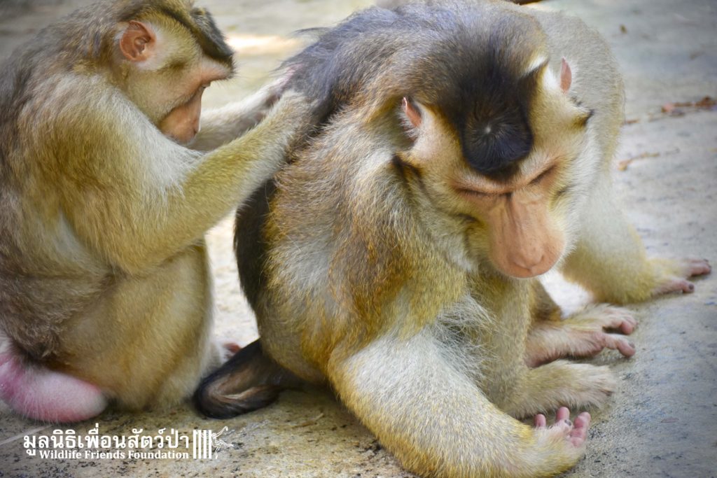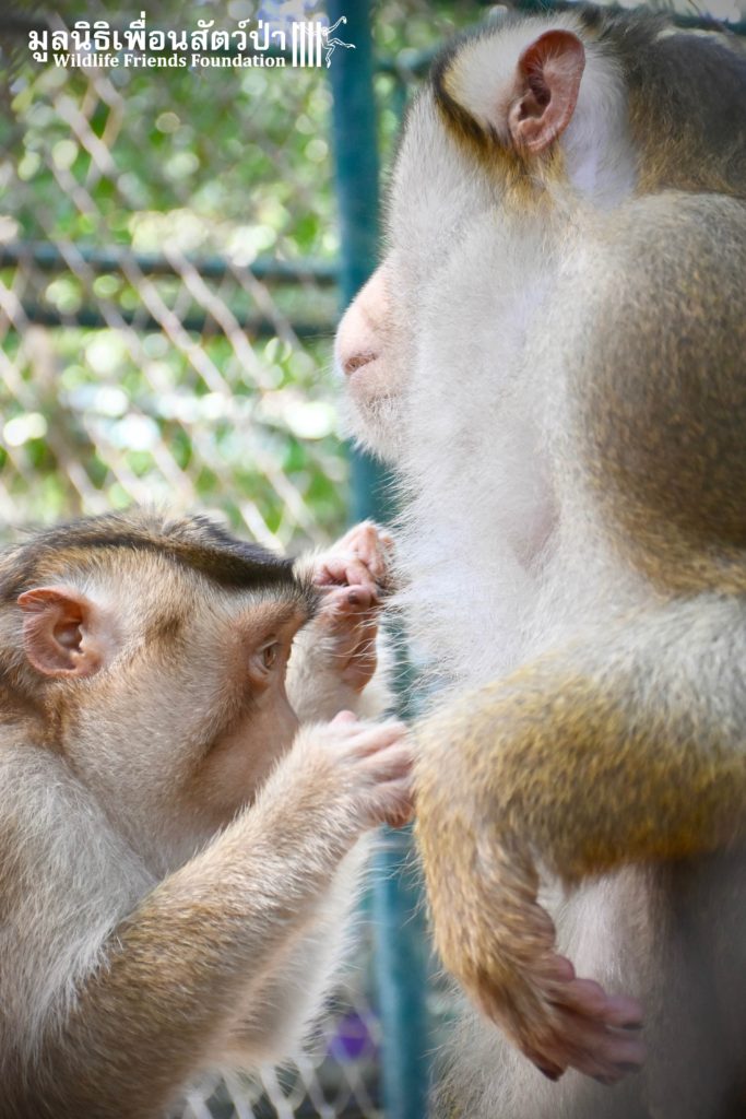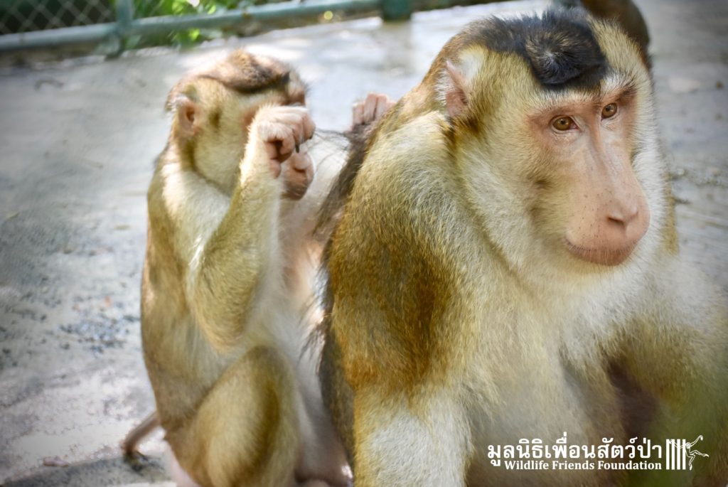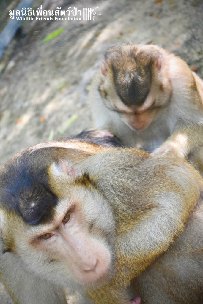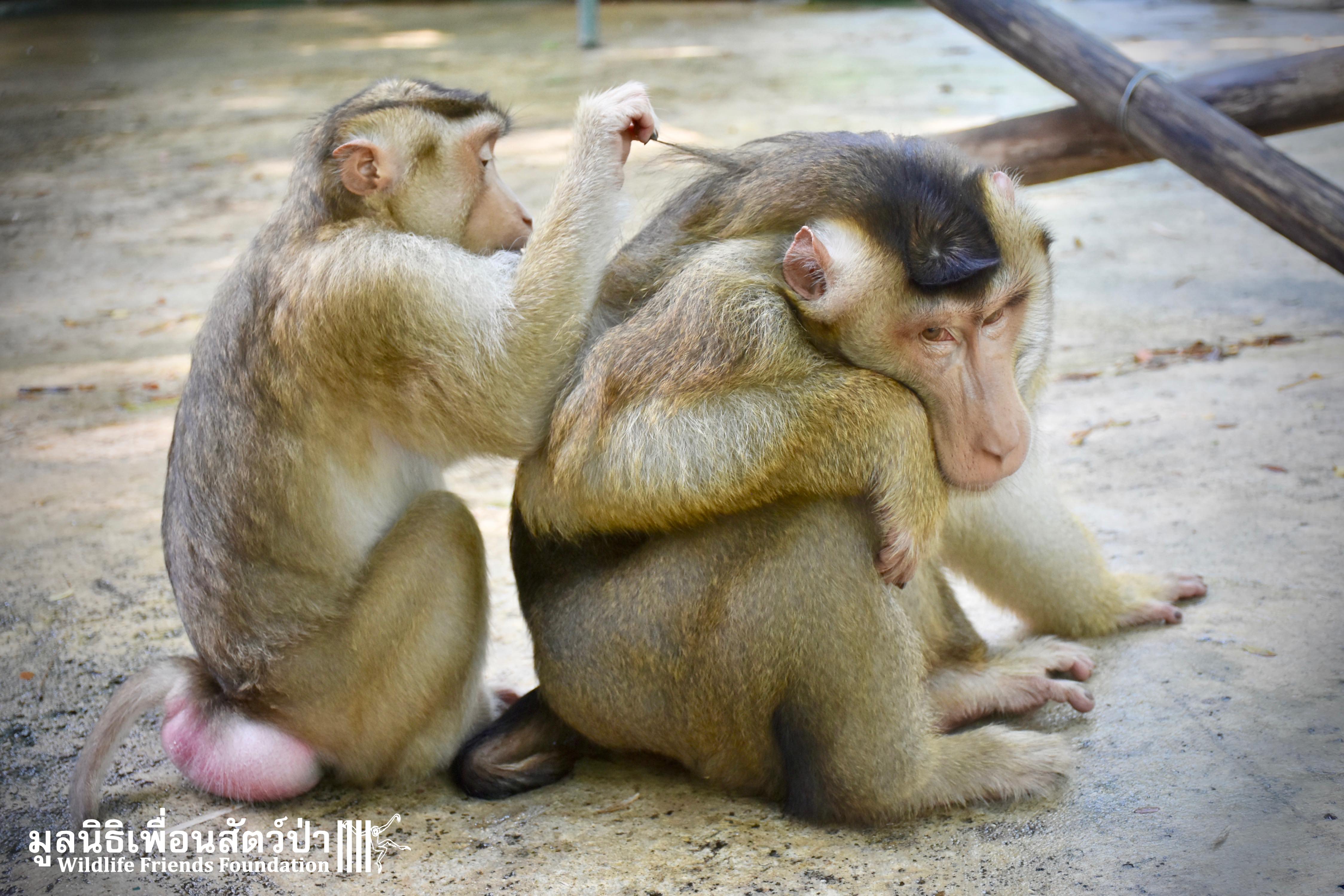 For the second time this month, Bobo the female Southern pig-tailed Macaque rescued at the beginning of October 2017, who already found a friend in Nam Phet, also a female Southern Pig-tailed Macaque, rescue in August of this year ( See the full story of this touching friendship here: https://staging.wfft.org/wildlife-general/friendship-first-sight-endless-cuddly-moment-bobo-nam-phet/ ), met big male Silver.