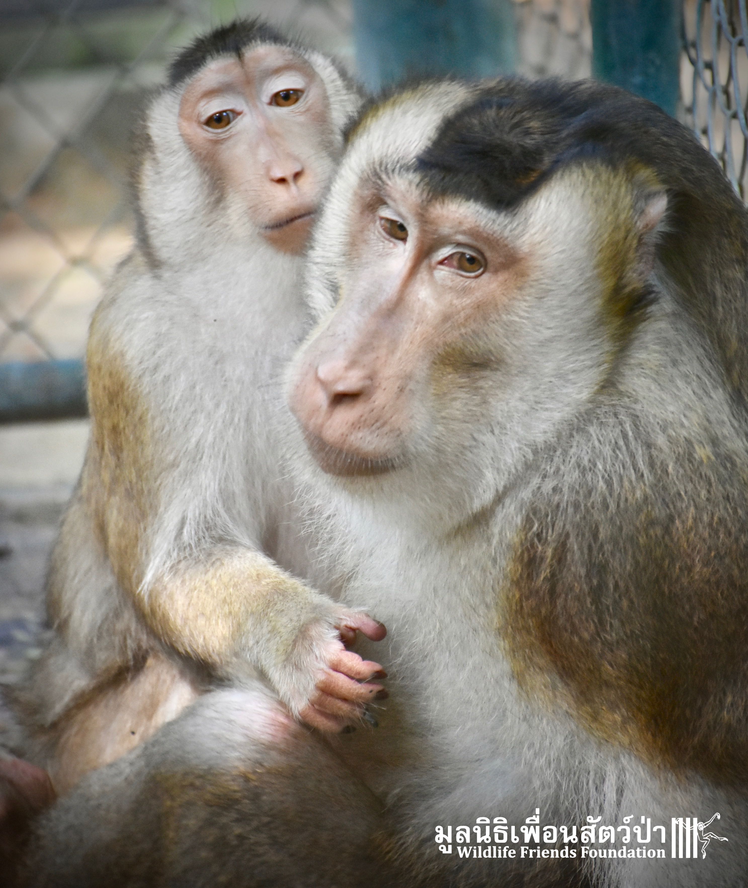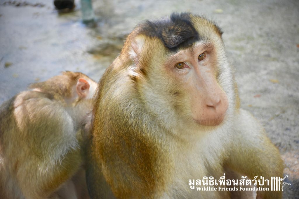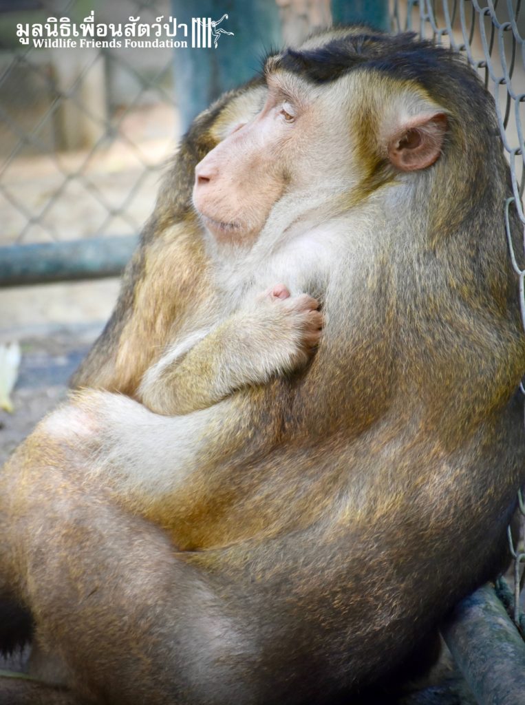 Silver ( ‘See Nguen’ )is a is an eight-year-old Southern pig-tailed macaque (Macaca nemestrina) who was rescued in July 2016 at a temple in Phetchaburi ( See his full story here: https://staging.wfft.org/wildlife-general/meet-silver-gold-two-beautiful-big-boys/ ).