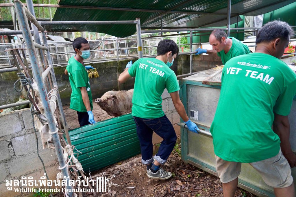 The first vehicle arrived back and WFFT at 3pm and the last animal placed in his new pen at 5pm. A very long and exhausting day for the team but to end the day watching the wild boar take his first mud bath in many years made it all worthwhile.