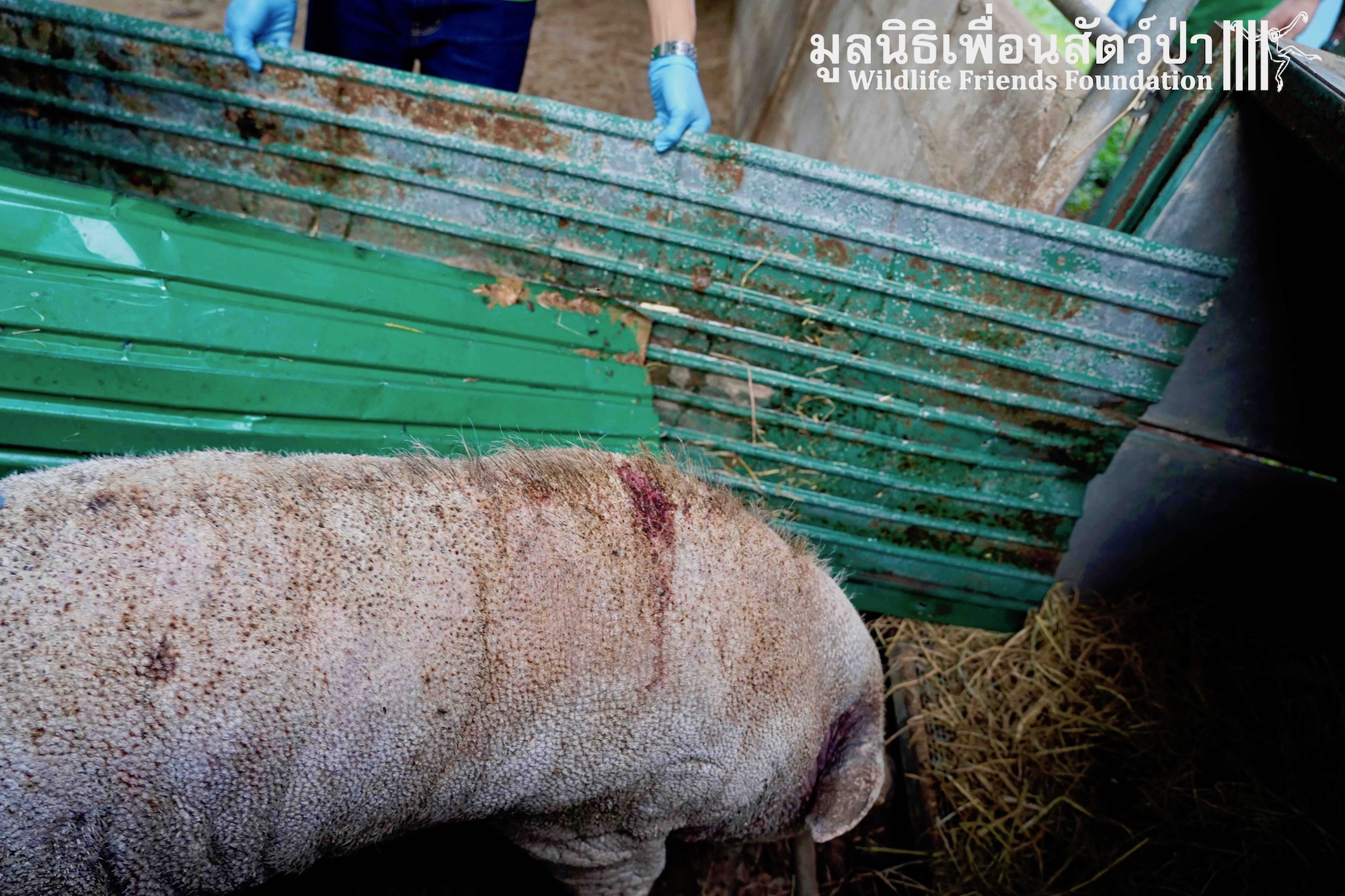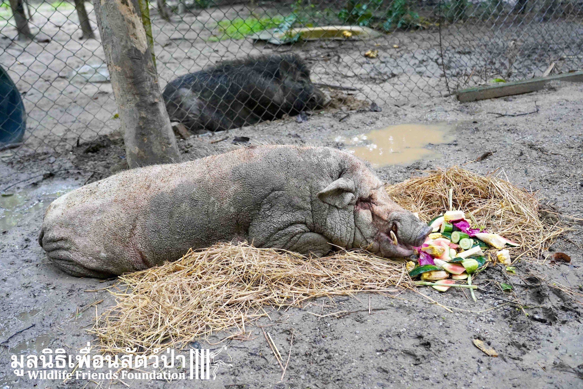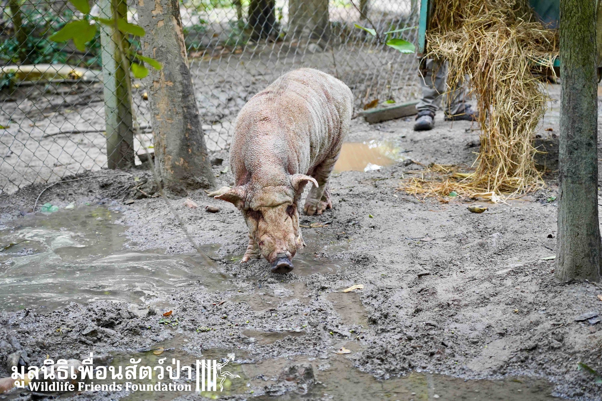 The first vehicle arrived back and WFFT at 3pm and the last animal placed in his new pen at 5pm. A very long and exhausting day for the team but to end the day watching the wild boar take his first mud bath in many years made it all worthwhile.