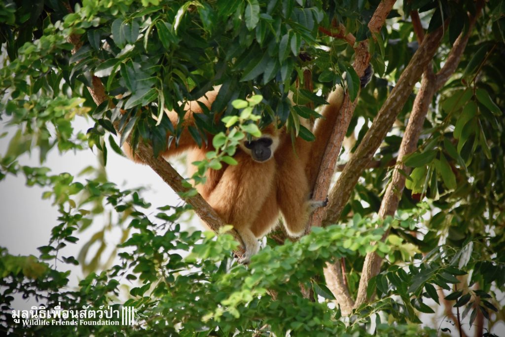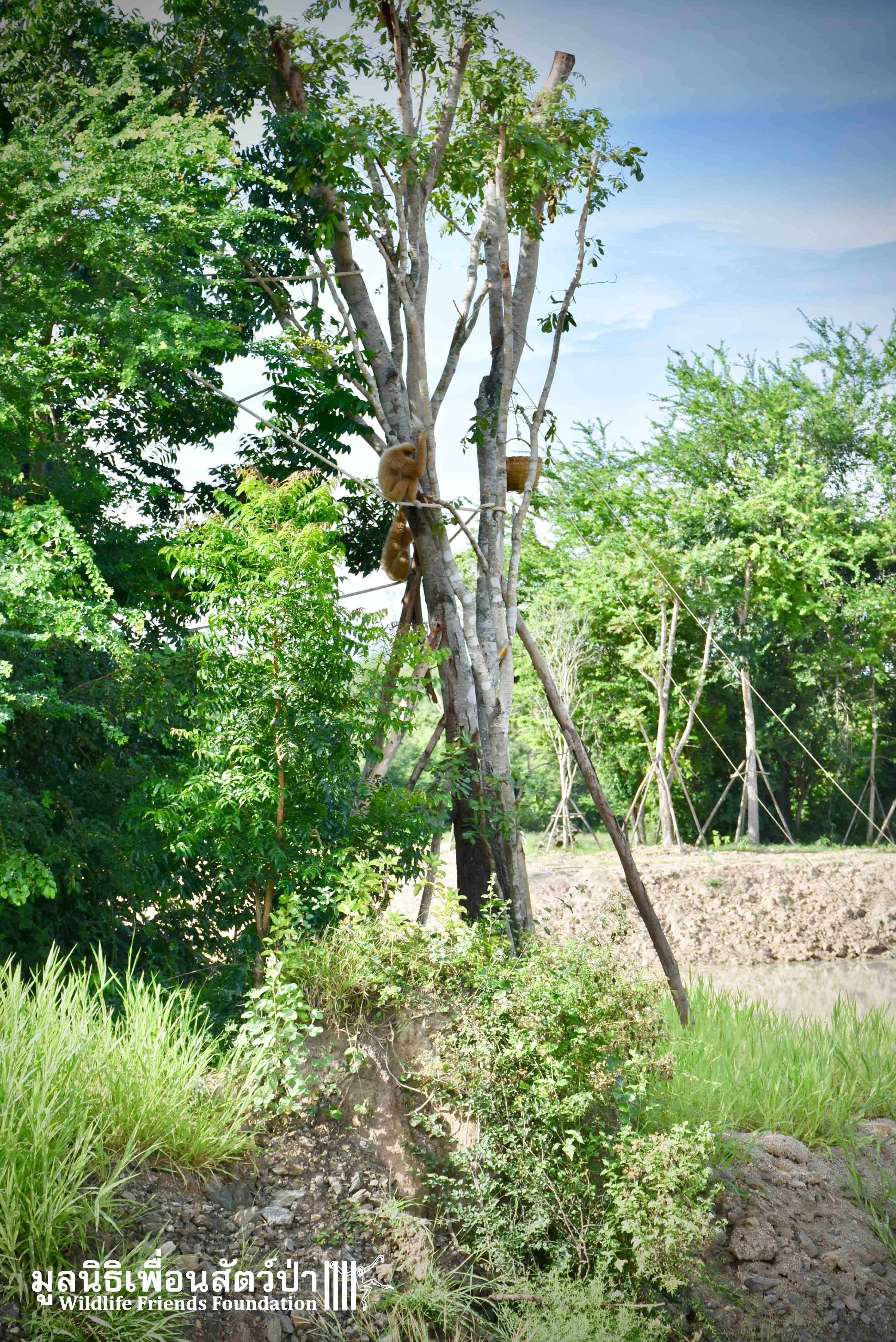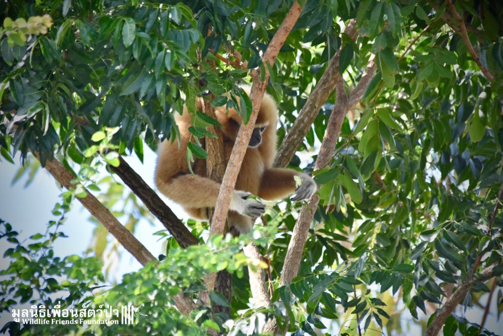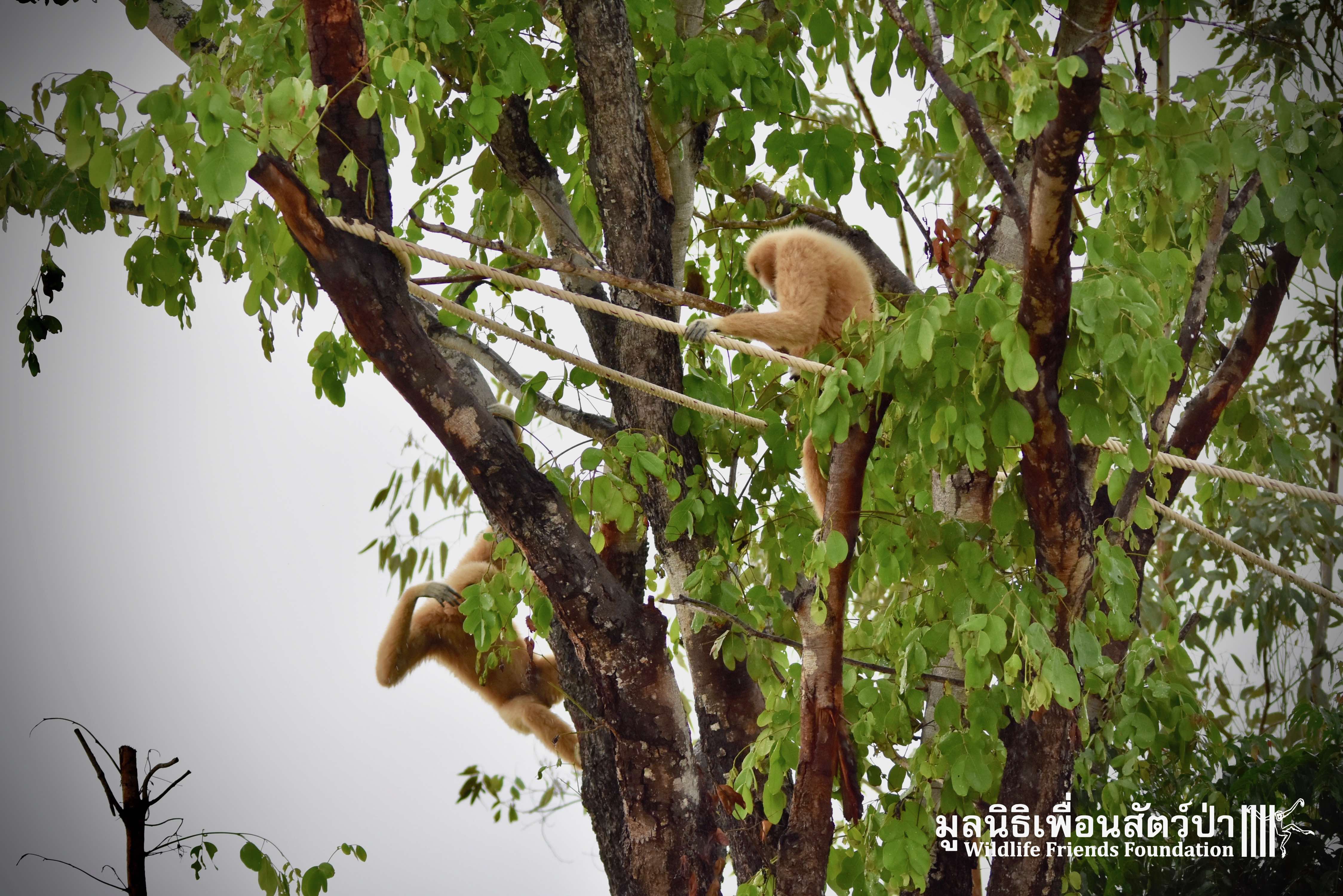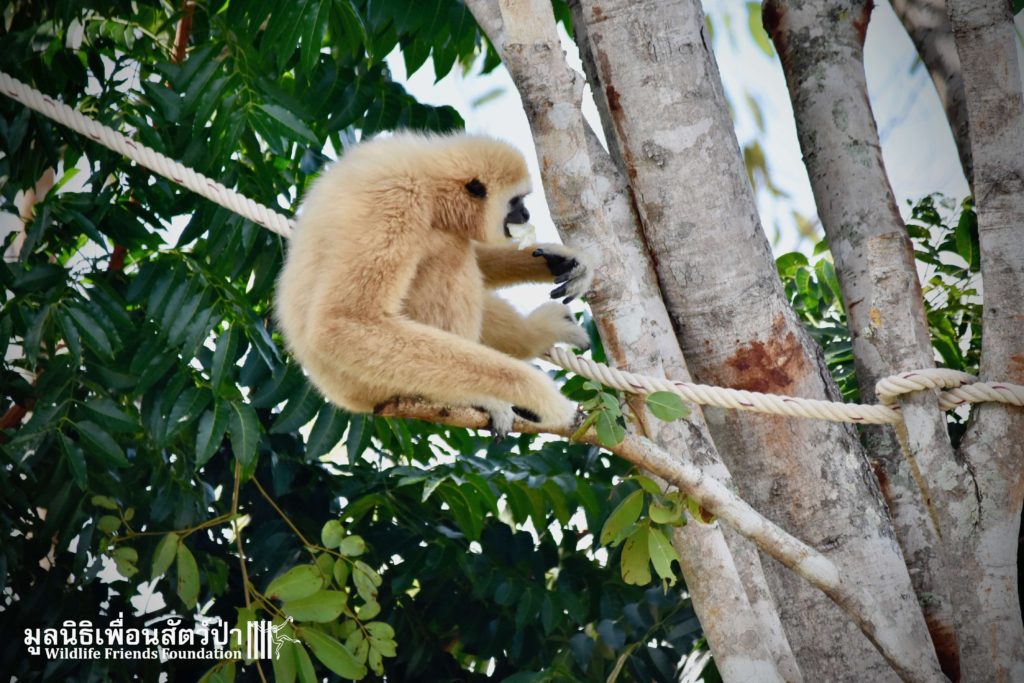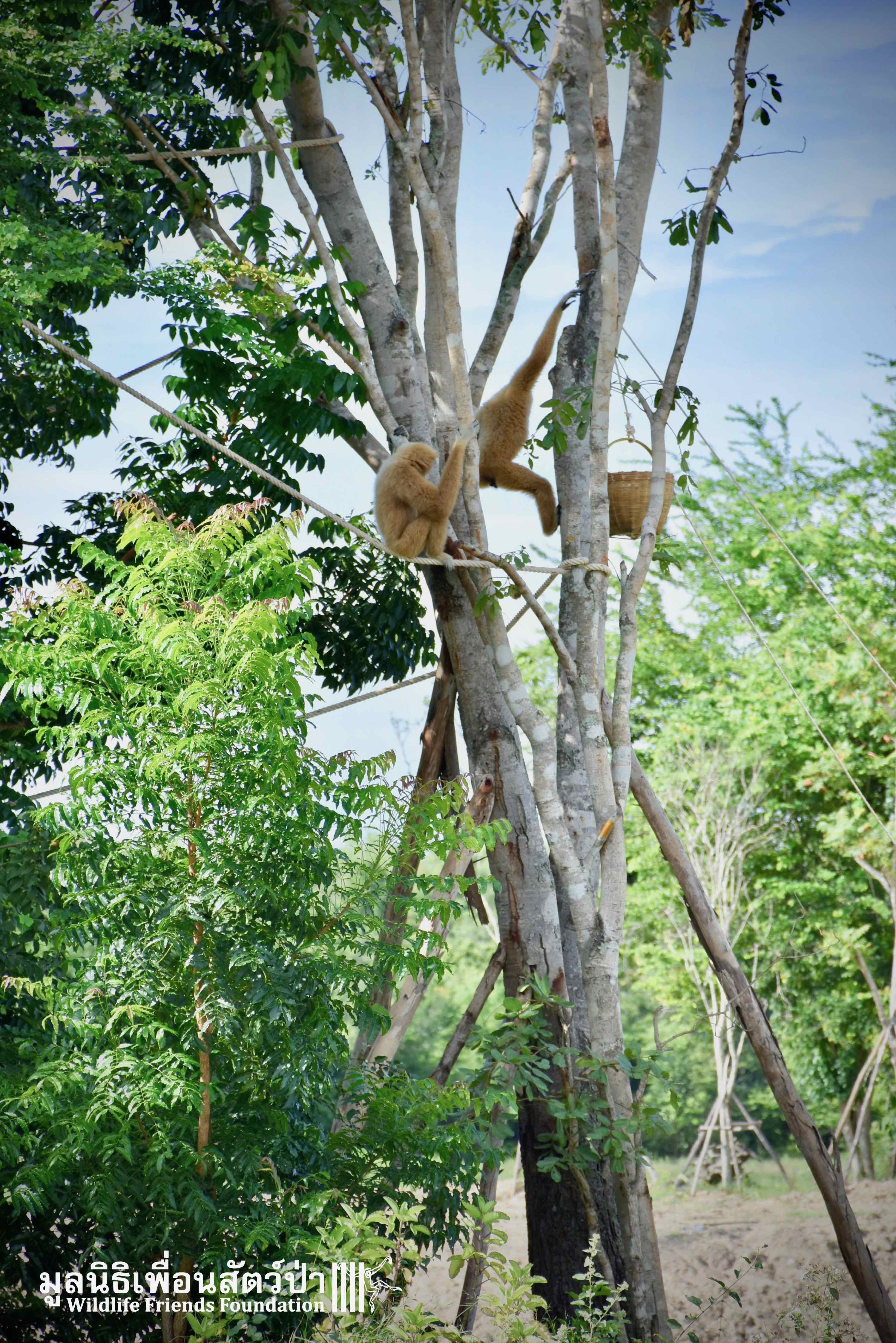 A few days ago, April, a 9 year old female white-handed gibbon who was rescued in 2009 (she has been brought at WFFT wildlife hospital by thai people who took her from market in Kanchanaburi, where she was apparently going to be eaten), and Whiskey, a 10 year old male white-handed gibbon rescued in 2009 too and who was kept as family pet, moved from their forest enclosure to a brand new Island in WFFT’s Project 4. What a joy to see them swinging, singing, eating, playing and just resting in their new home, next to Nemo’s island and with Malai Ngun, Chok Dee and Alicia (3 of our elephants) walking around.