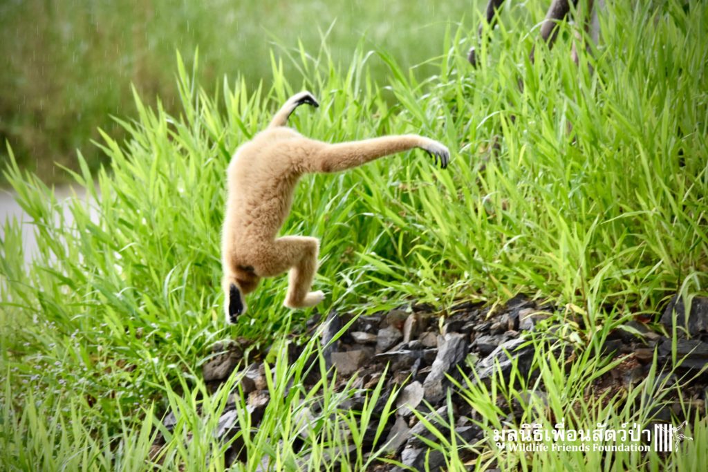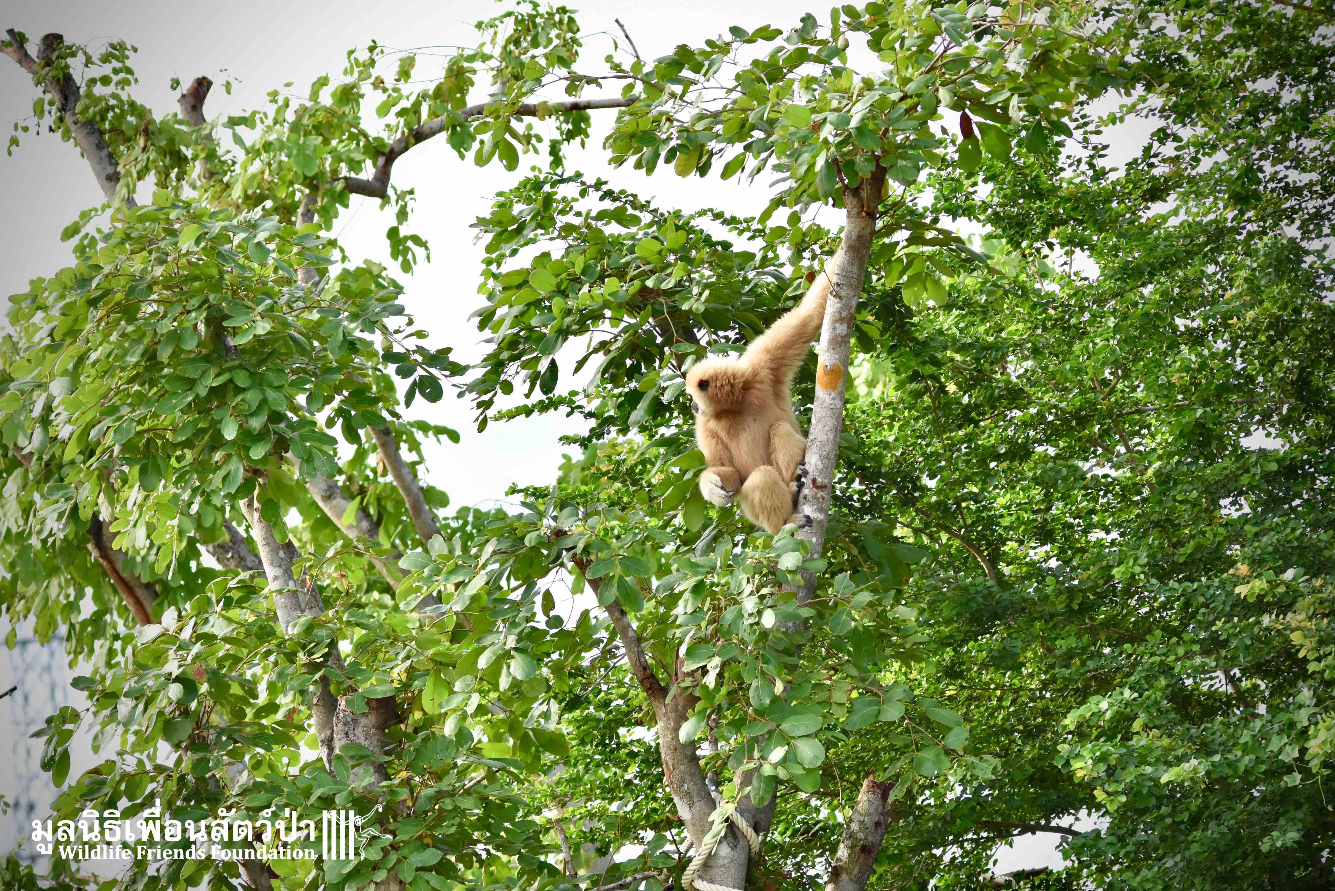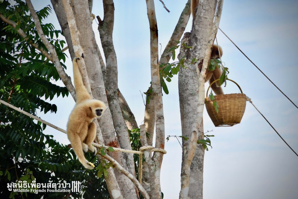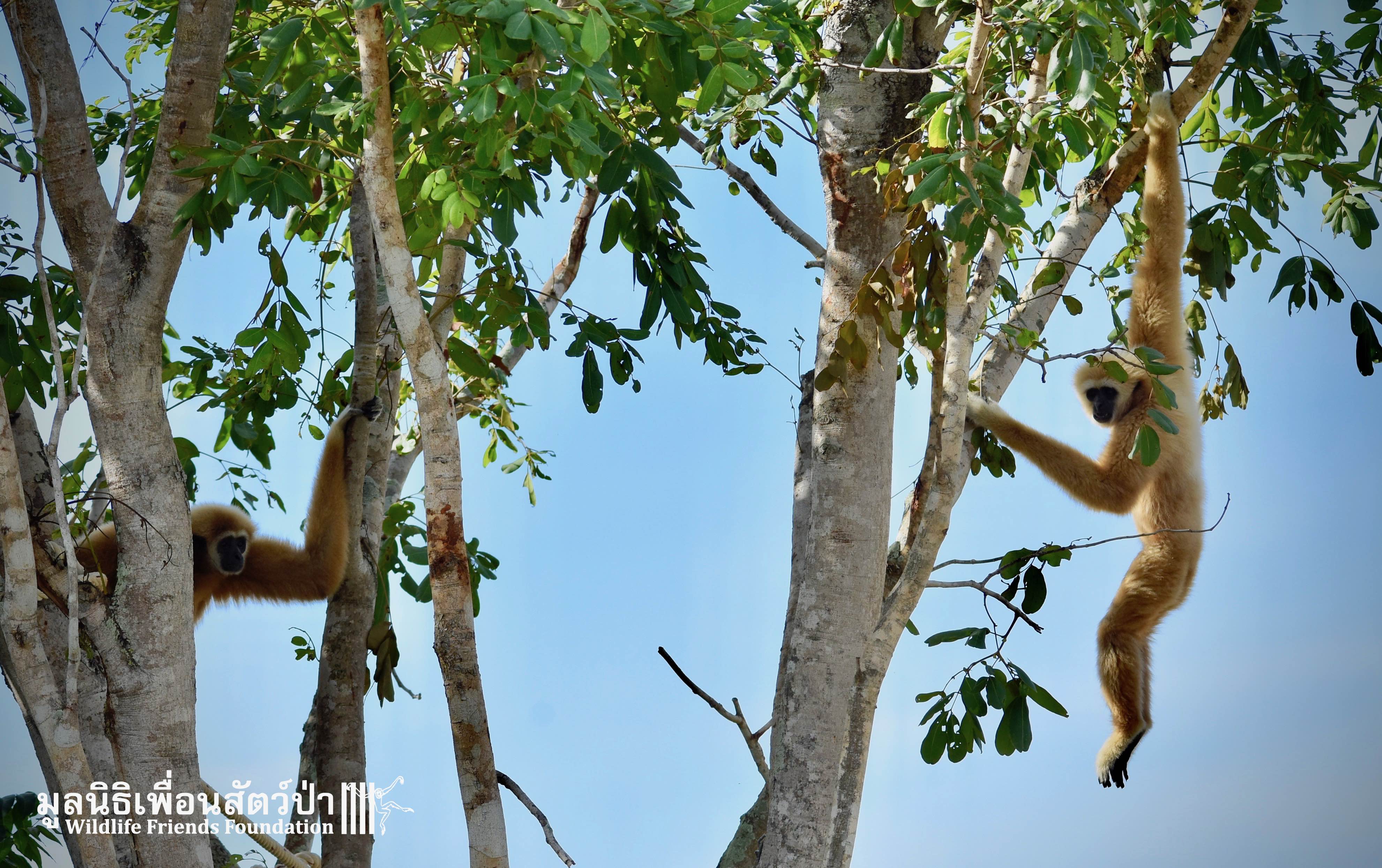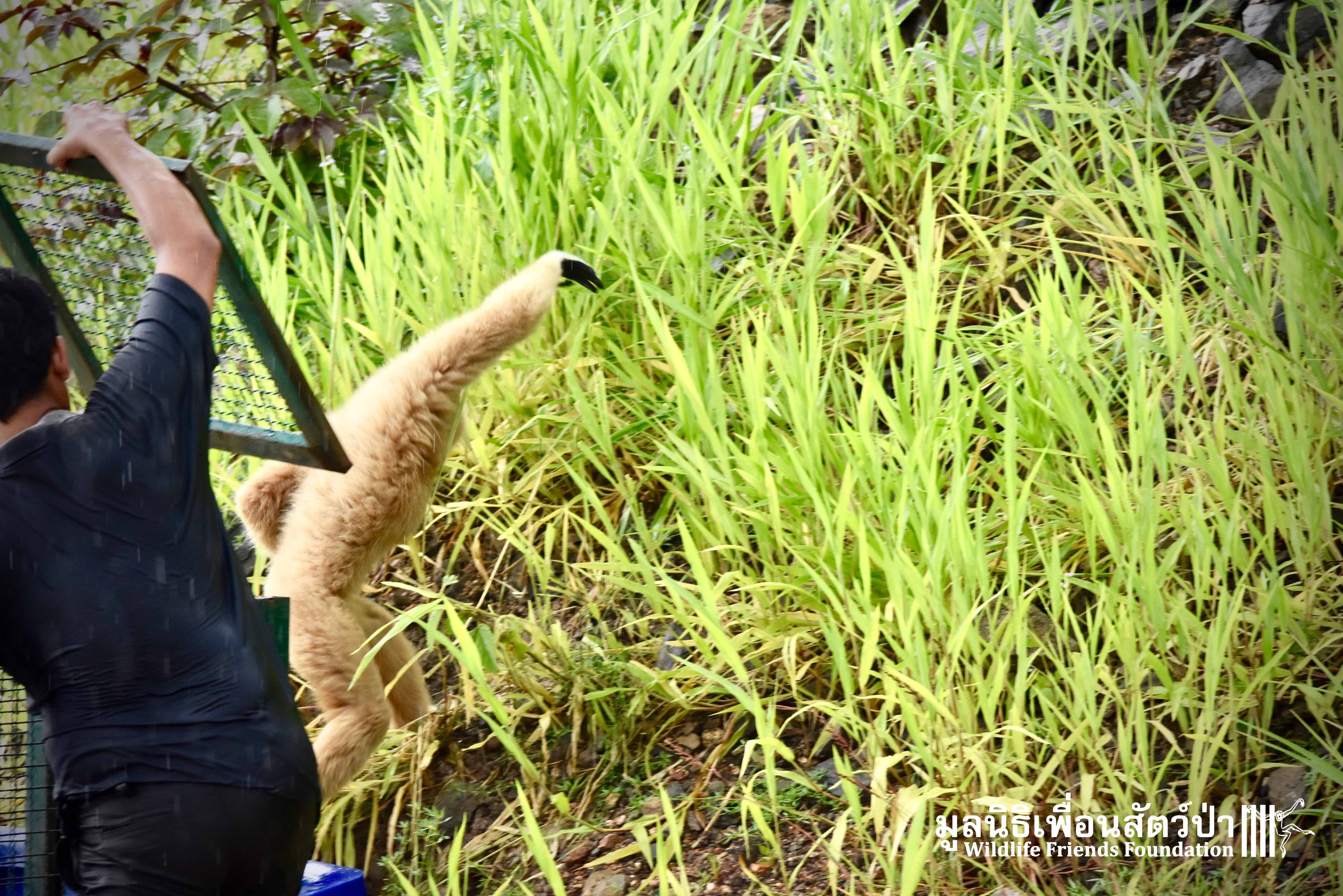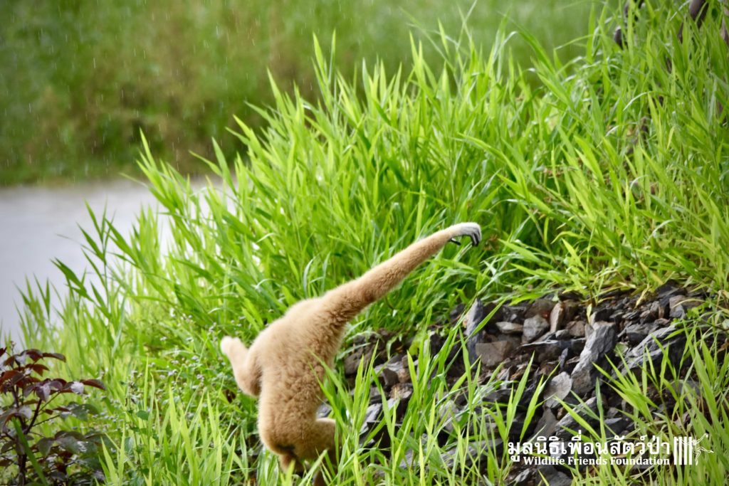 A few days ago, April, a 9 year old female white-handed gibbon who was rescued in 2009 (she has been brought at WFFT wildlife hospital by thai people who took her from market in Kanchanaburi, where she was apparently going to be eaten), and Whiskey, a 10 year old male white-handed gibbon rescued in 2009 too and who was kept as family pet, moved from their forest enclosure to a brand new Island in WFFT’s Project 4. What a joy to see them swinging, singing, eating, playing and just resting in their new home, next to Nemo’s island and with Malai Ngun, Chok Dee and Alicia (3 of our elephants) walking around.