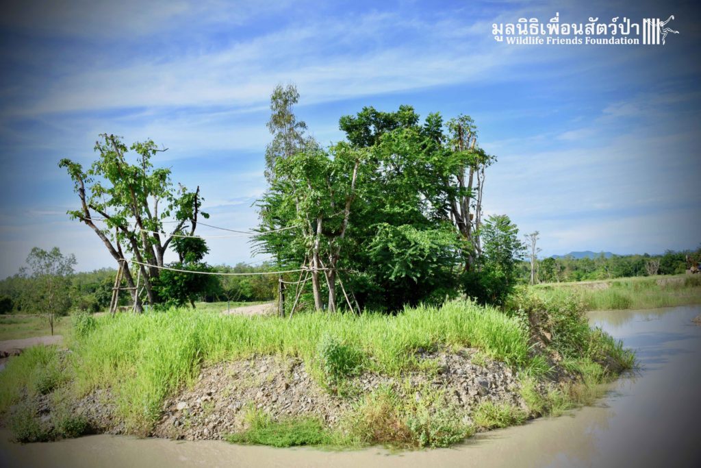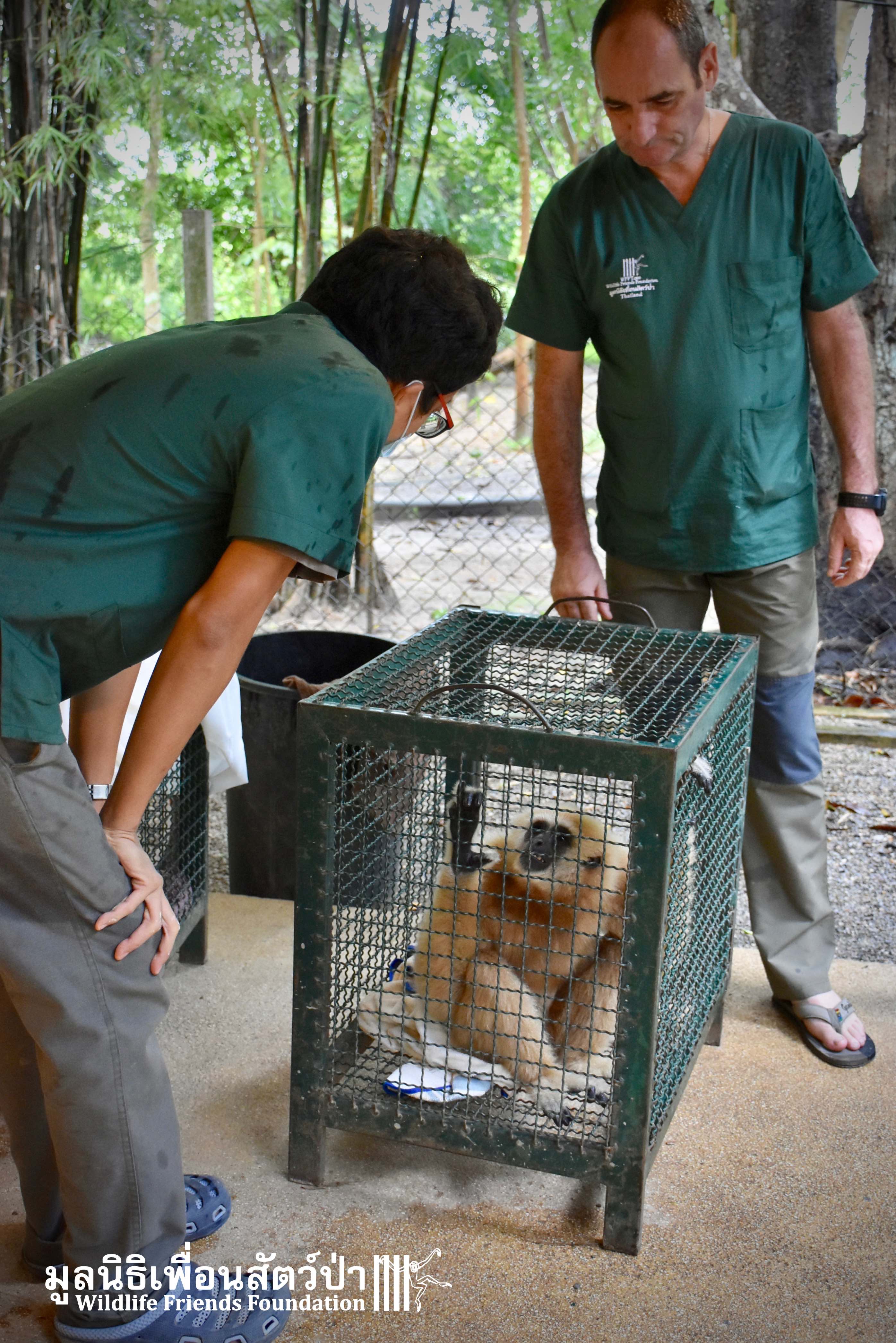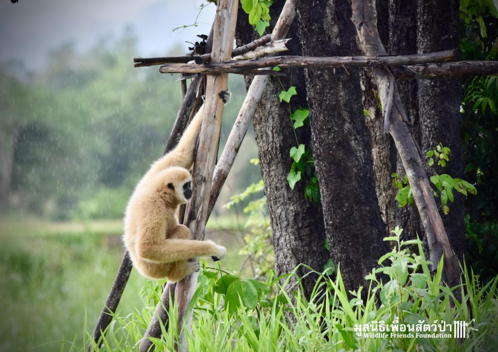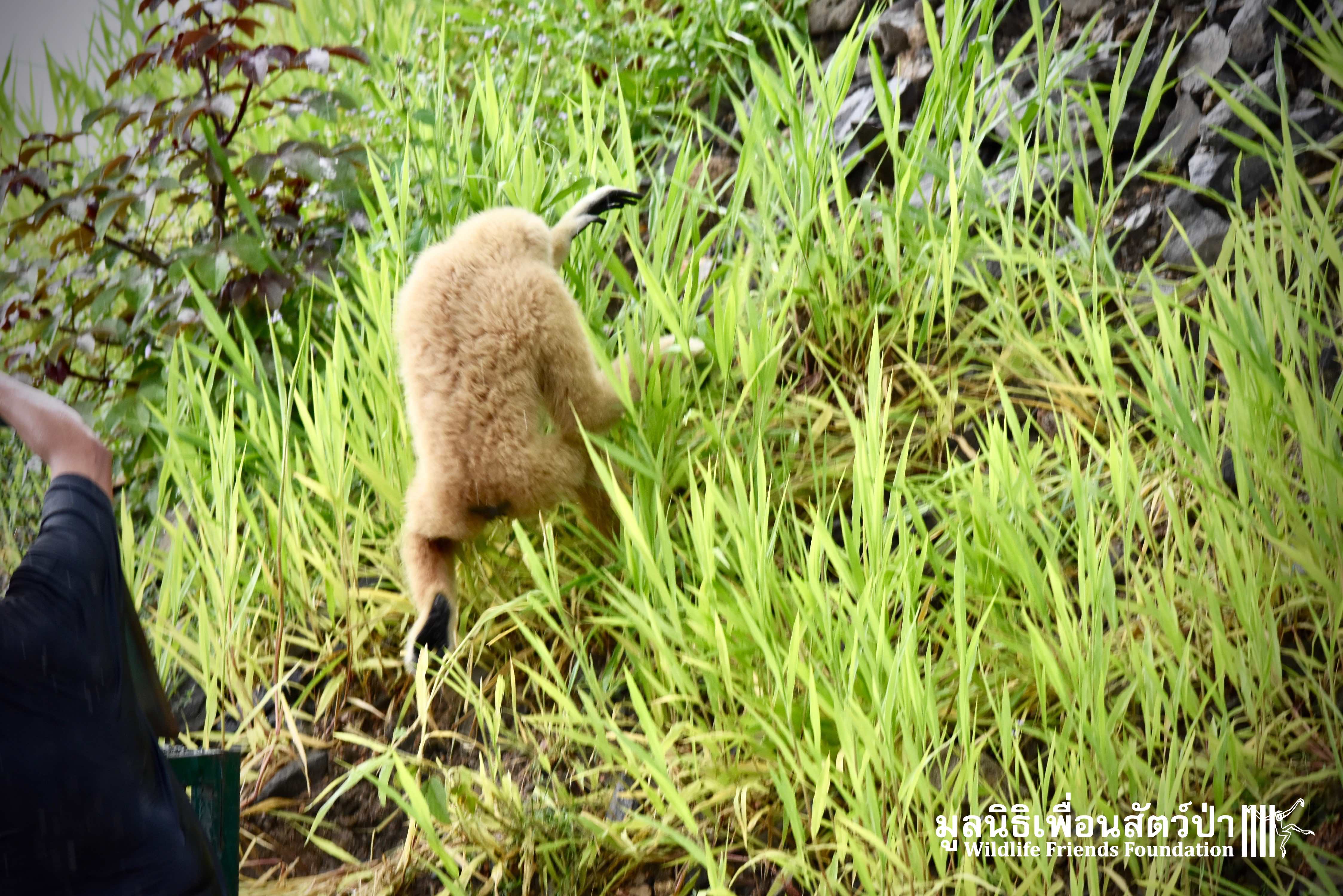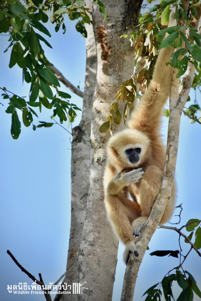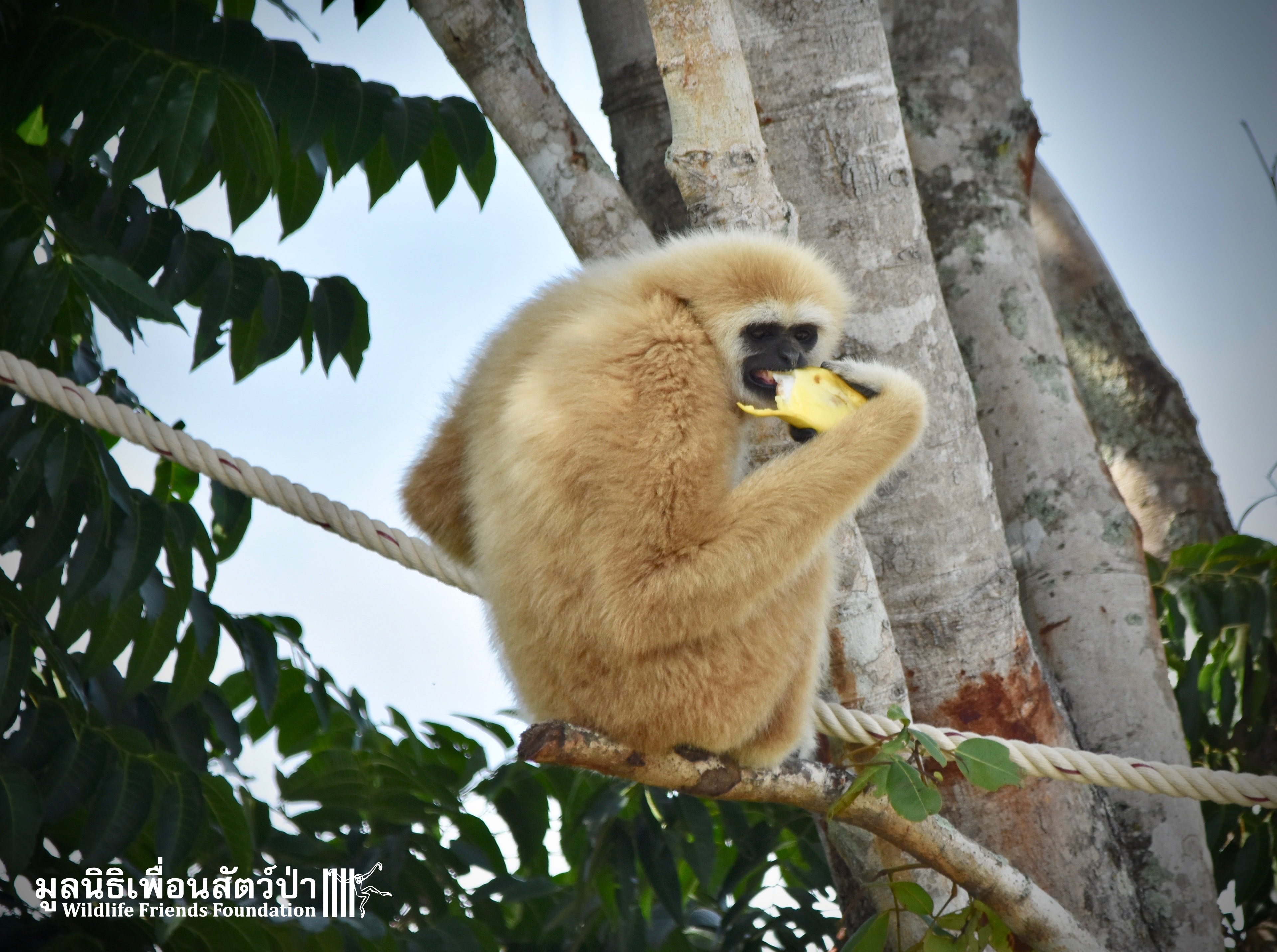 A few days ago, April, a 9 year old female white-handed gibbon who was rescued in 2009 (she has been brought at WFFT wildlife hospital by thai people who took her from market in Kanchanaburi, where she was apparently going to be eaten), and Whiskey, a 10 year old male white-handed gibbon rescued in 2009 too and who was kept as family pet, moved from their forest enclosure to a brand new Island in WFFT’s Project 4. What a joy to see them swinging, singing, eating, playing and just resting in their new home, next to Nemo’s island and with Malai Ngun, Chok Dee and Alicia (3 of our elephants) walking around.