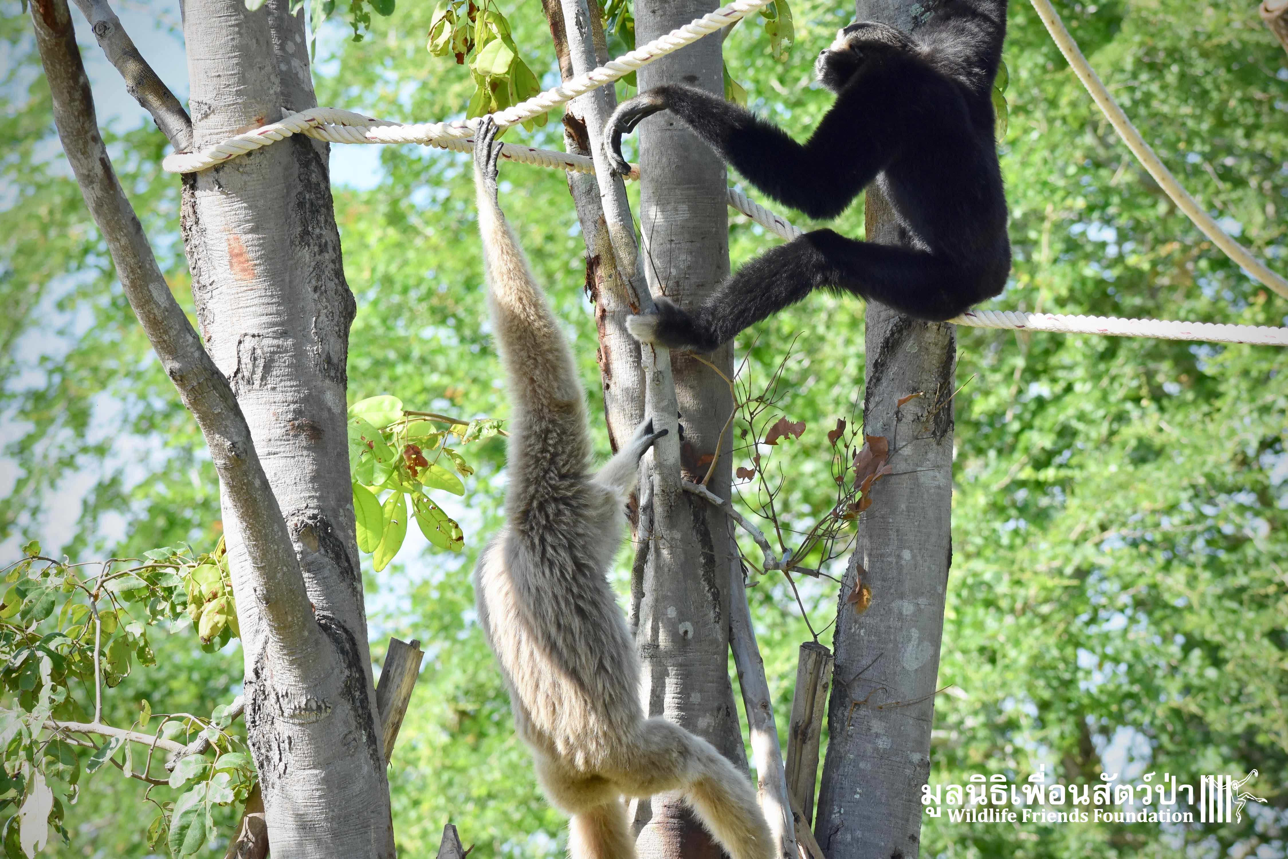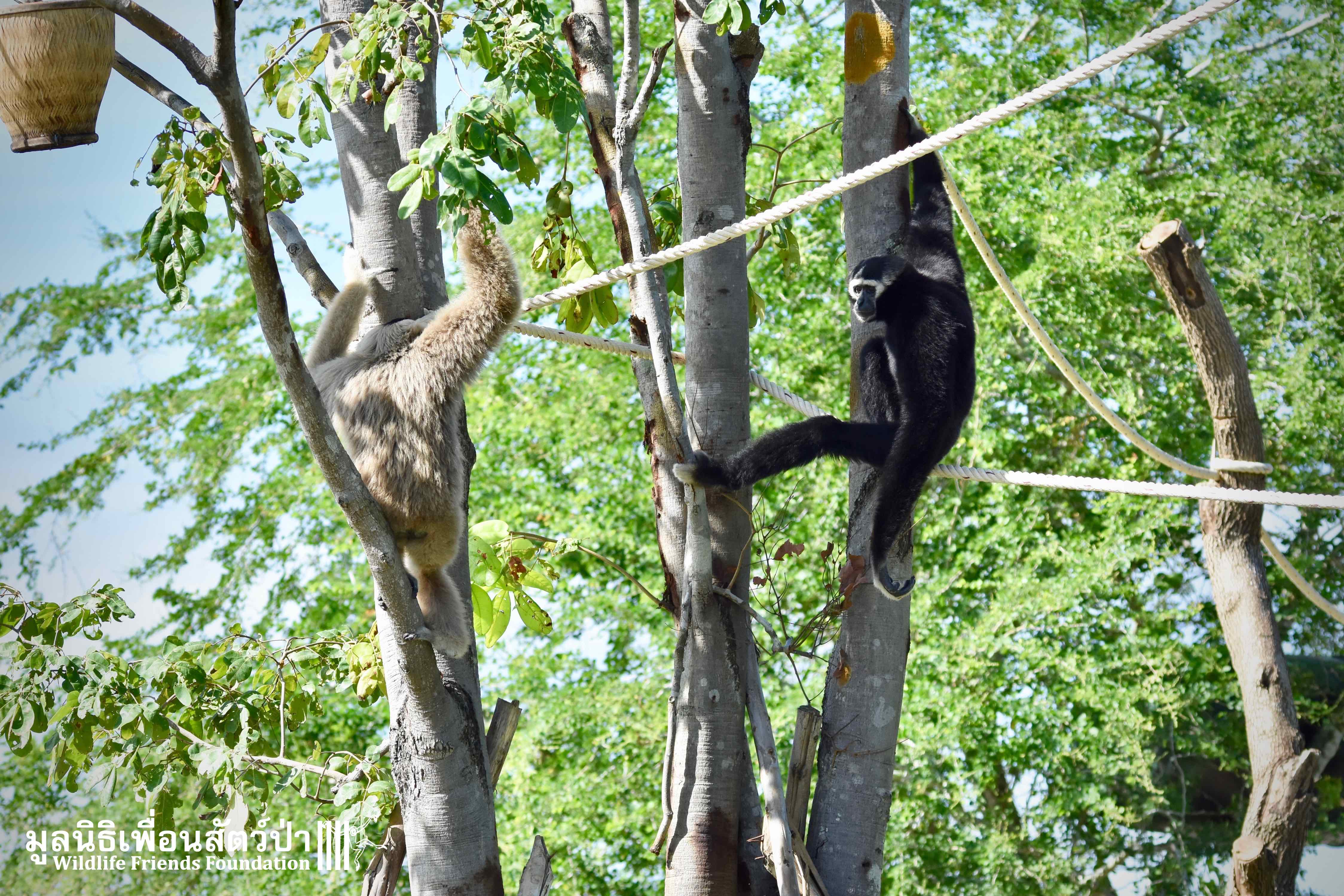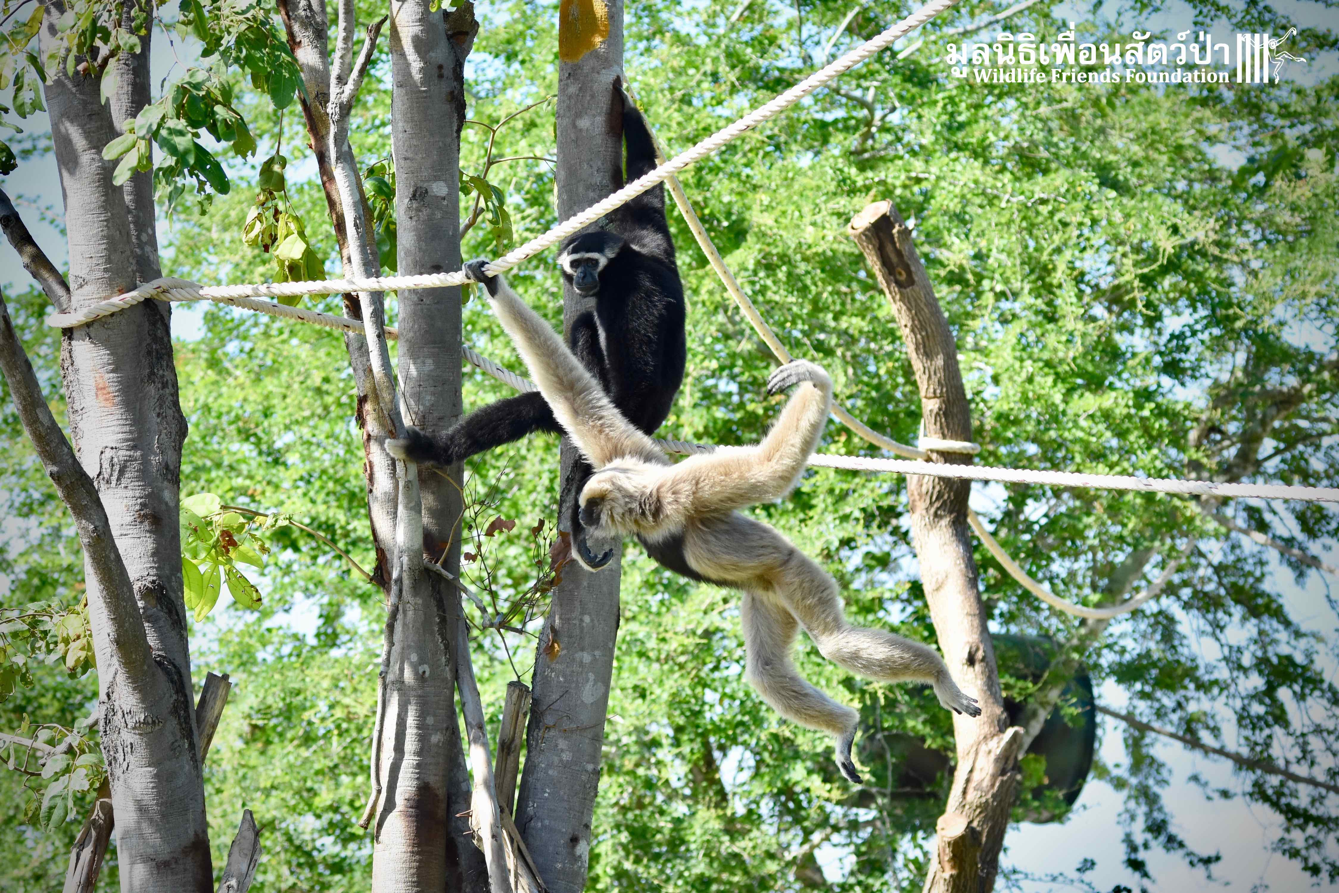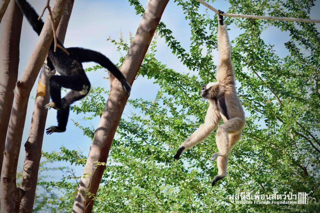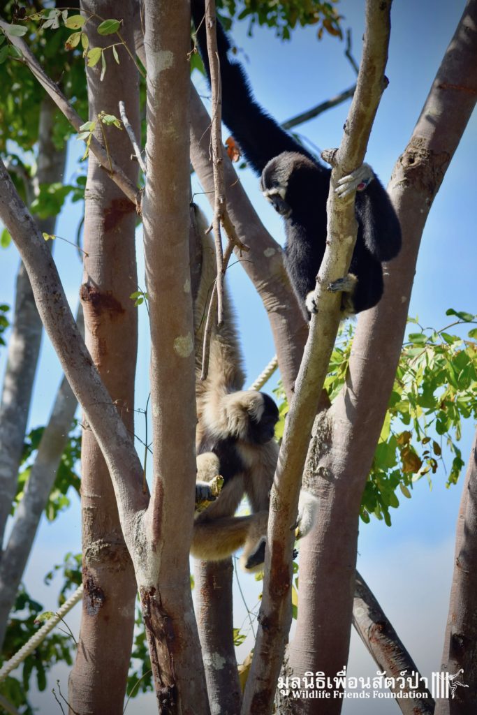 Last week a very special gibbon pair got a new home. ‘Dao’ (Star) is a female Pileated gibbon (Hylobates pileatus) who is 7 years old and who was rescued when she was 7 months old. She had been living as a pet for a few months before her owner realized that keeping a wild animal as a pet is not a good idea, as well as being illegal in Thailand. She has been raised by the WFFT Team until she got old enough to be independent. ‘Donkey’ is a 10-year-old male Pileated gibbon. He was rescued two years before Dao arrived at WFFT. Shortly after Dao’s arrival they were successfully introduced and have lived together ever since.