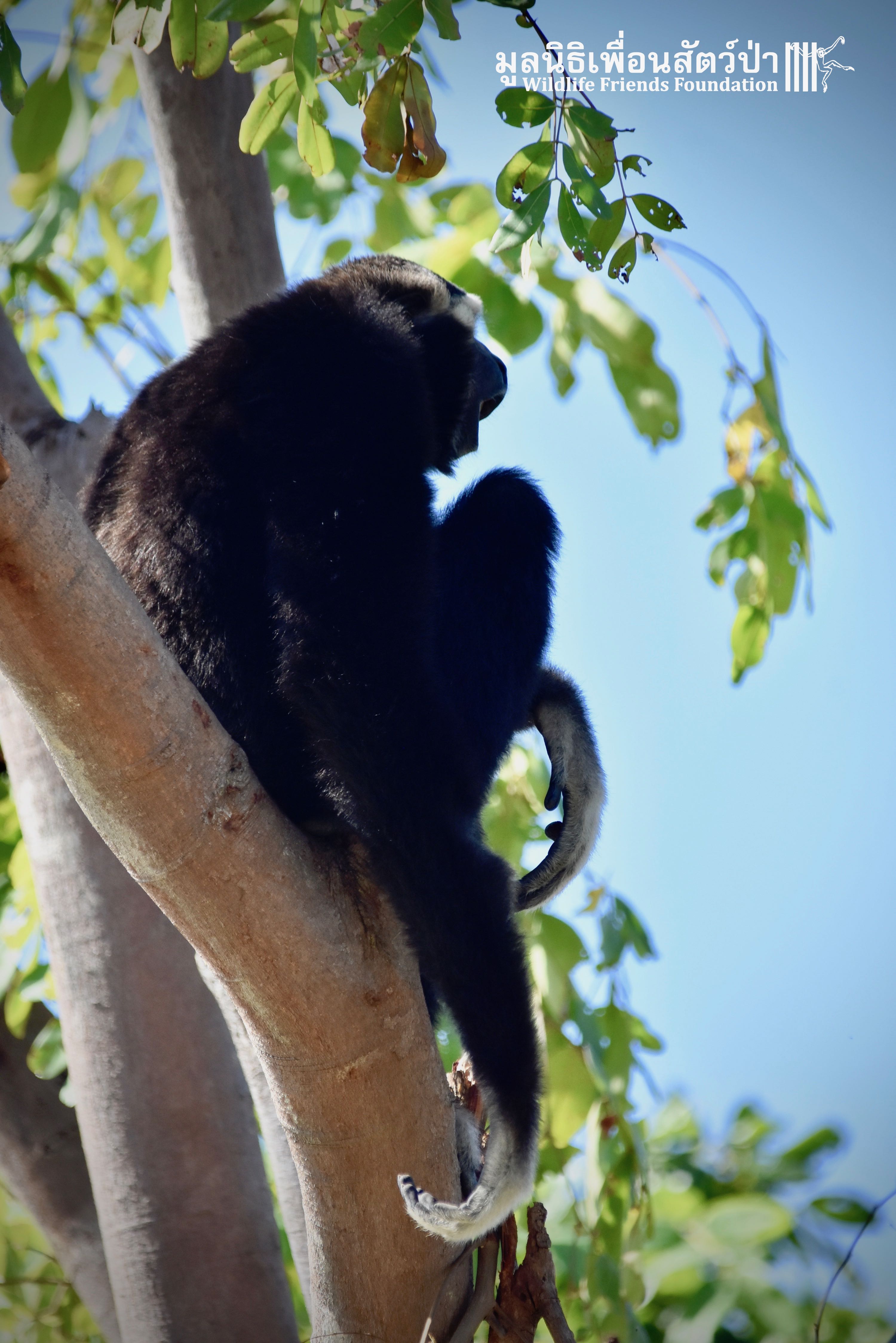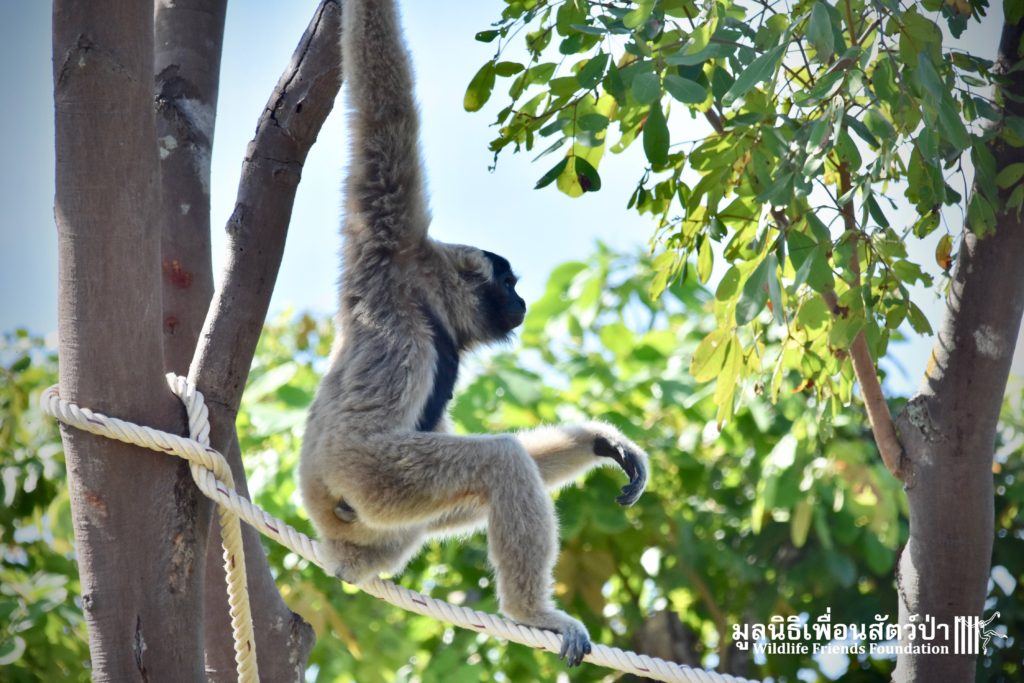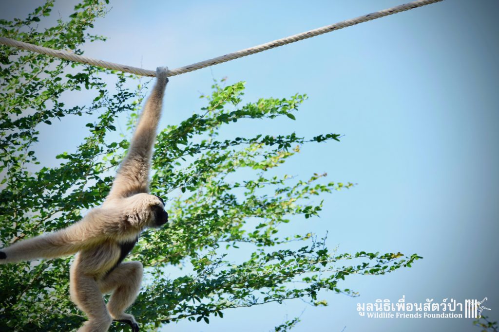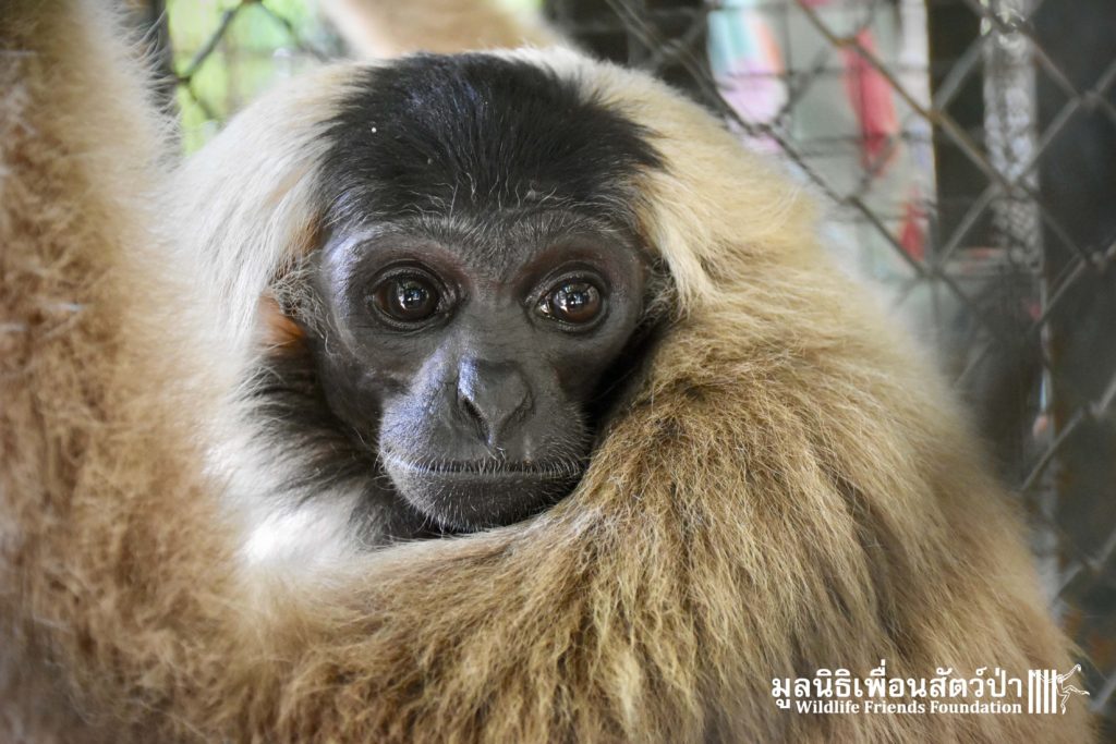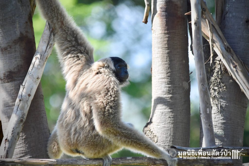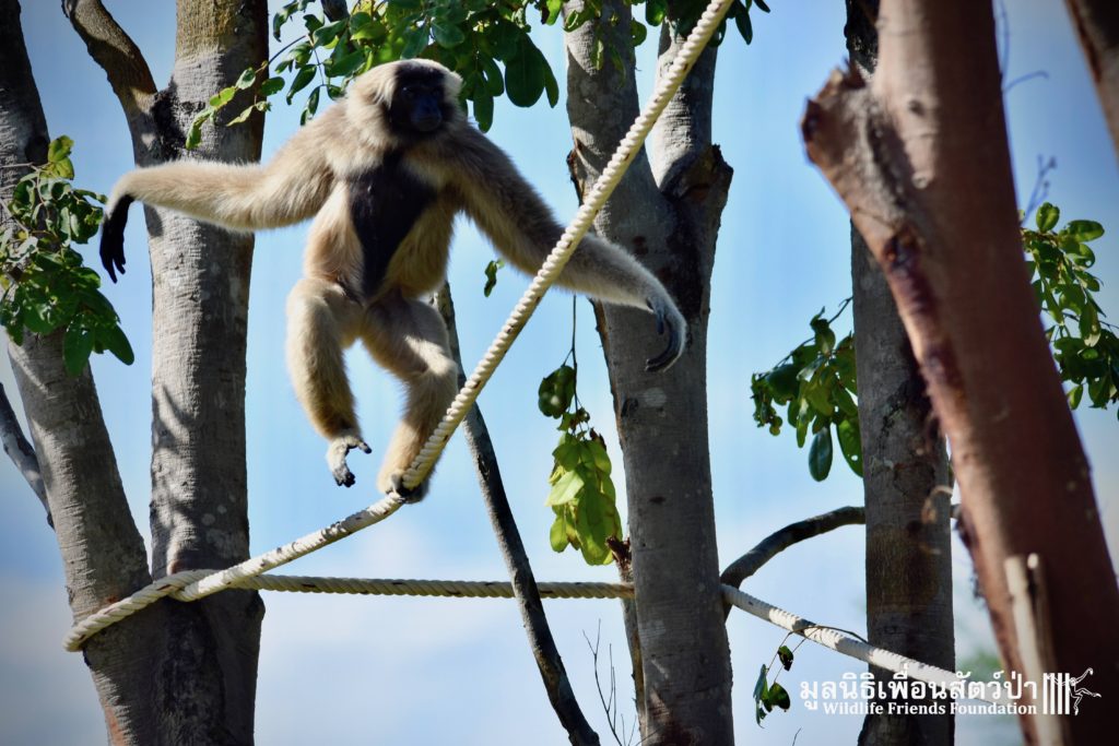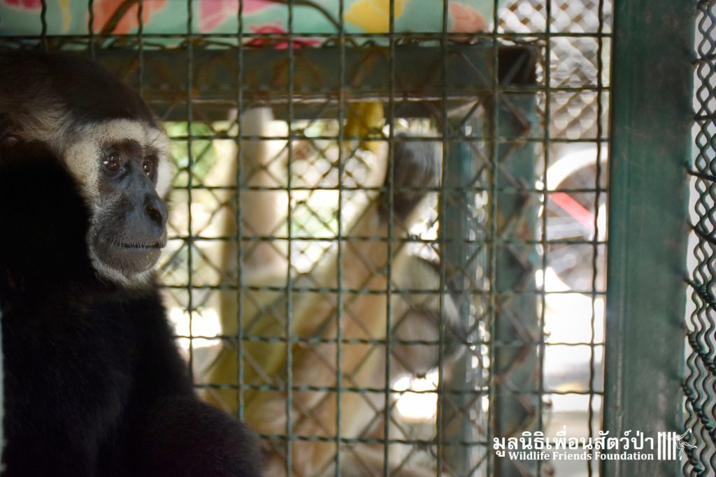 Last week a very special gibbon pair got a new home. ‘Dao’ (Star) is a female Pileated gibbon (Hylobates pileatus) who is 7 years old and who was rescued when she was 7 months old. She had been living as a pet for a few months before her owner realized that keeping a wild animal as a pet is not a good idea, as well as being illegal in Thailand. She has been raised by the WFFT Team until she got old enough to be independent. ‘Donkey’ is a 10-year-old male Pileated gibbon. He was rescued two years before Dao arrived at WFFT. Shortly after Dao’s arrival they were successfully introduced and have lived together ever since.