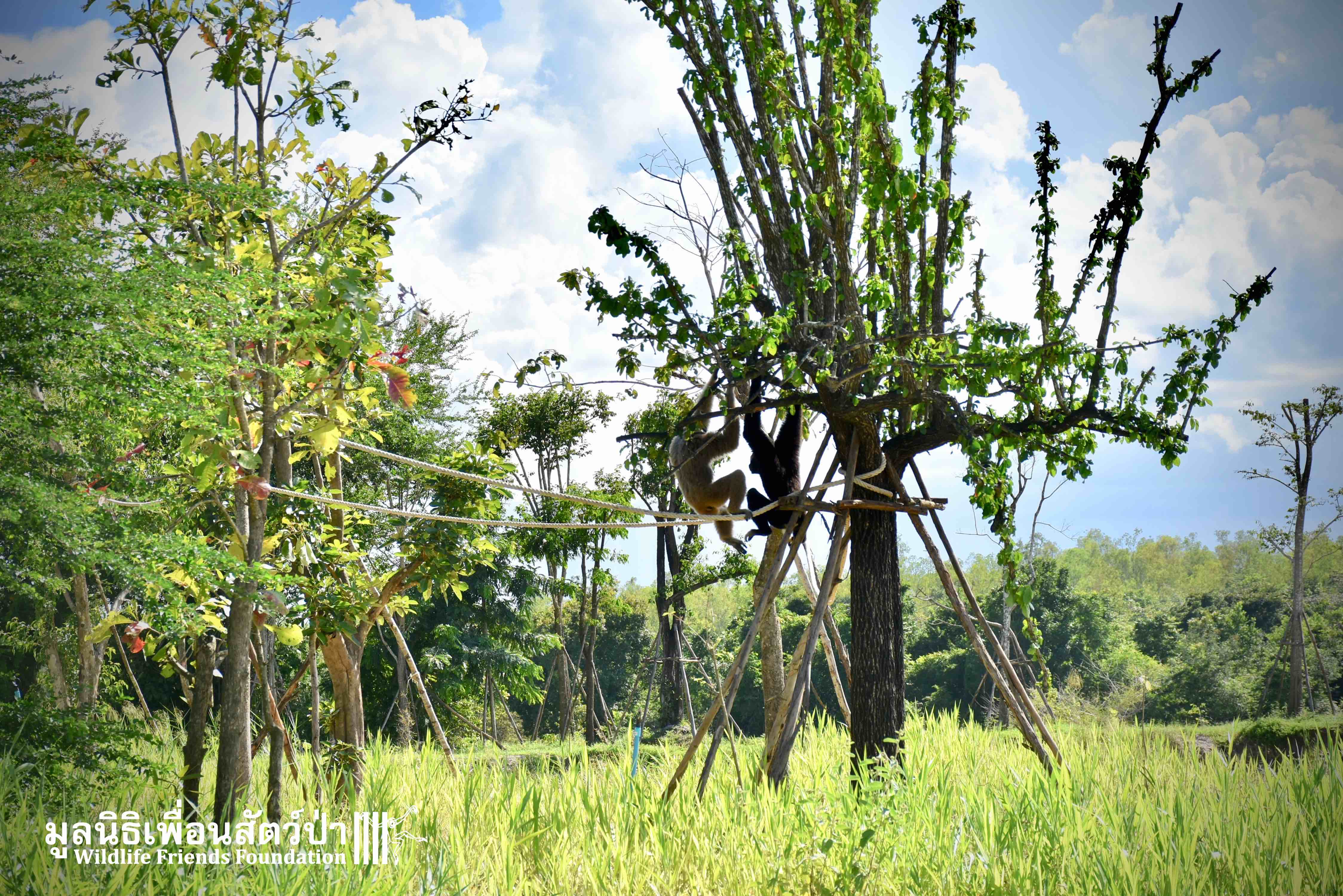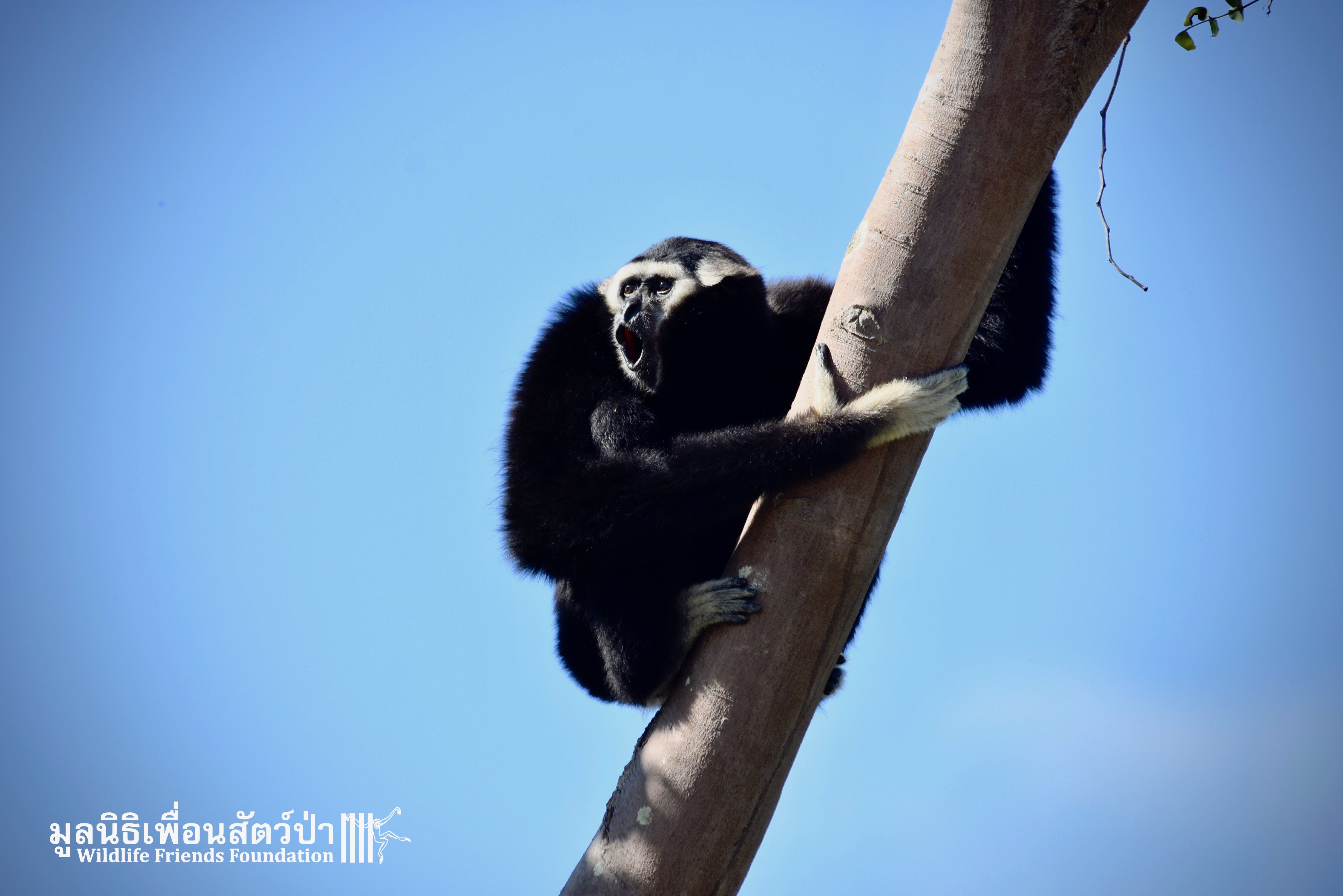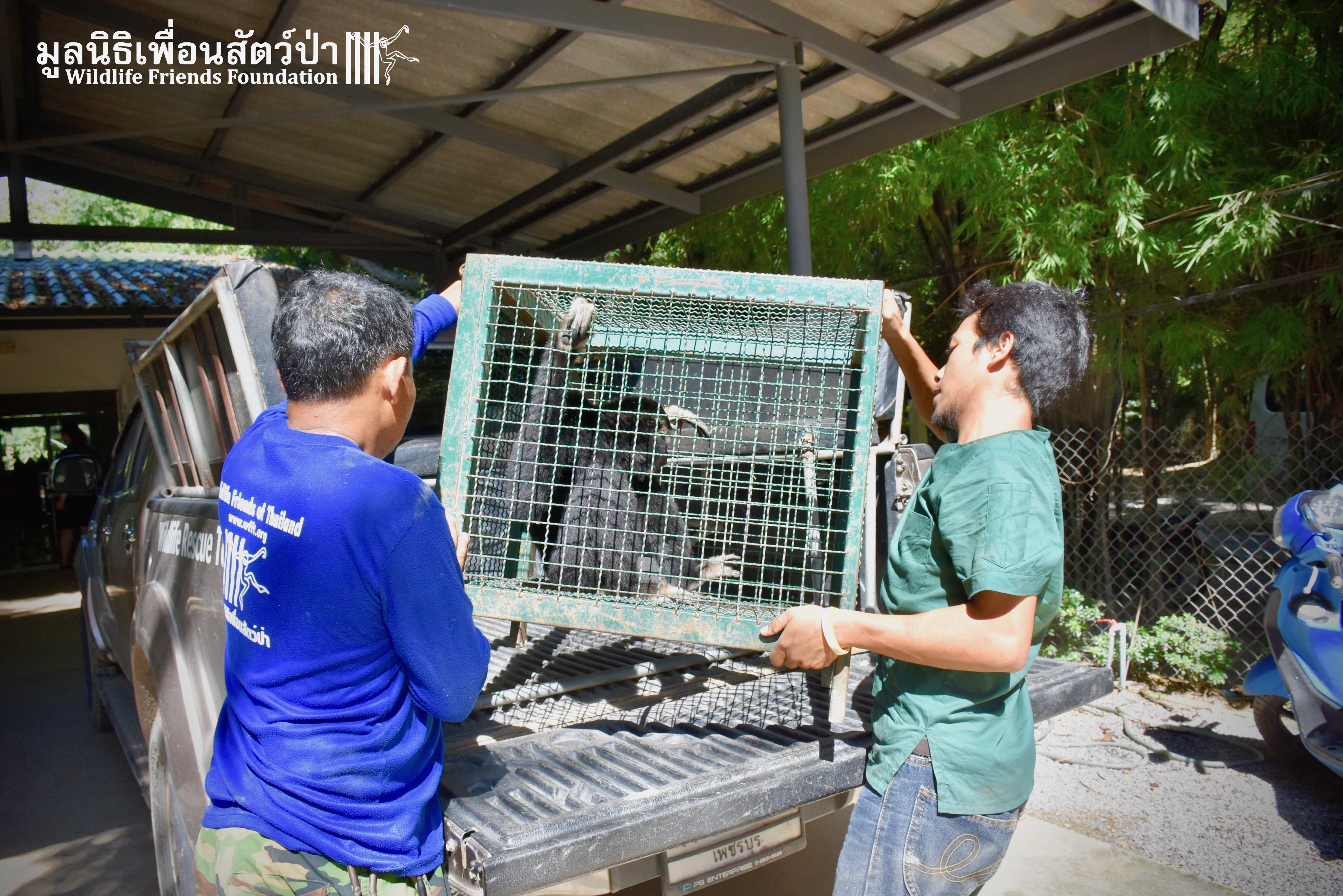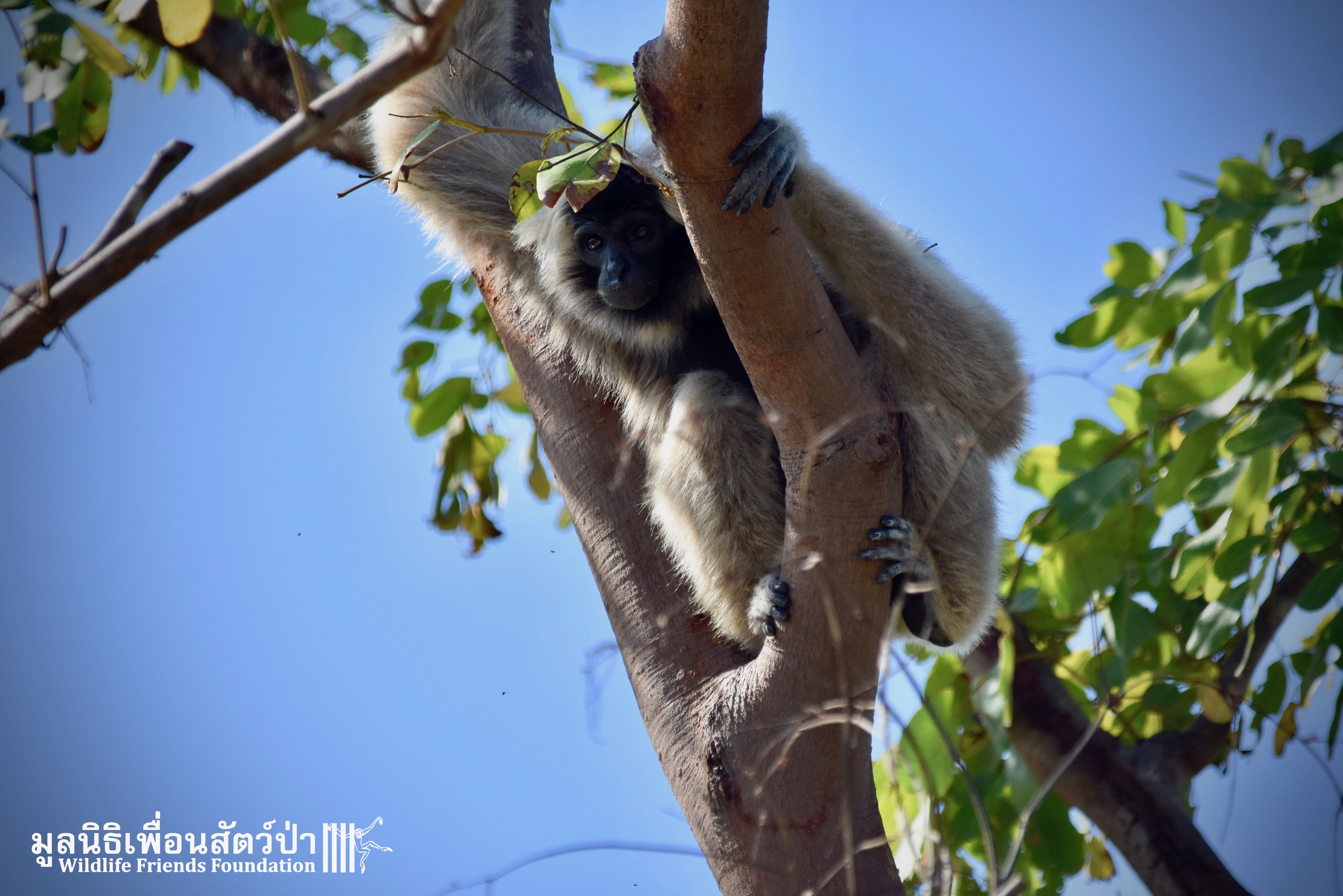 Last week a very special gibbon pair got a new home. ‘Dao’ (Star) is a female Pileated gibbon (Hylobates pileatus) who is 7 years old and who was rescued when she was 7 months old. She had been living as a pet for a few months before her owner realized that keeping a wild animal as a pet is not a good idea, as well as being illegal in Thailand. She has been raised by the WFFT Team until she got old enough to be independent. ‘Donkey’ is a 10-year-old male Pileated gibbon. He was rescued two years before Dao arrived at WFFT. Shortly after Dao’s arrival they were successfully introduced and have lived together ever since.