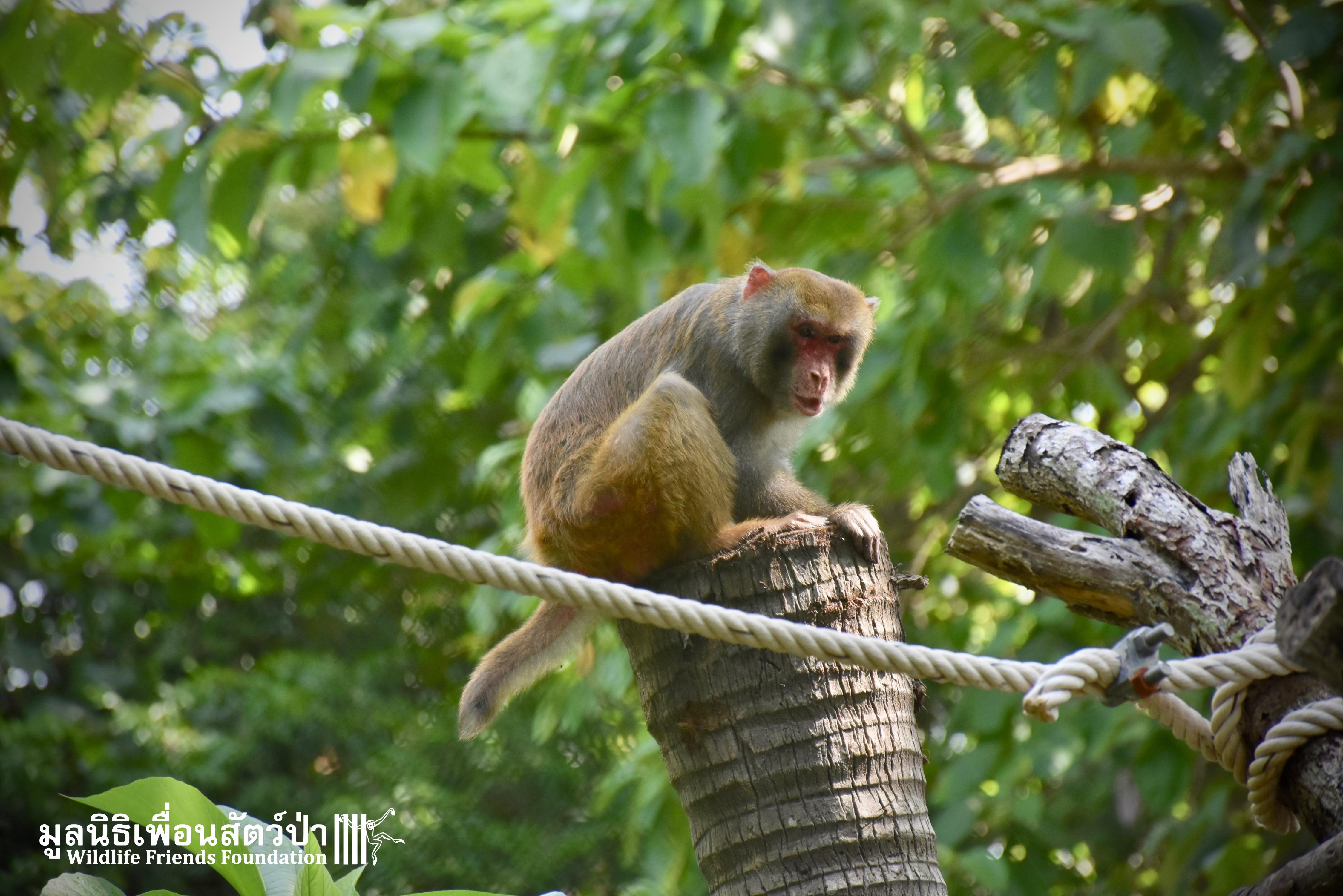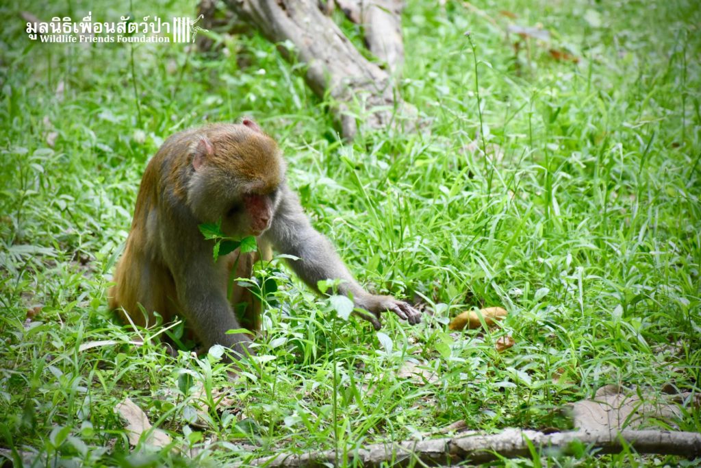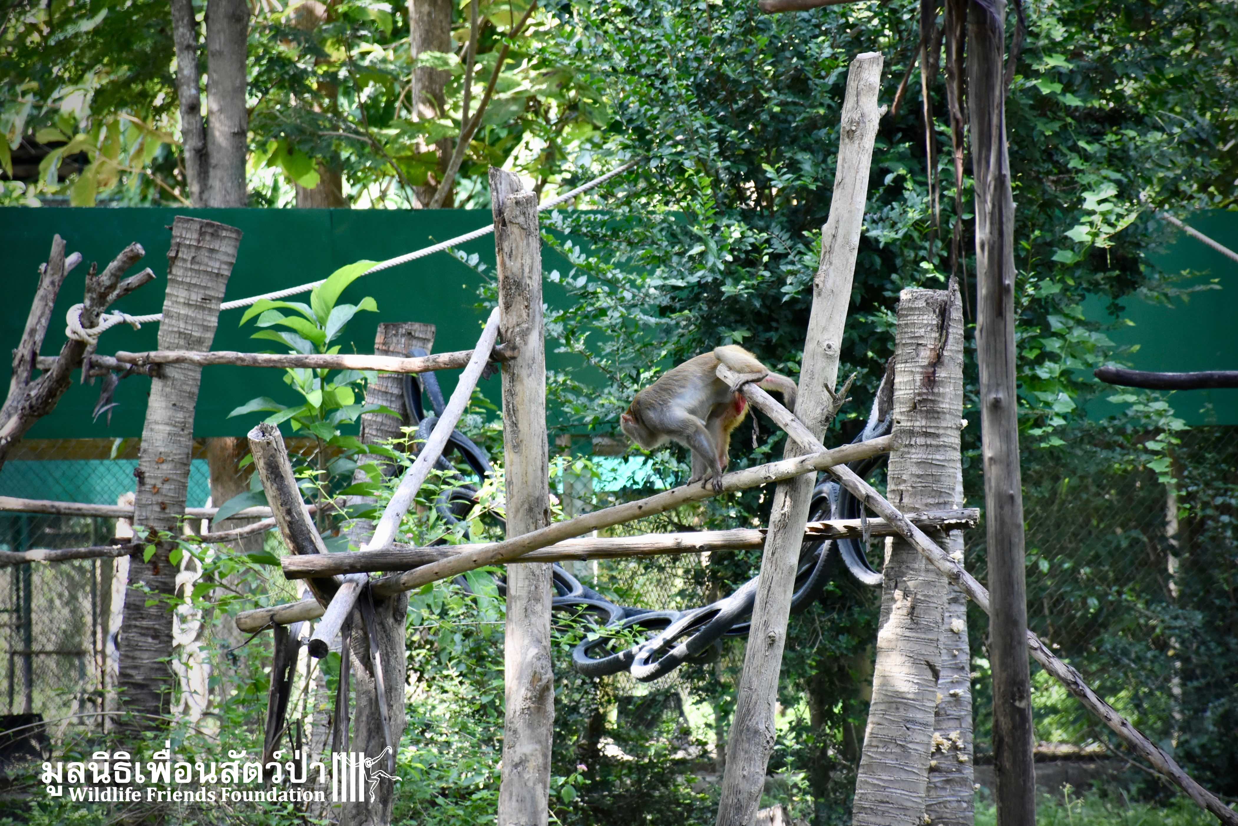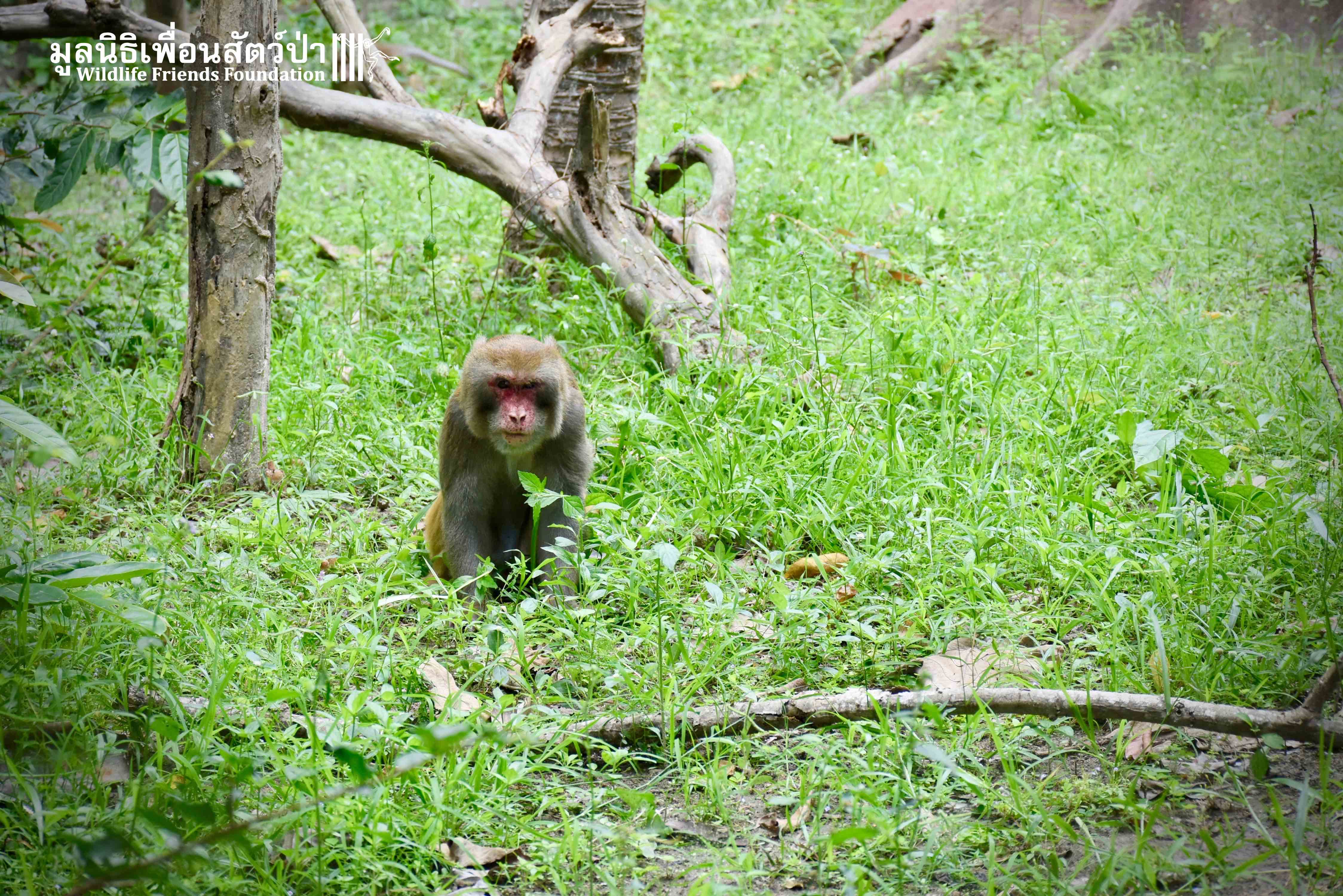 Last week, after spending some time in a side enclosure next to our old lady field, Joe was allowed into into the field with 3 other elderly macaques, Rose, Wan Jai and Jaw. It has taken some time to teach this old guy how to be a macaque again, as you can see from the pictures, Joe is doing great considering his past life.