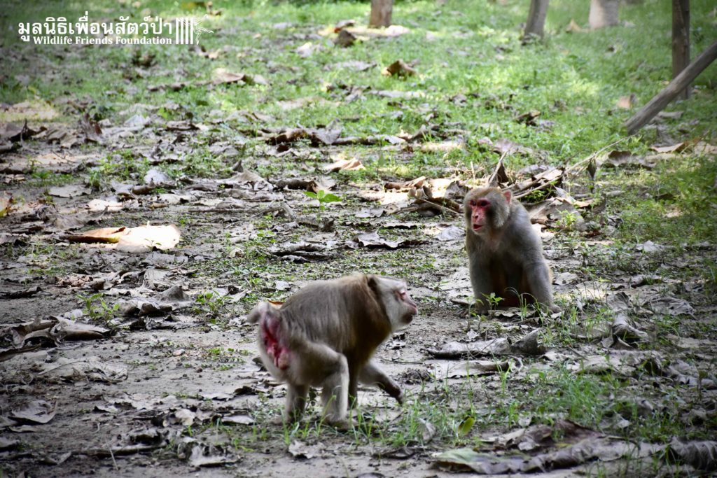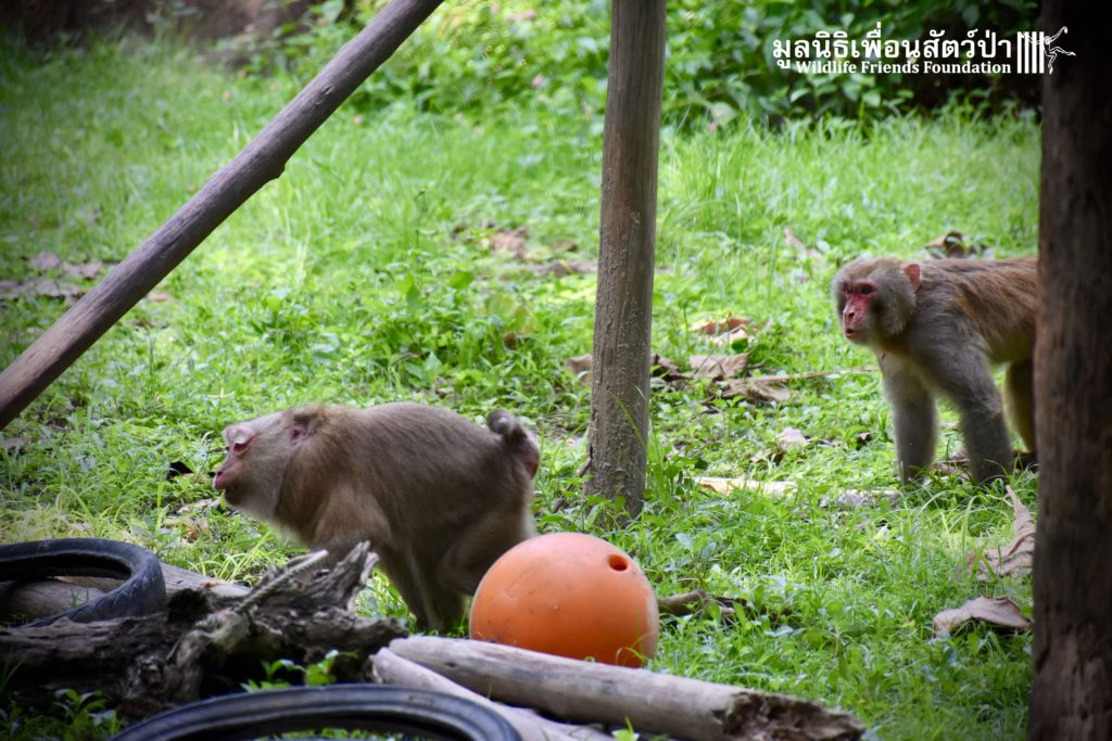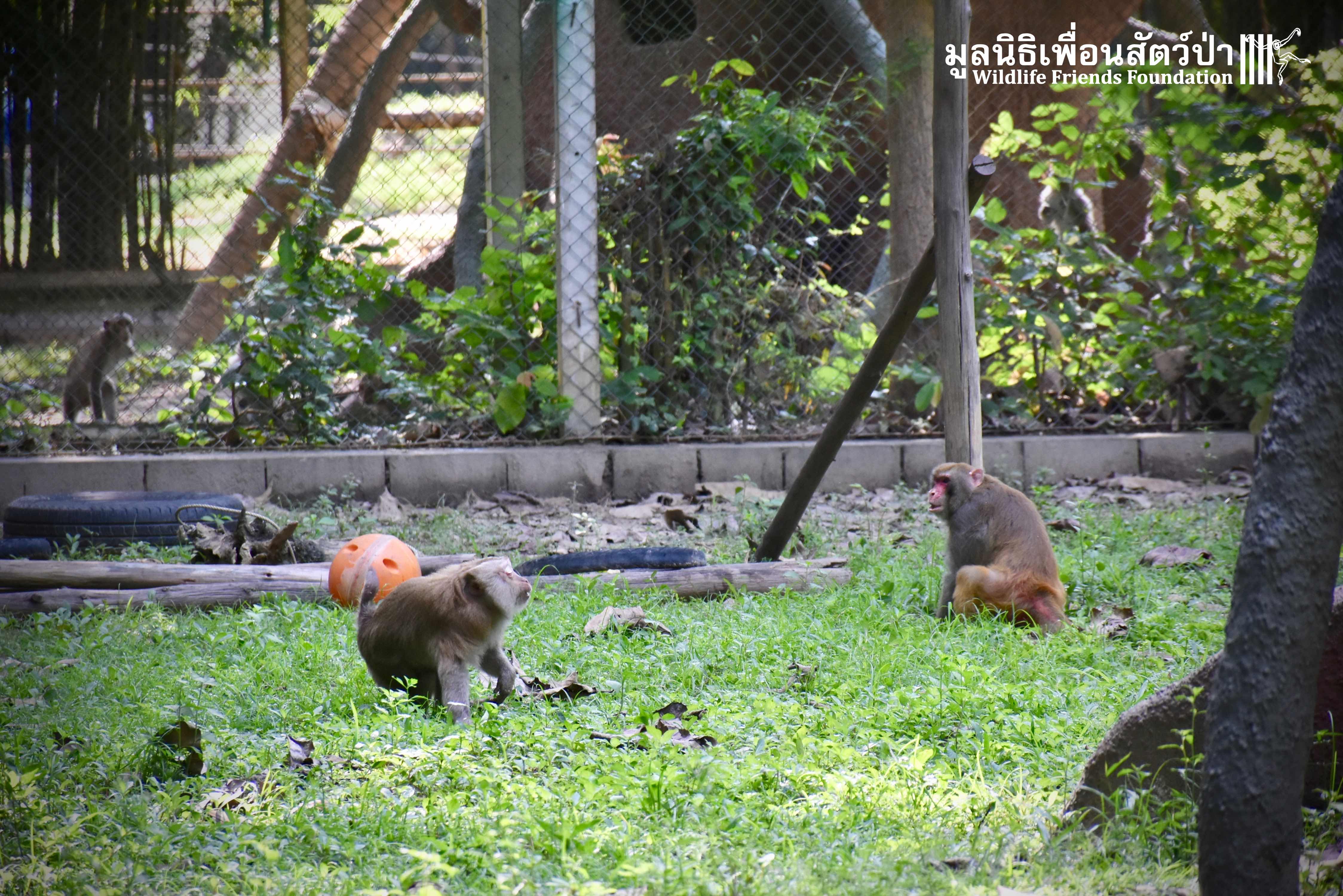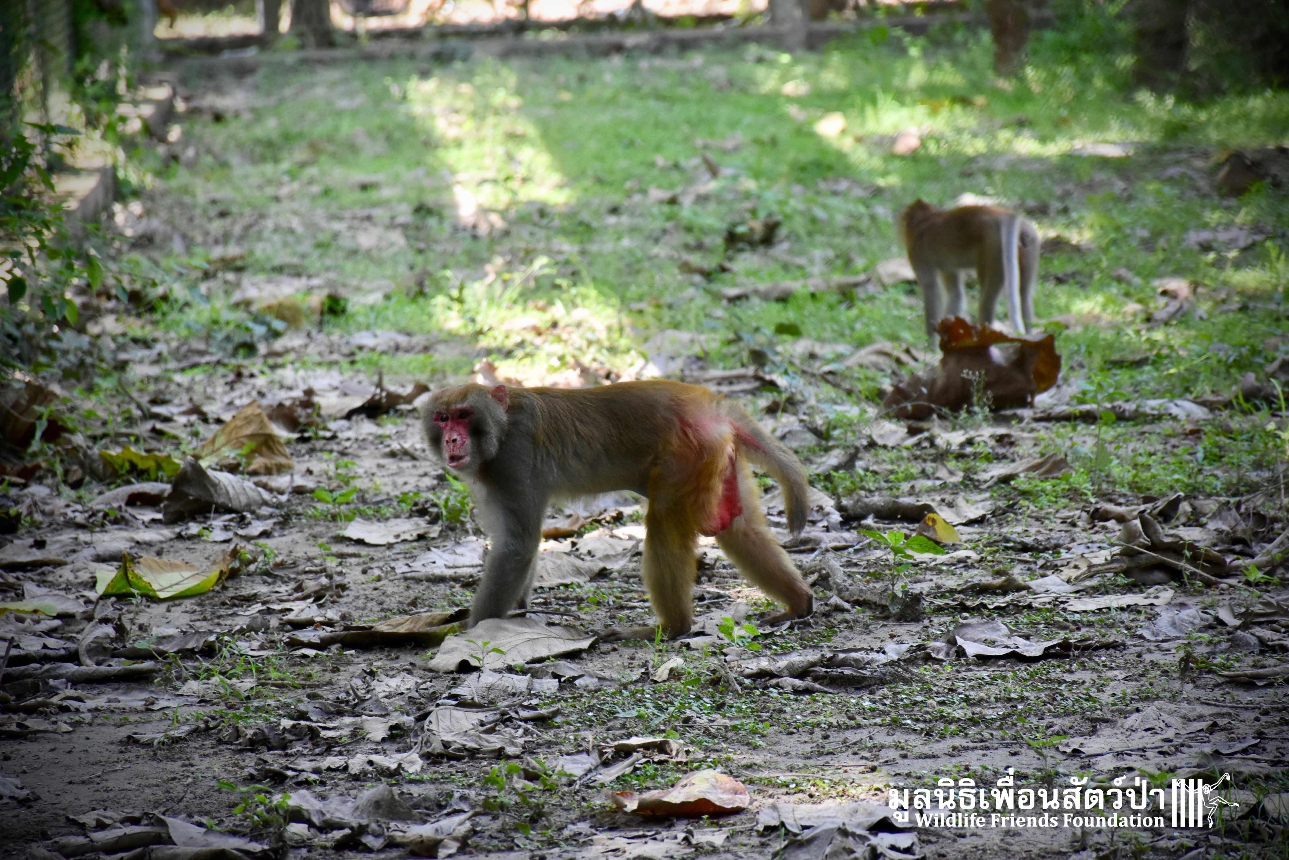 Last week, after spending some time in a side enclosure next to our old lady field, Joe was allowed into into the field with 3 other elderly macaques, Rose, Wan Jai and Jaw. It has taken some time to teach this old guy how to be a macaque again, as you can see from the pictures, Joe is doing great considering his past life.