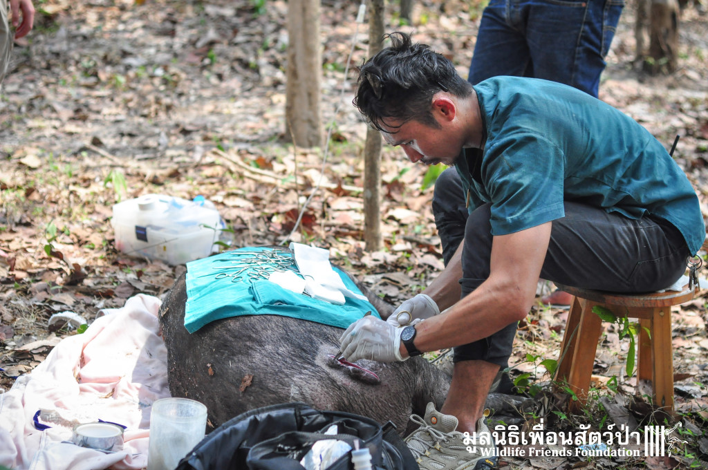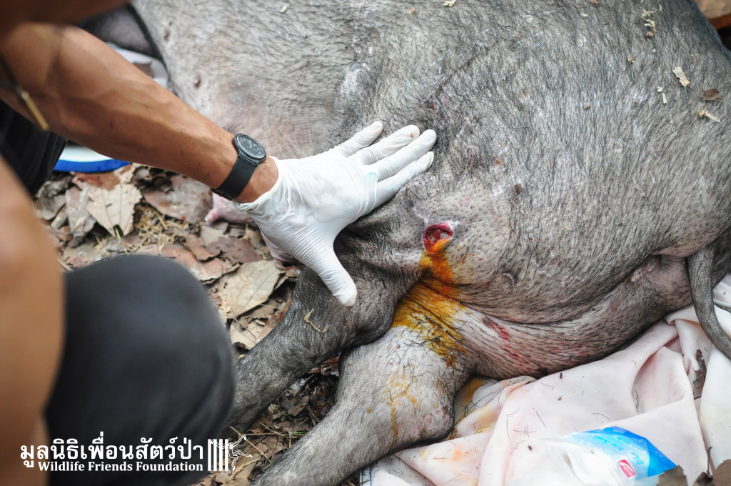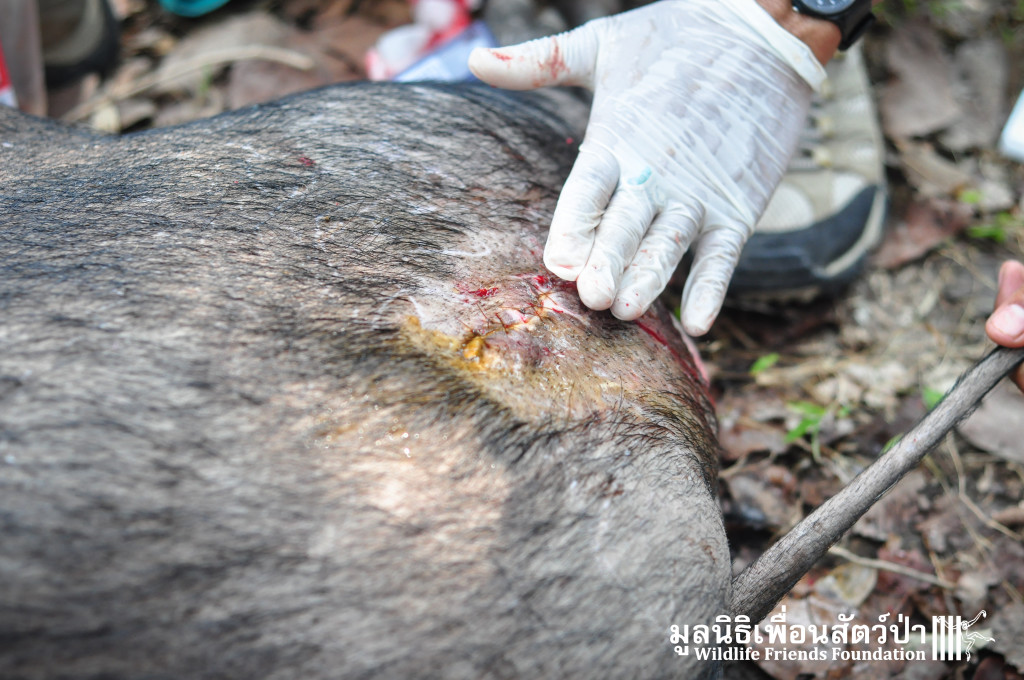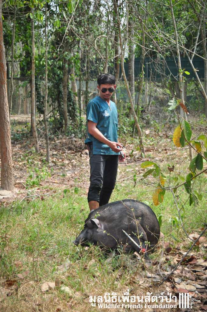 Last week we rescued a family of wild pigs from central Bangkok. The adult female pig who has now been named ‘Bussaba’ which means flower in English, she had numerous injuries which required veterinary treatment, so the day after her arrival the WFFT Vet Team sedated her and treated her numerous injuries. Along with her piglets she is now settled well into her large opne field enclosure at the WFFT Wildlife Rescue Centre. See the rescue story here bit.ly/1UyRCWI